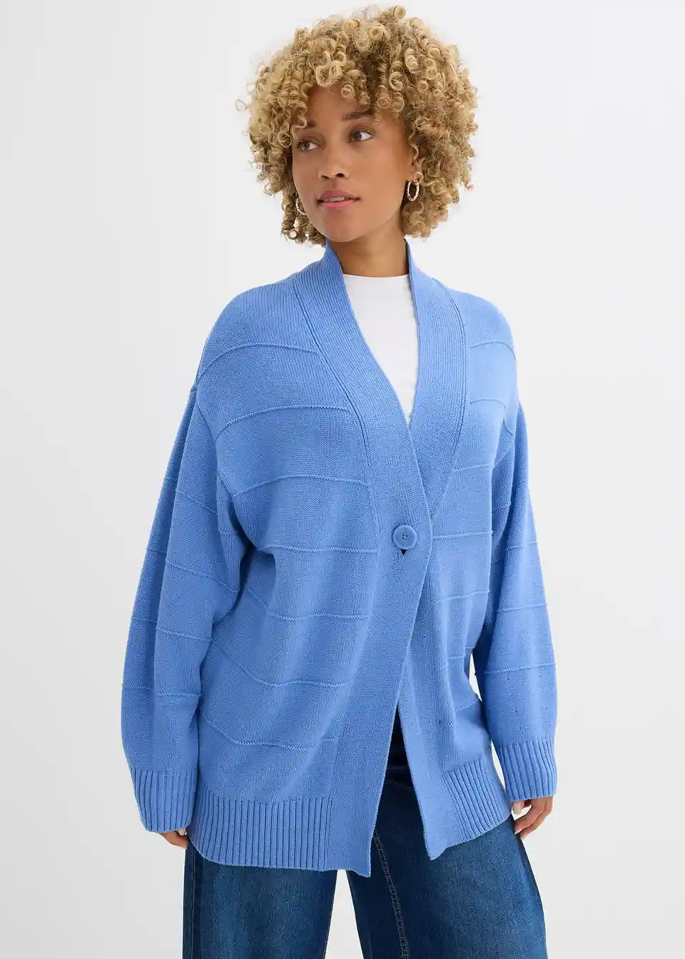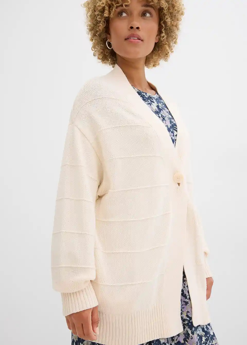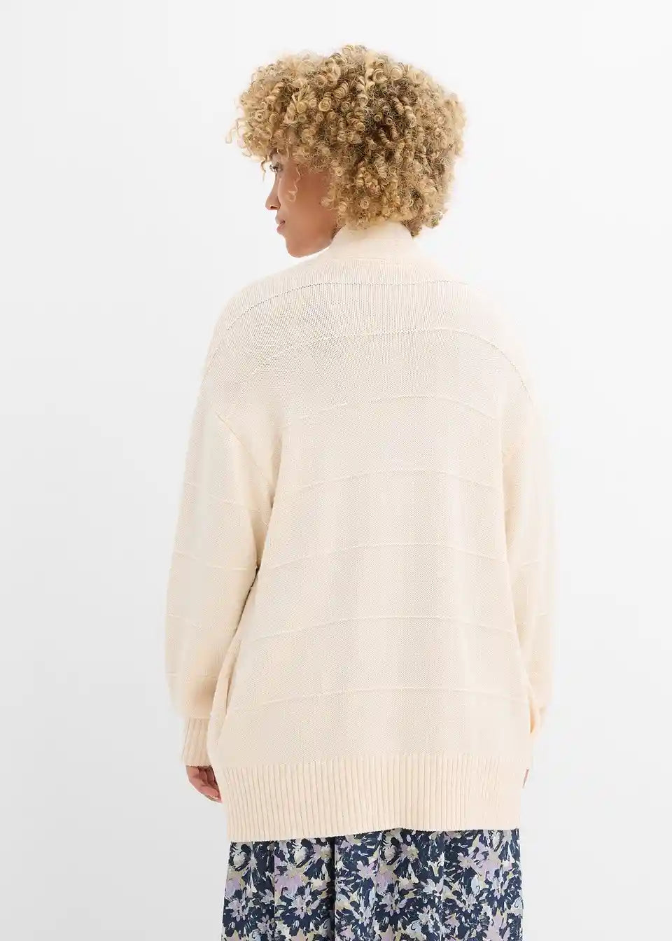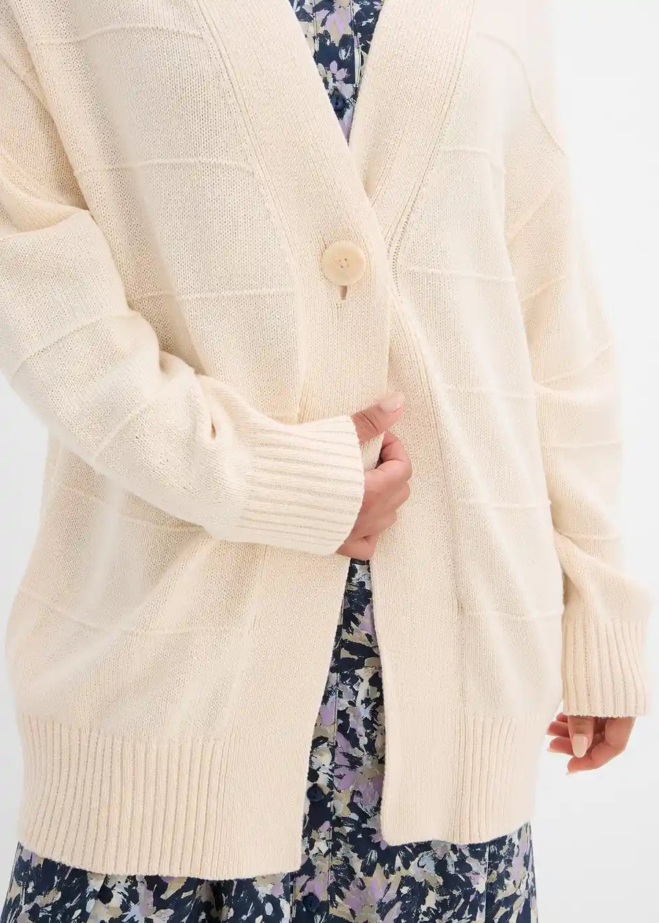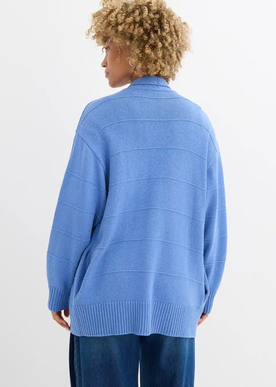 Ohlapno krojen pleteni jopič s spuščenimi rameni in lahkim strukturiranim vzorcem.
