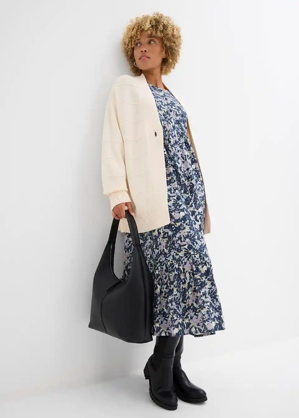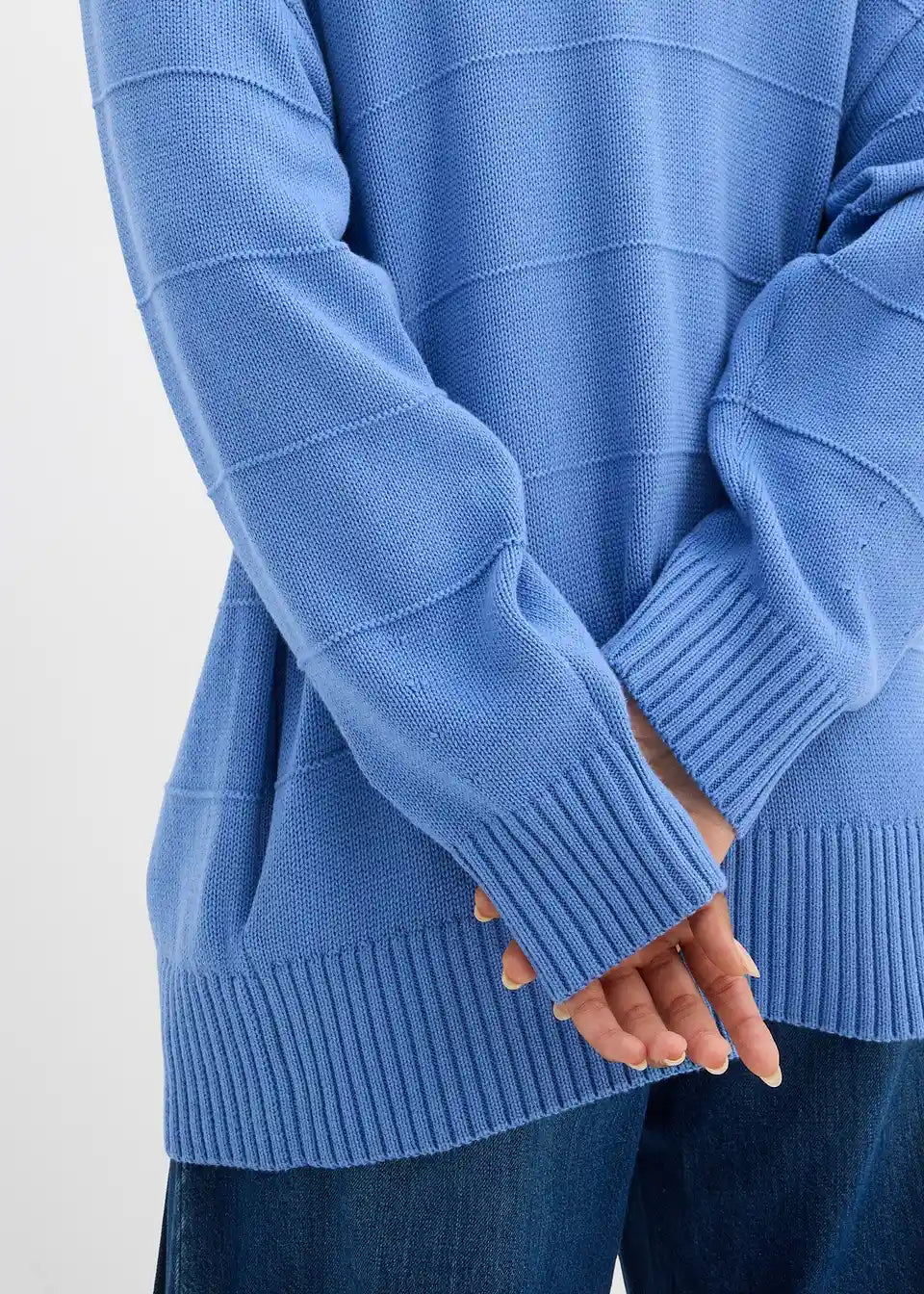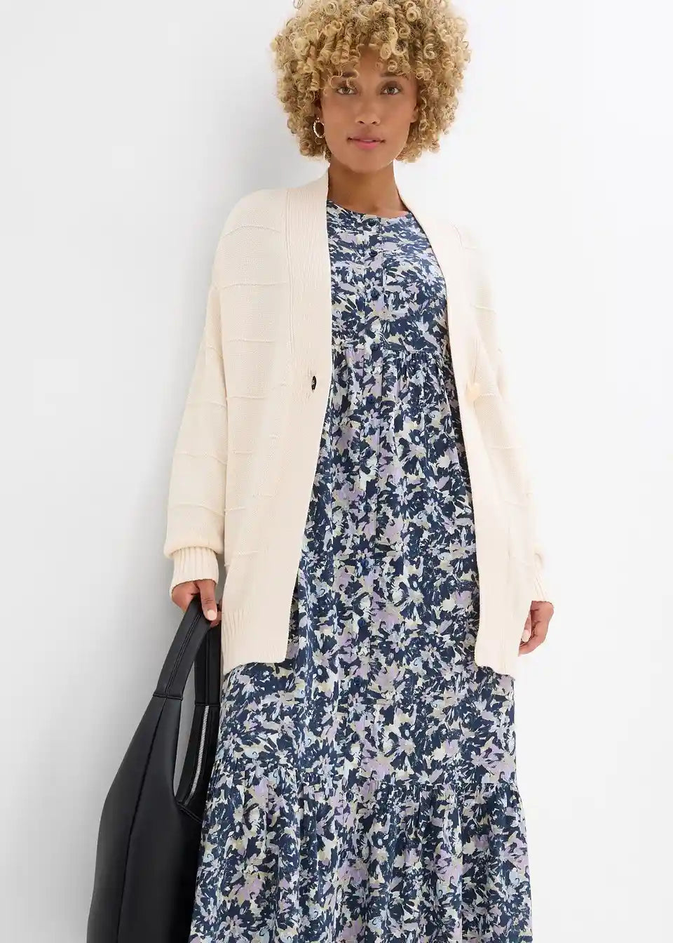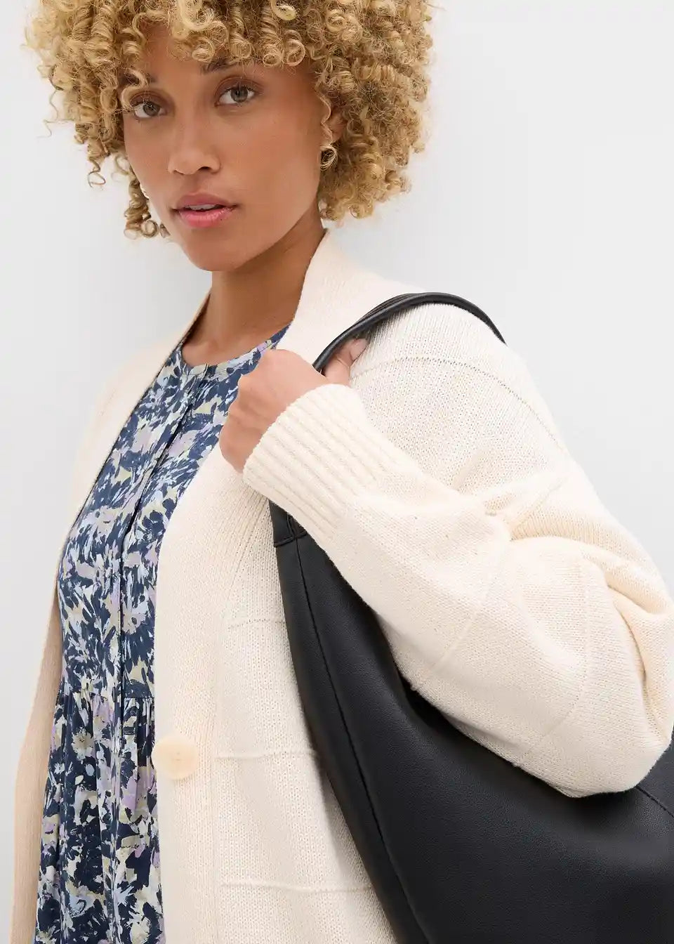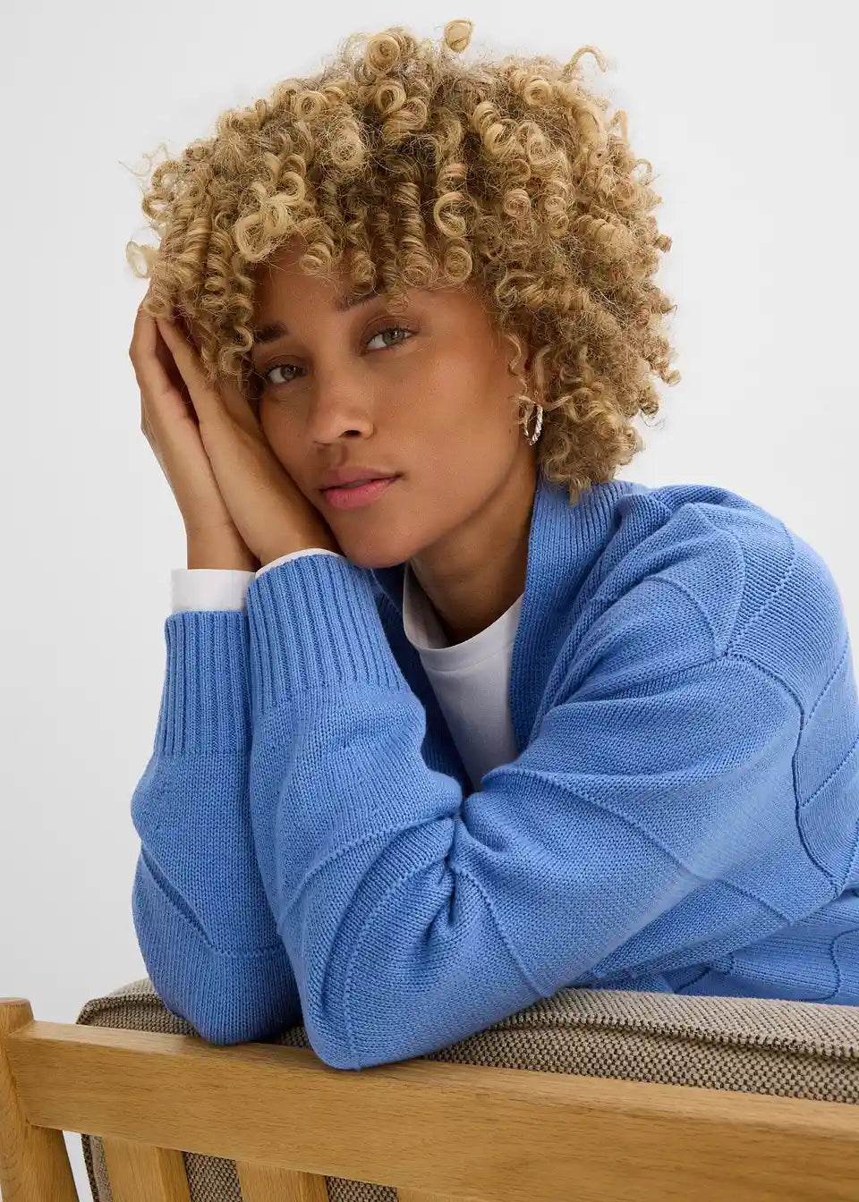 Ohlapno krojen pleteni jopič s spuščenimi rameni in lahkim strukturiranim vzorcem.