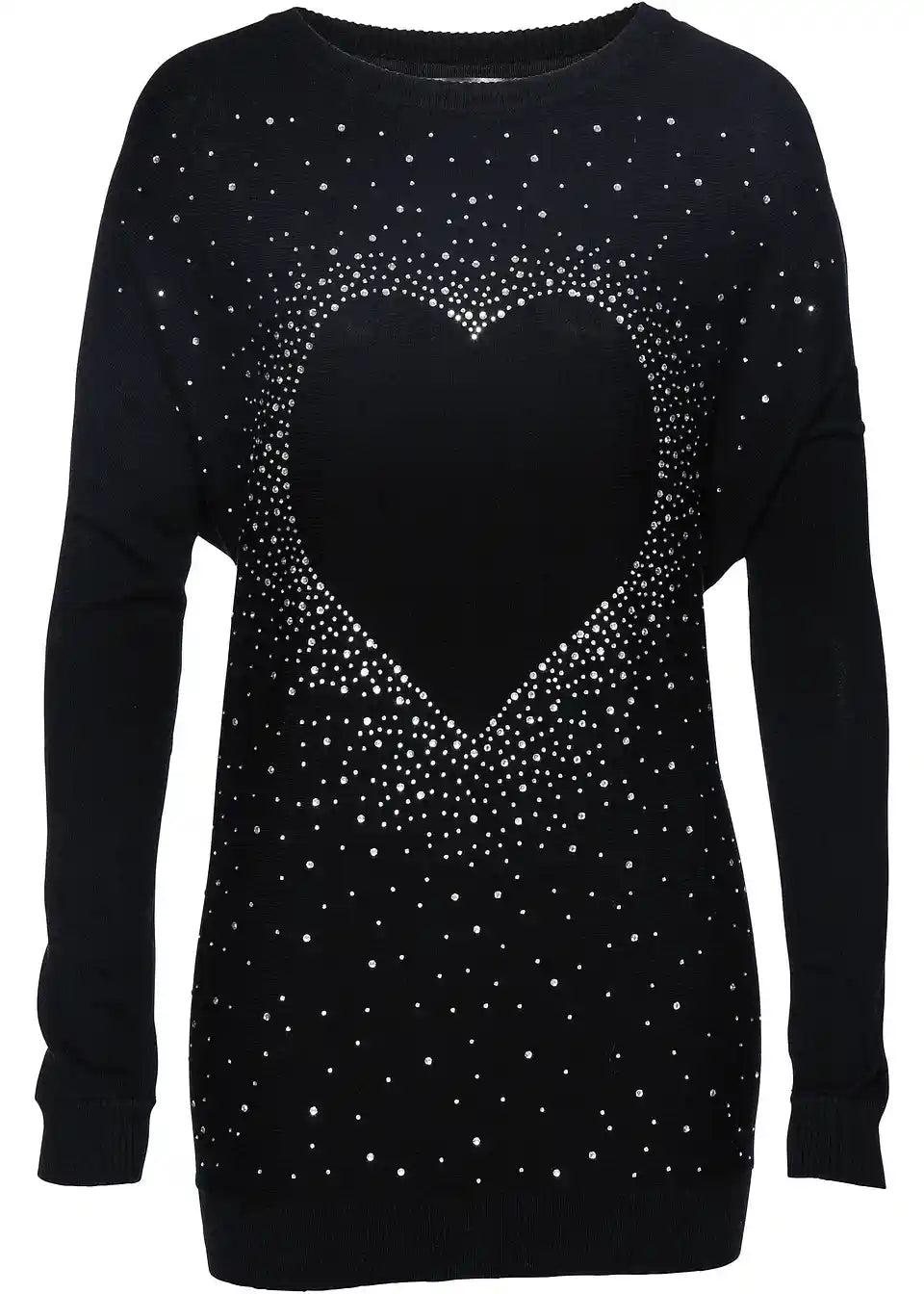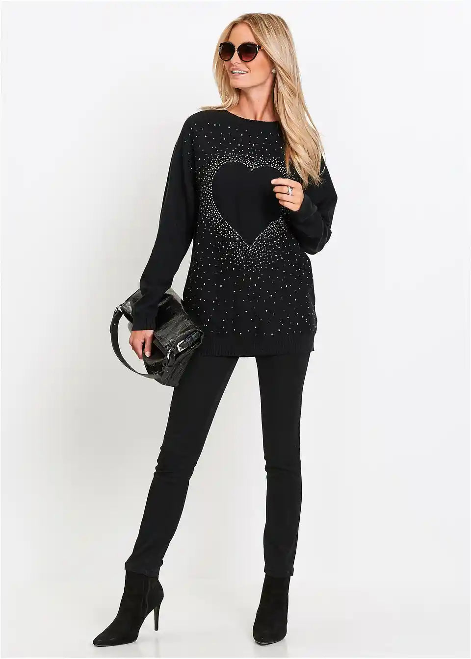 Dolg pulover z okrasnimi kamenčki v obliki srčka