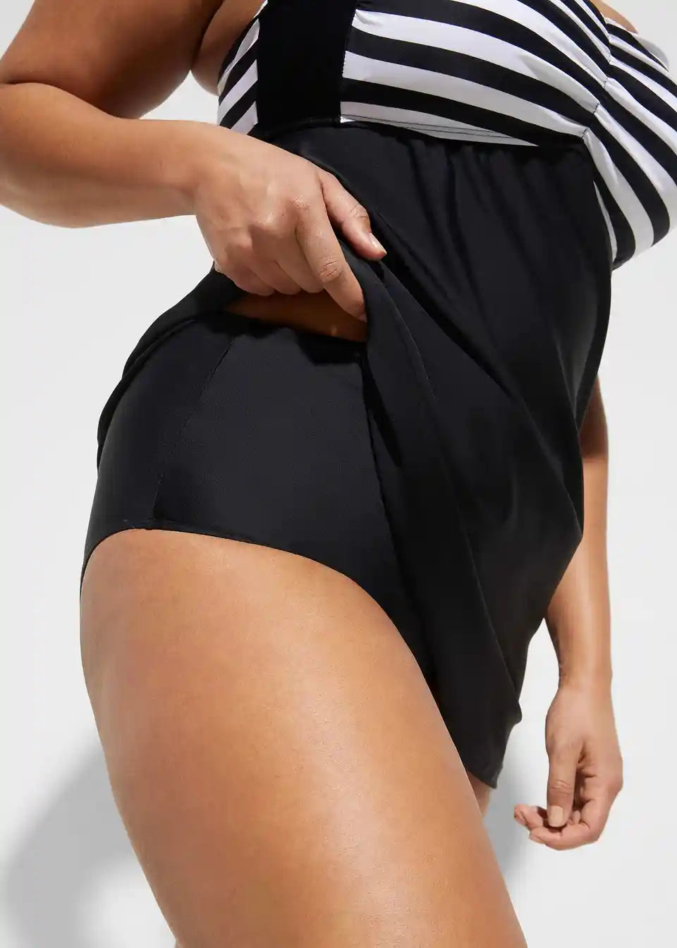 Privlačen dolgi Tankini prepriča z izjemnim udobjem nošenja. To omogočajo daljši, ohlapno krojen zgornji del in hlačke z visokim, lepo prikrivajočim pasom. Zgornji del z nastavljivimi naramnicami stavi na privlačen barvni kontrast. Podloga za prsi, odstranljive mehke košarice in gumi pod prsmi poskrbijo za dobro oporo in rahlo oblikujejo. Hlačke z mednožno podlogo dopolnjujejo ta dolgi Tankini iz bpc kolekcije.