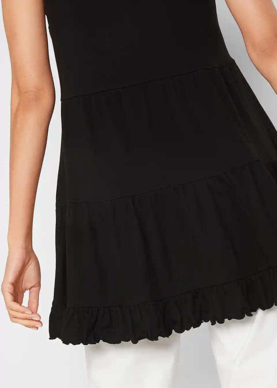 Poletni dolg top z ljubkimi detajli naborkov na širokih naramnicah ter igrivimi volani