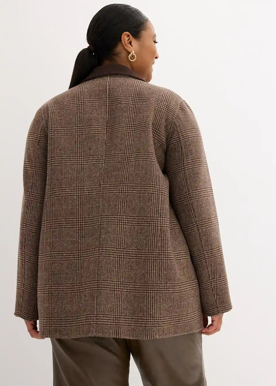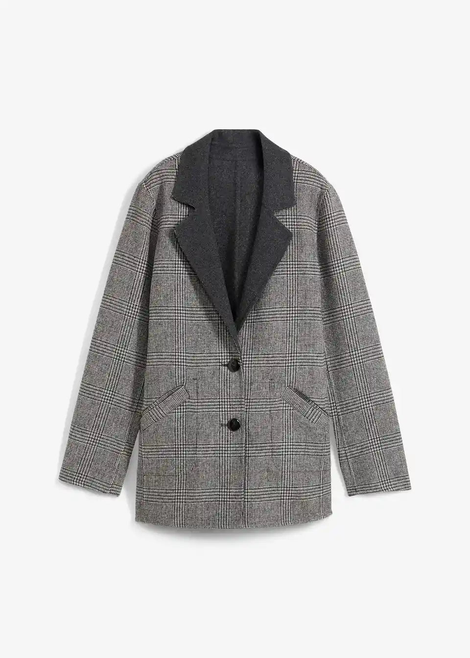 Eleganten volneni blazer, ki ga lahko obrnemo: enobarvna stran na eni strani, brezčasen vzorec Glencheck na drugi strani