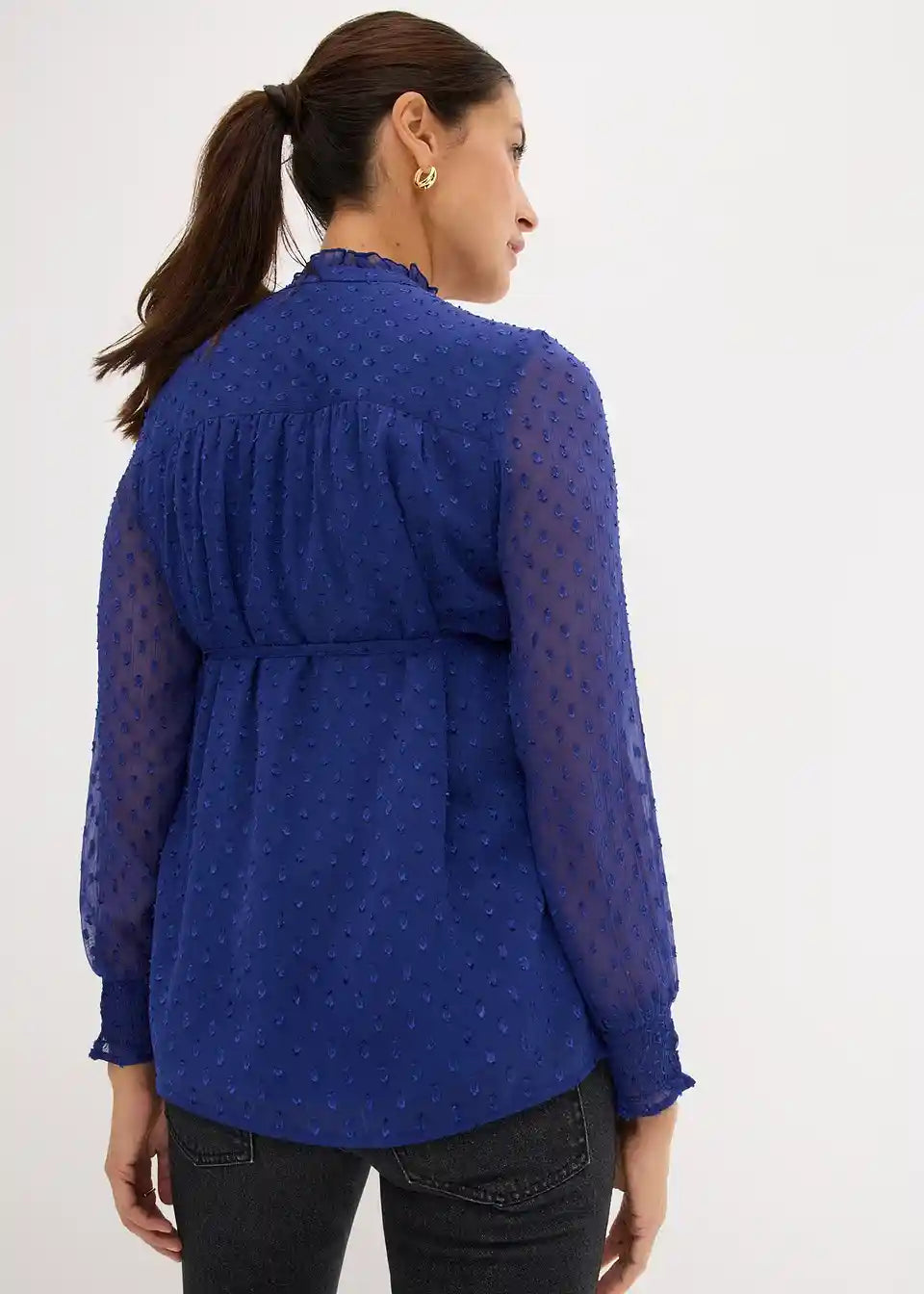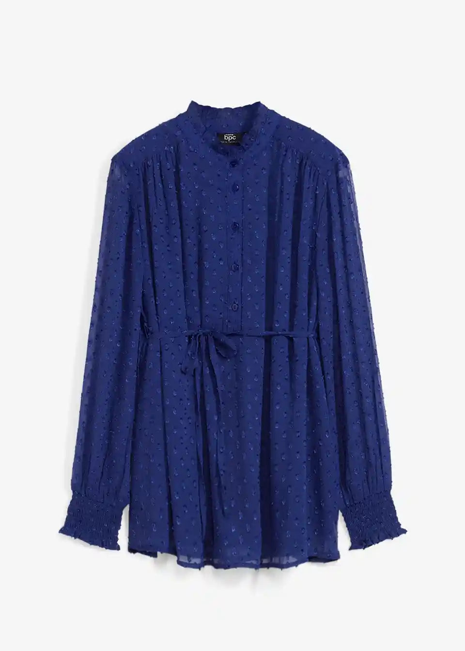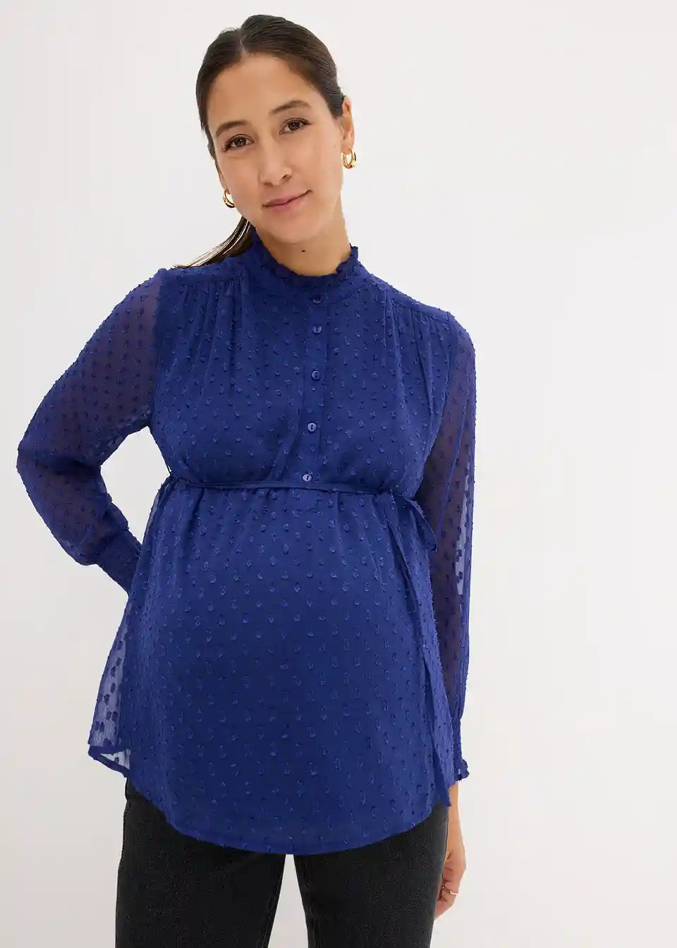 Lahka bluza iz šifona z neprosojno podlogo in rahlo prosojnimi rokavi. Z okrasnim stoječim ovratnikom. Snemljiv pas poudari rastoči nosečniški trebuh. Po nosečnosti omogoča preprosto dojenje s pomočjo gumba na zapenjalni letvi. Dolgi rokavi s smock učinkom na zapestjih.