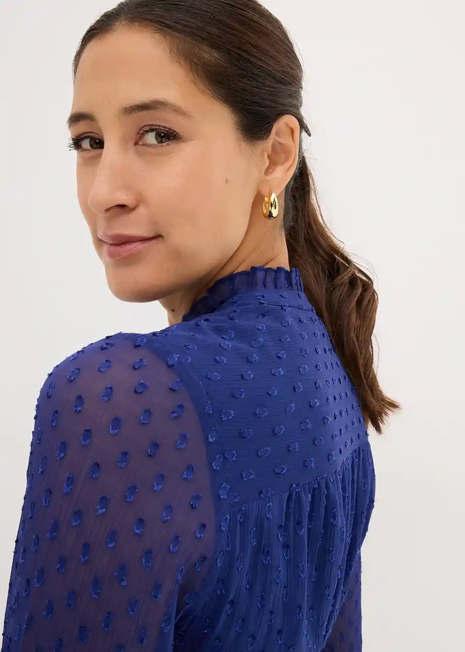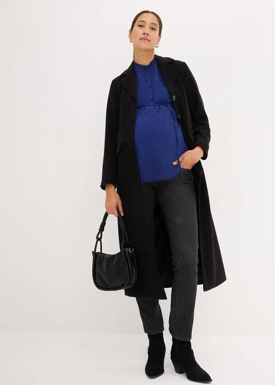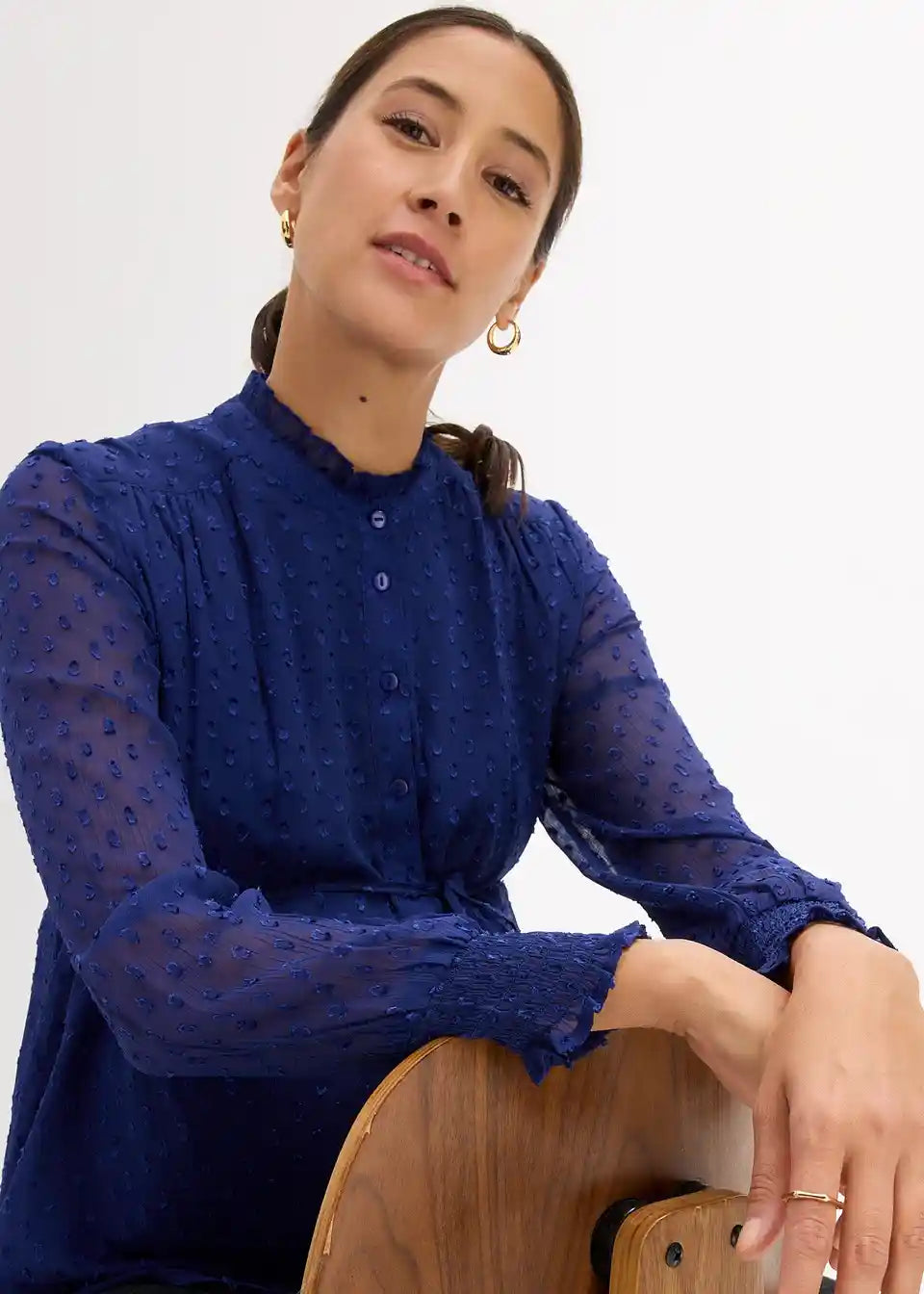 Lahka bluza iz šifona z neprosojno podlogo in rahlo prosojnimi rokavi. Z okrasnim stoječim ovratnikom. Snemljiv pas poudari rastoči nosečniški trebuh. Po nosečnosti omogoča preprosto dojenje s pomočjo gumba na zapenjalni letvi. Dolgi rokavi s smock učinkom na zapestjih.
