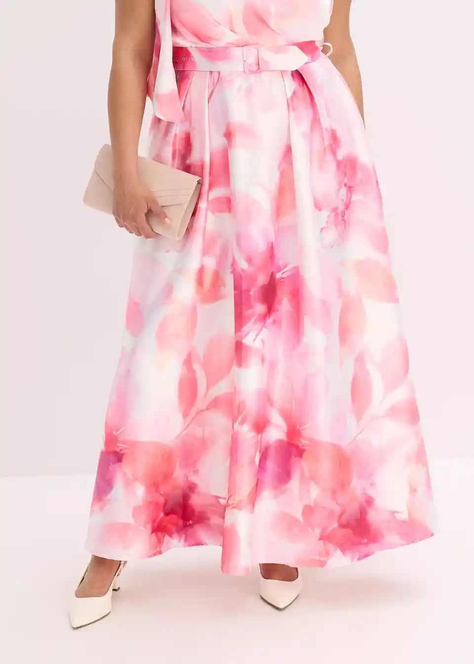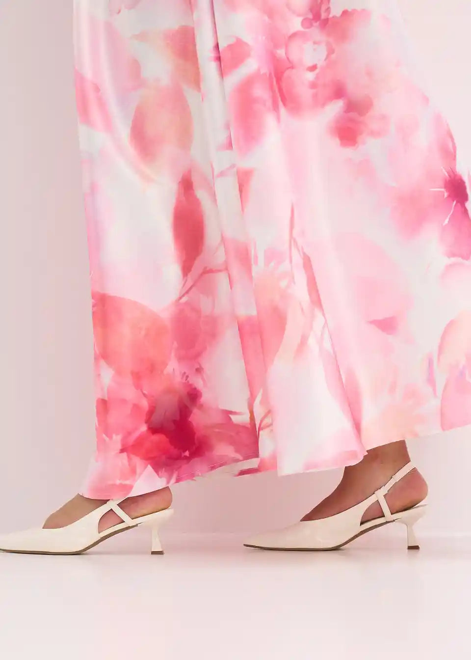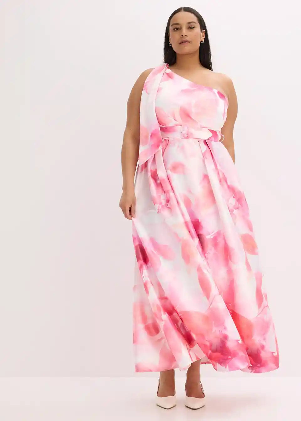 Moderno in ženstveno: enoramenska obleka v maksi dolžini iz sijočega satena z allover potiskom, ki naredi vsak kos edinstven.