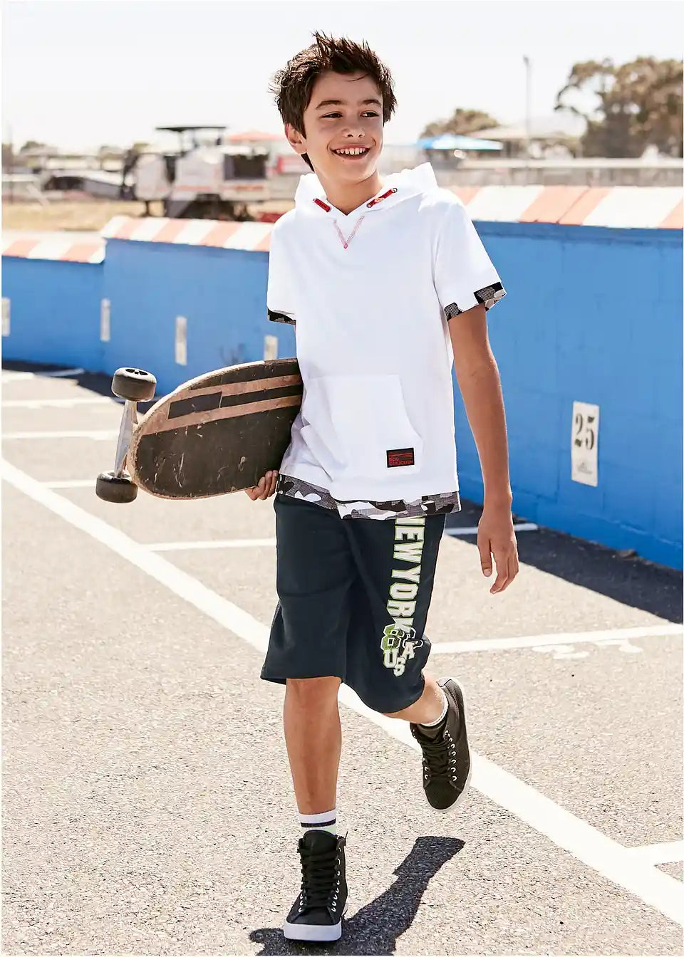 Te sweat bermude znamke bpc prepričajo z modernim videzom in udobjem. Ena hlačnica je na sprednji strani okrašena z motivom. Ohlapen kroj nudi veliko svobode gibanja pri rolkanju ali drugih športnih aktivnostih. Elastični pas in material iz sweat tkanine naredita bermude z žepi zelo udobne. Z vrvico lahko prilagodite širino pasu.