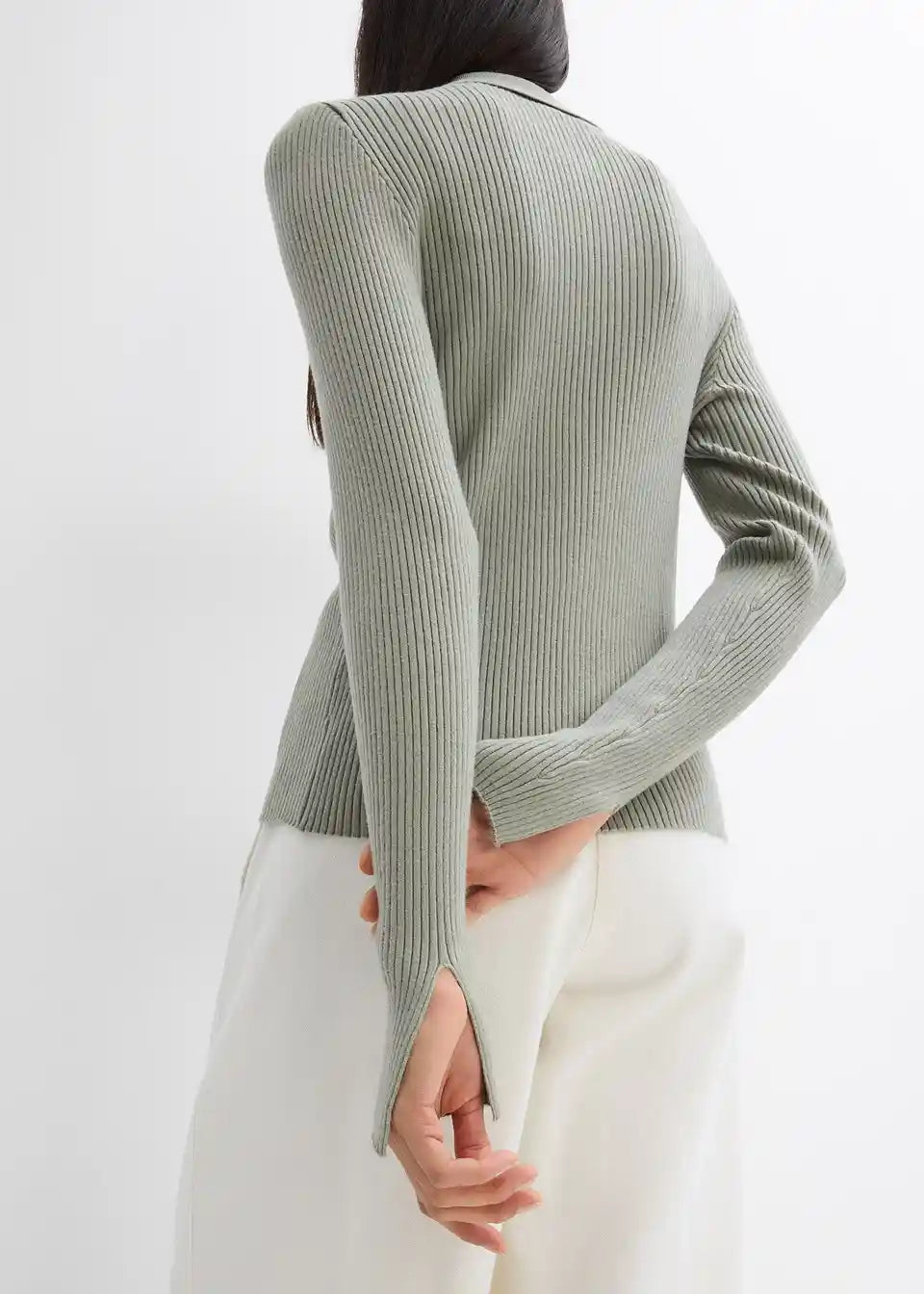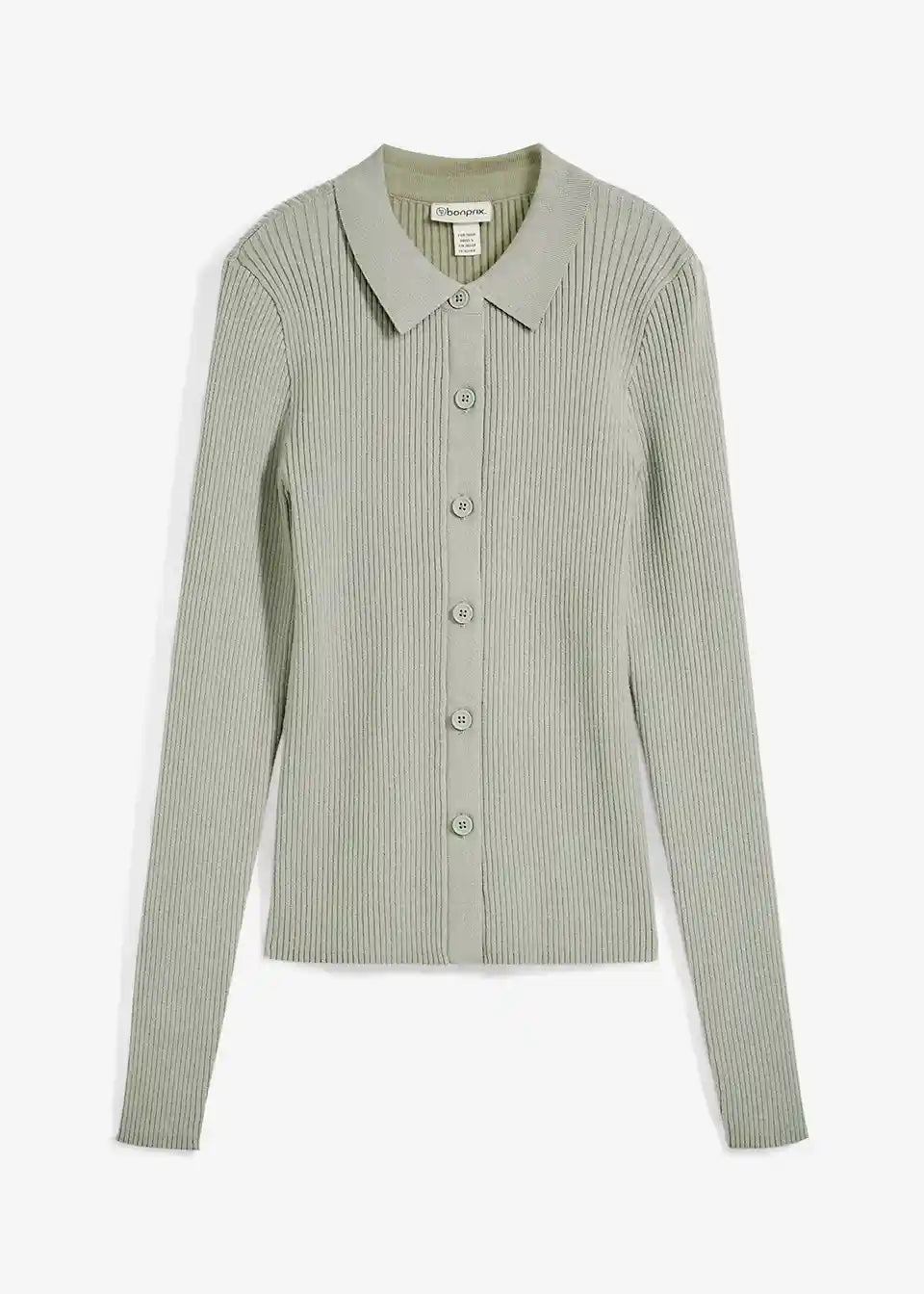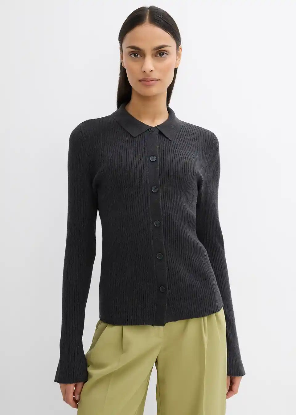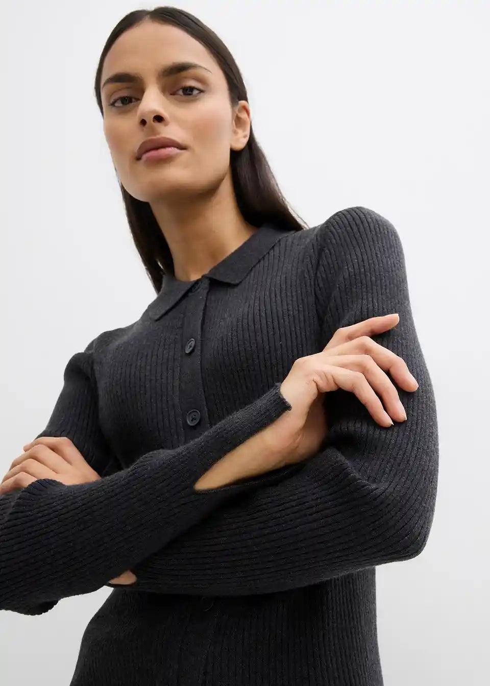 Rebrasta fina pletena jopica v oprijetem kroju s koničastim ovratnikom, barvno usklajenimi gumbi in širokimi razporki na manšetah