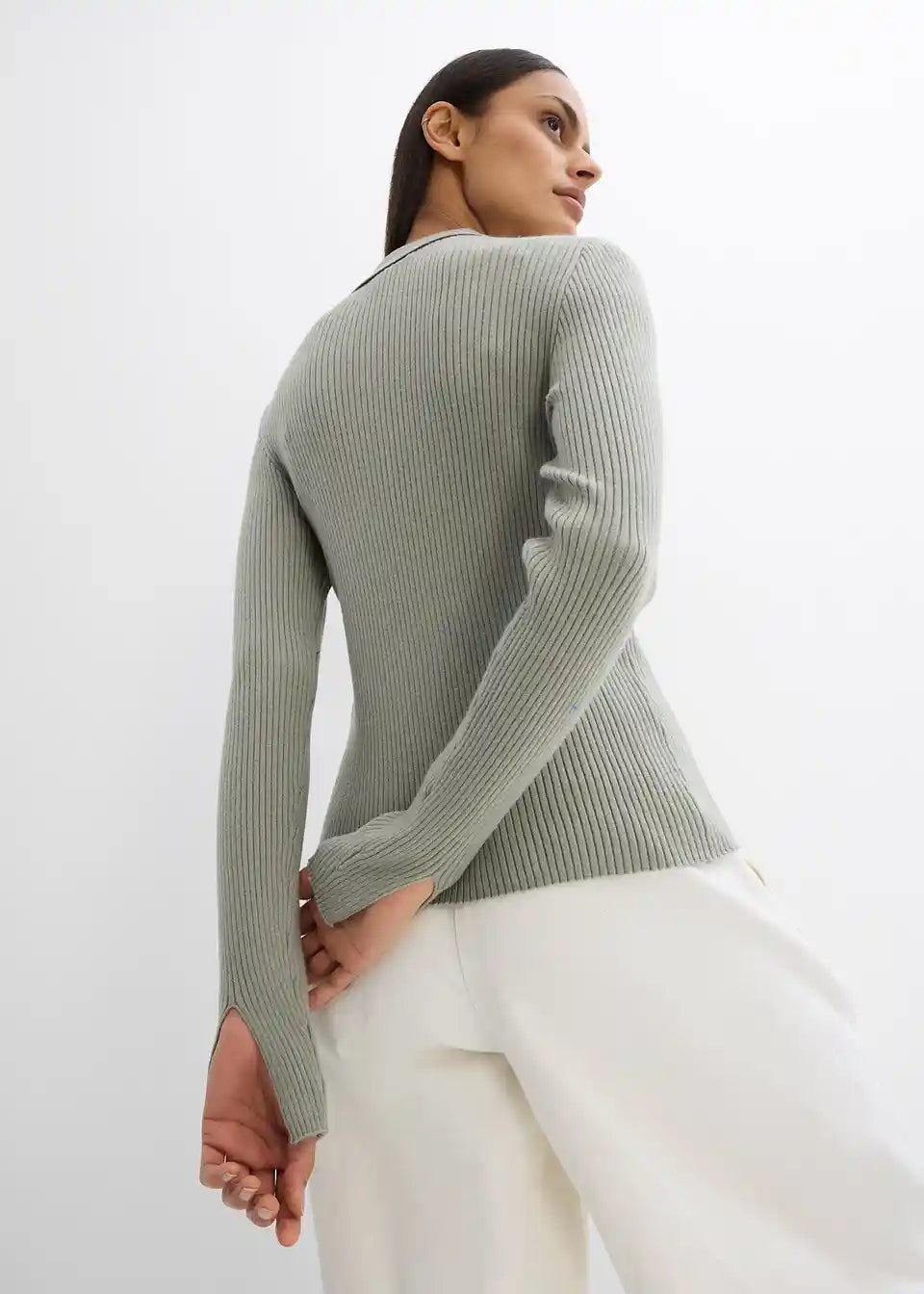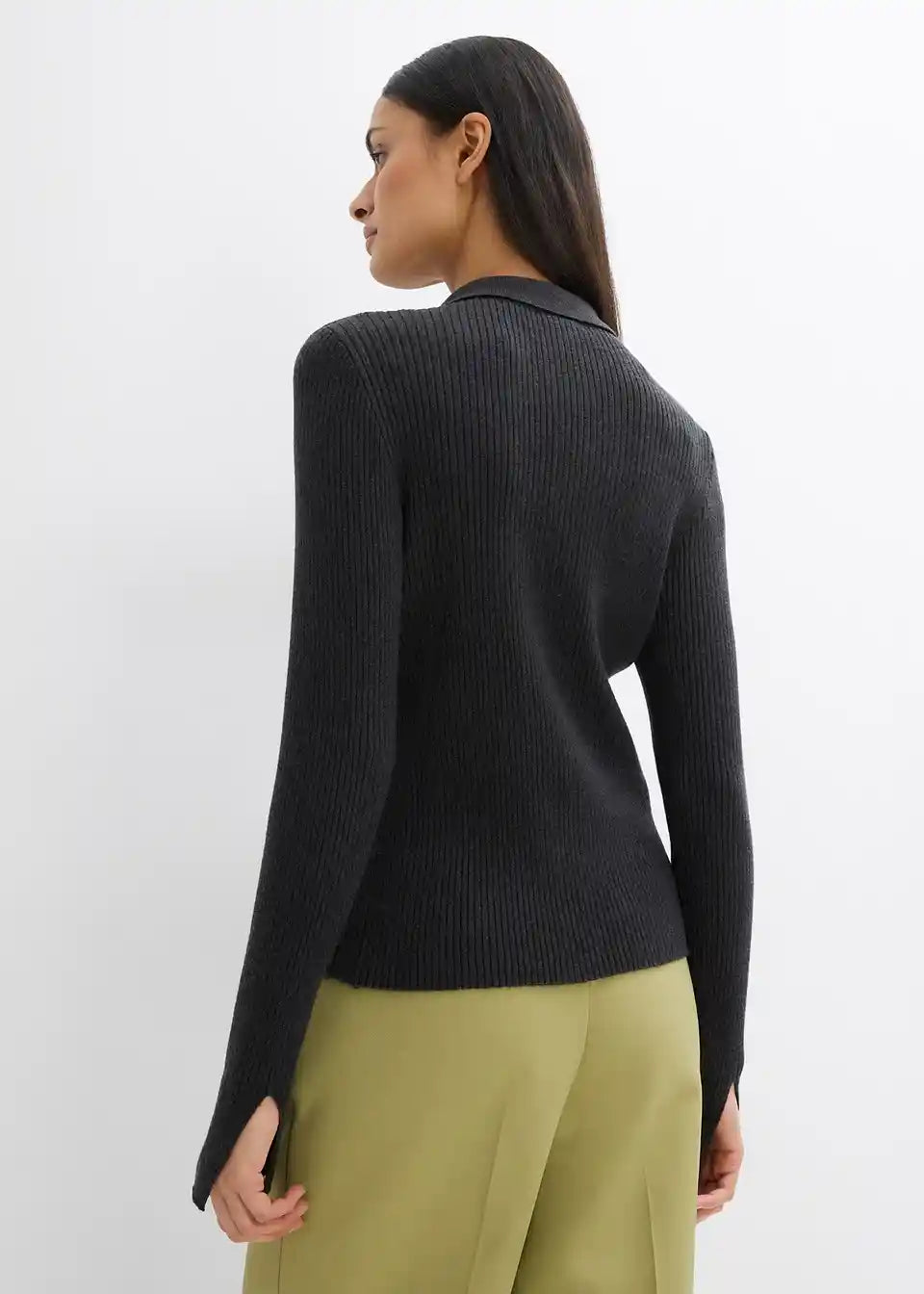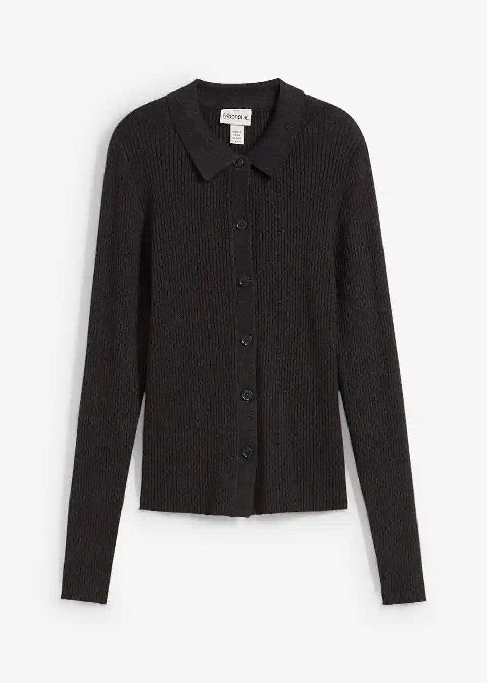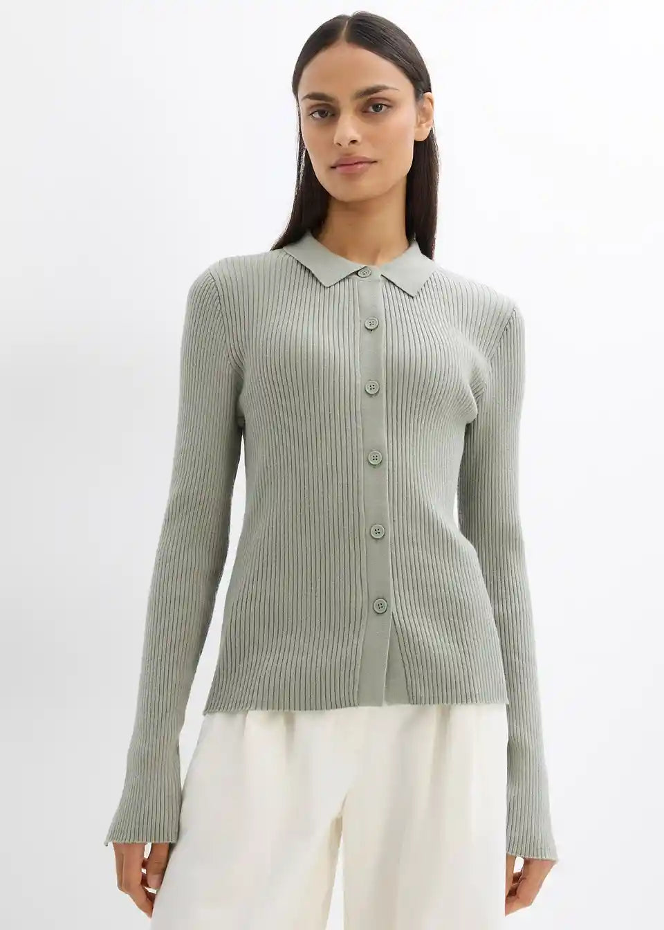 Rebrasta fina pletena jopica v oprijetem kroju s koničastim ovratnikom, barvno usklajenimi gumbi in širokimi razporki na manšetah