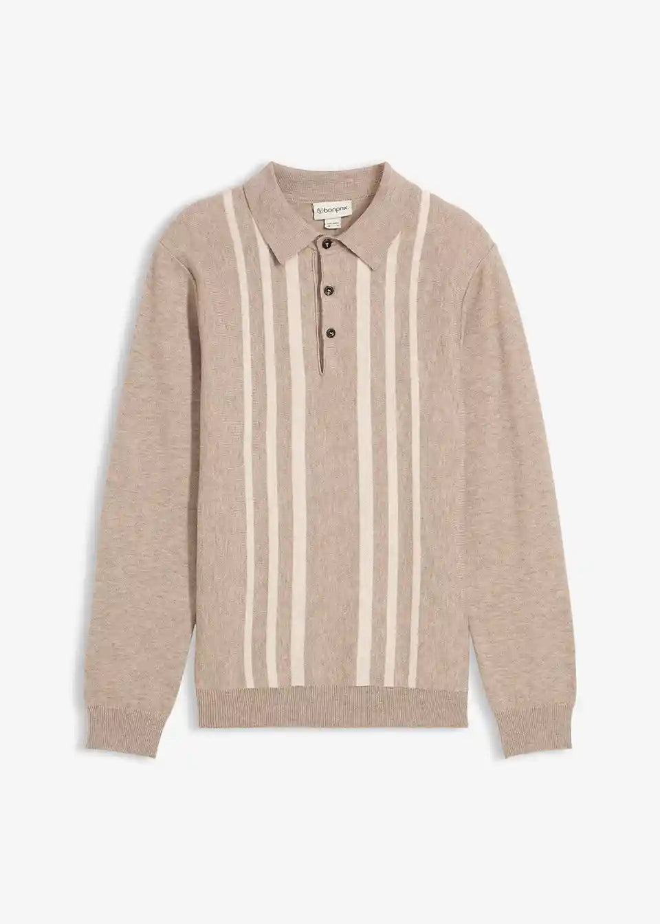 Šik ozek pleten pulover s polo ovratnikom, plemenitimi gumbi in črtastim vzorcem