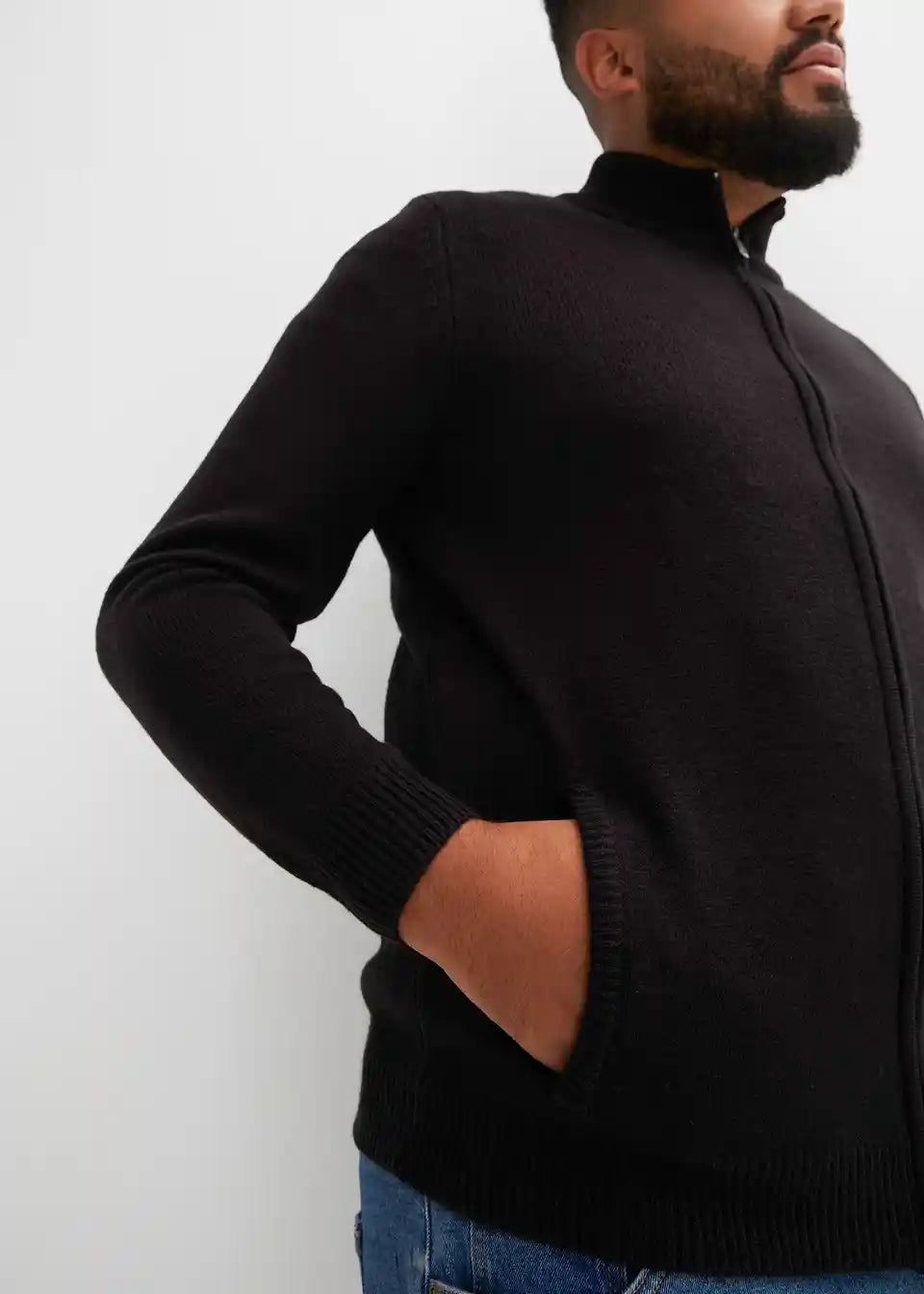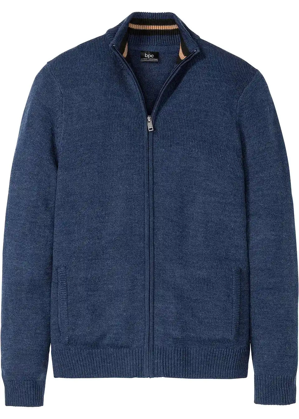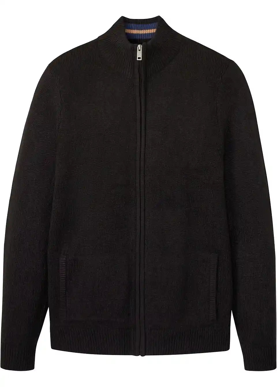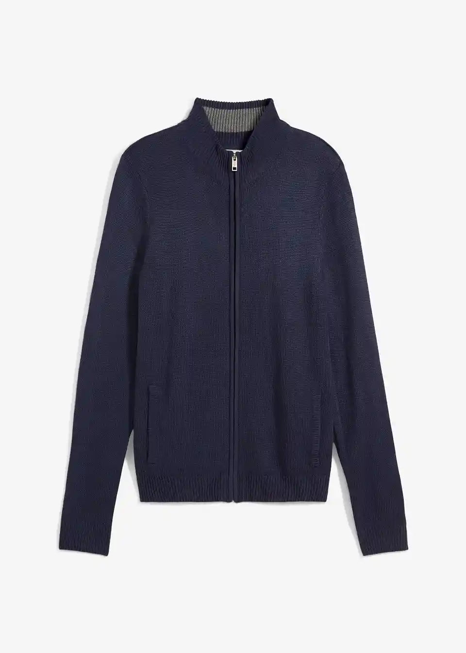 Pletena jopa s stoječim ovratnikom in zadrgo na sprednji sredini.