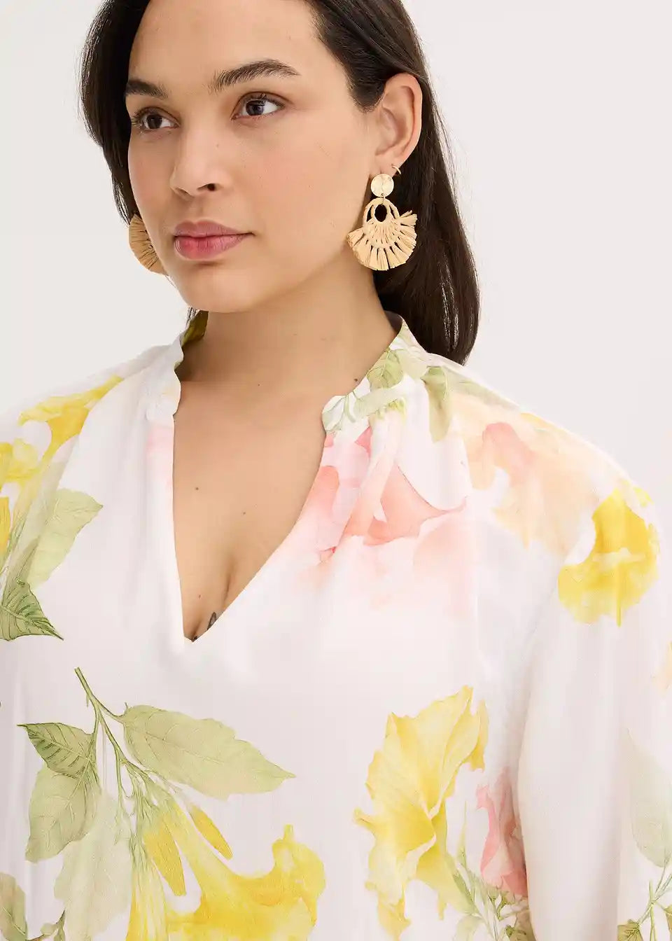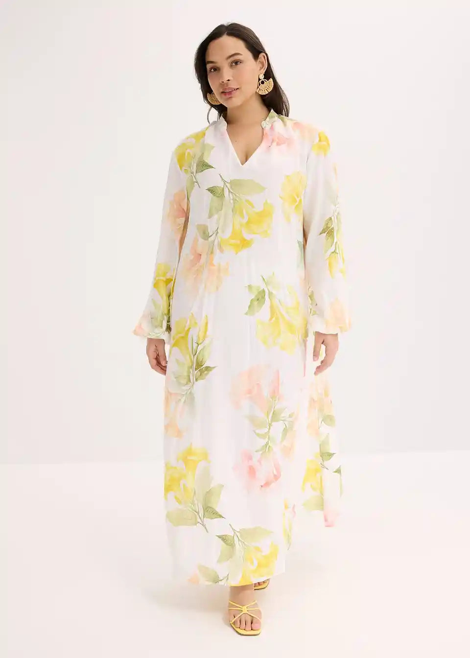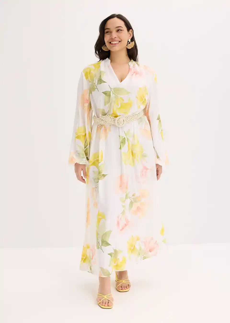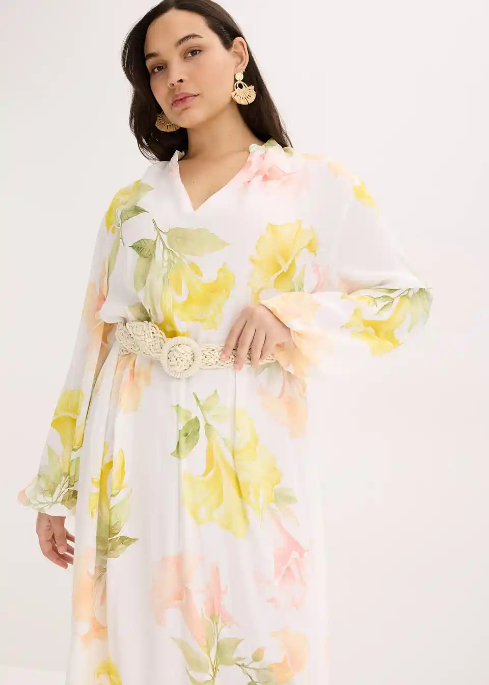 Ohlapna dolga cvetlična obleka z voluminoznimi rokavi