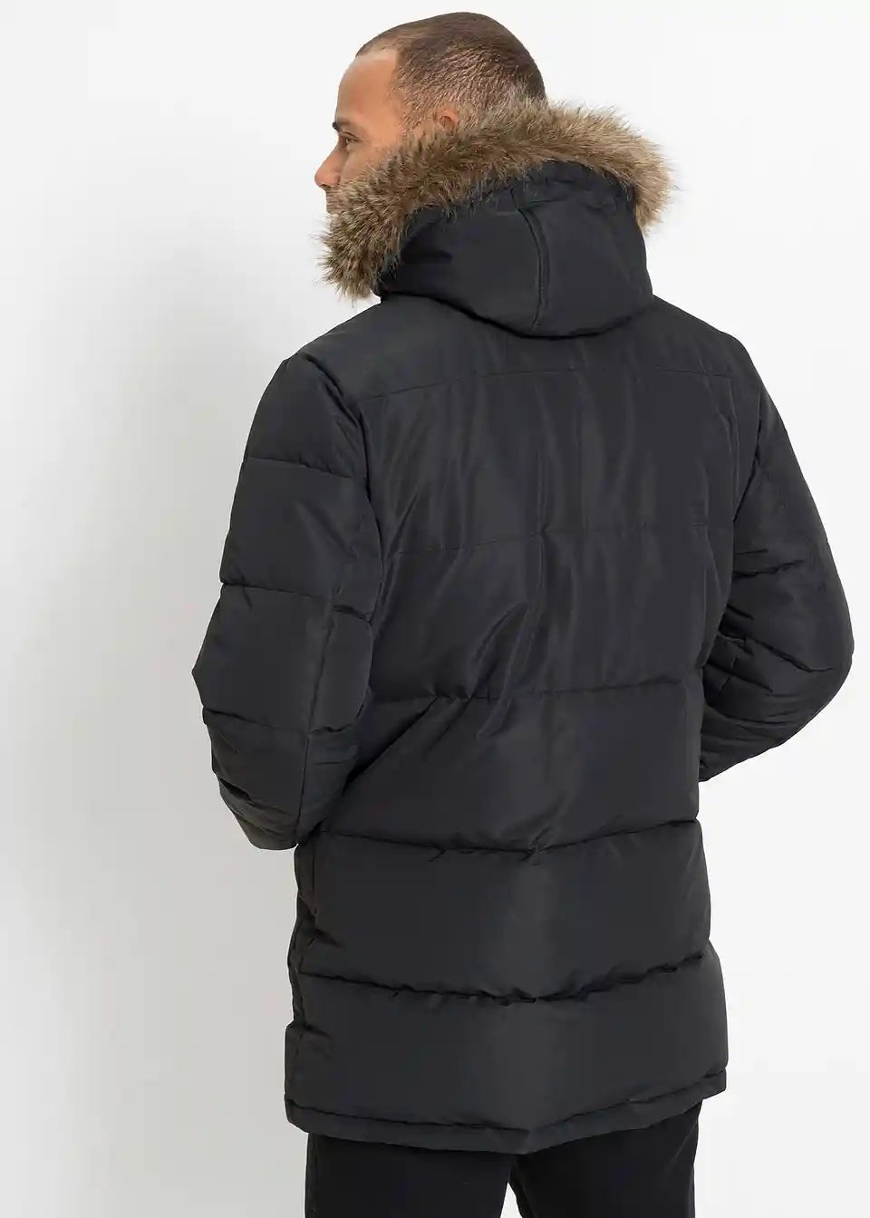 Moška zimska parka v Regular Fit kroju je popoln kos oblačila za hladne zimske dni. Dolg plašč navdušuje s kapuco, ki je na robu obložena z mehkim umetnim krznom. Dva našita velika žepa, dva poševna žepa in en notranji žep nudijo prostor za številne pripomočke. Zimska parka Regular Fit se zapira z zaprtim zadrgo.