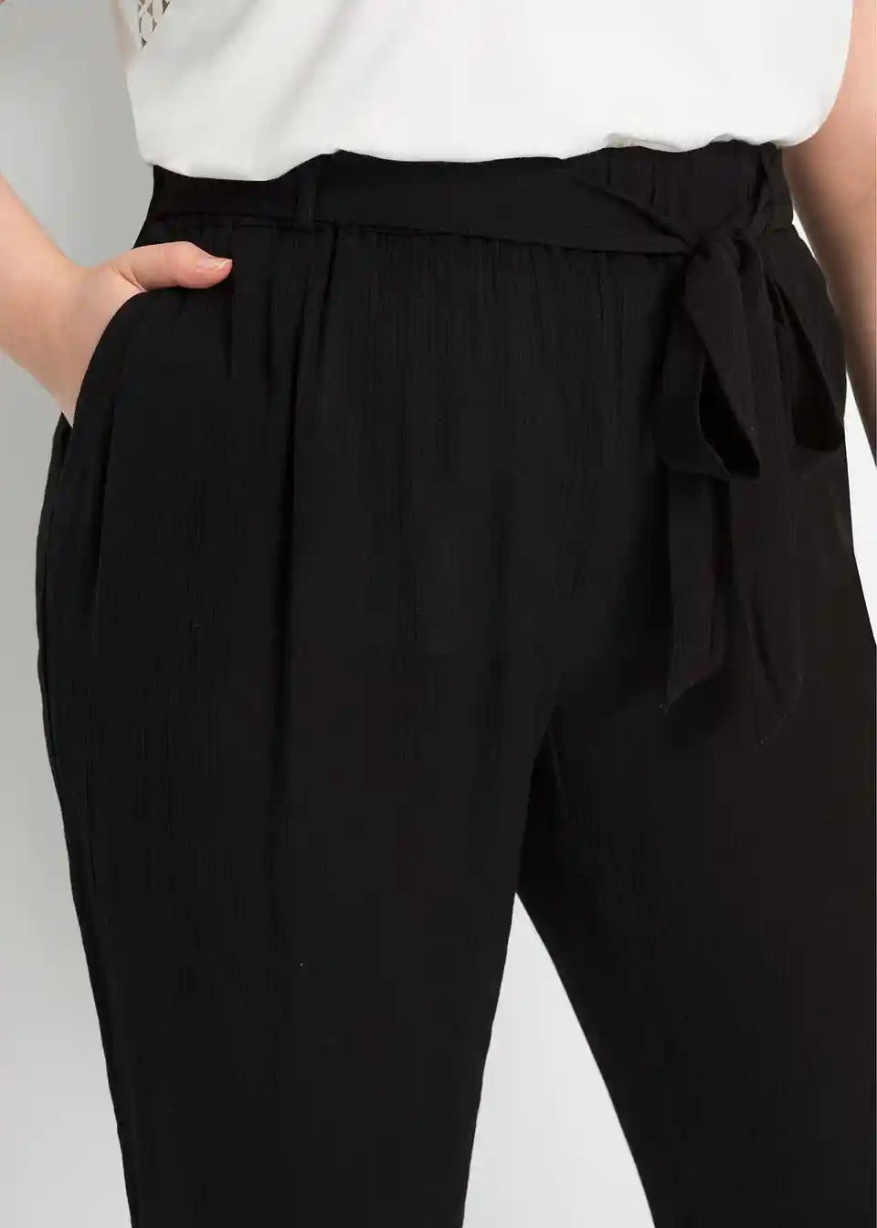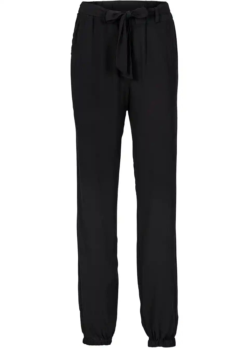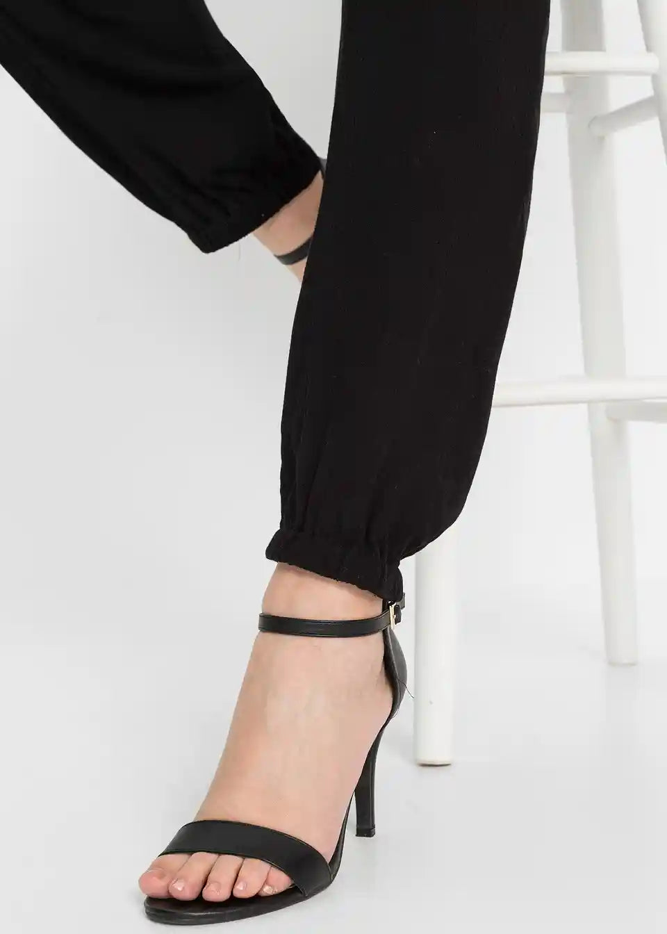 Zračna zasnova tega modela BODYFLIRT lepo objame noge. Široke hlače z lepim pasom in širokim pasničkom pridobijo privlačen videz z elastično gumico na koncu hlačnic. Dva stranska vstavljena žepa dopolnjujeta široke hlače. Ohlapno bluzasto majico in sandale lahko združite s tem čudovitim kosom za minimalističen, a stilski videz. Nekoliko bolj modno delujejo s preprostim topom in opaznim etno nakitom.