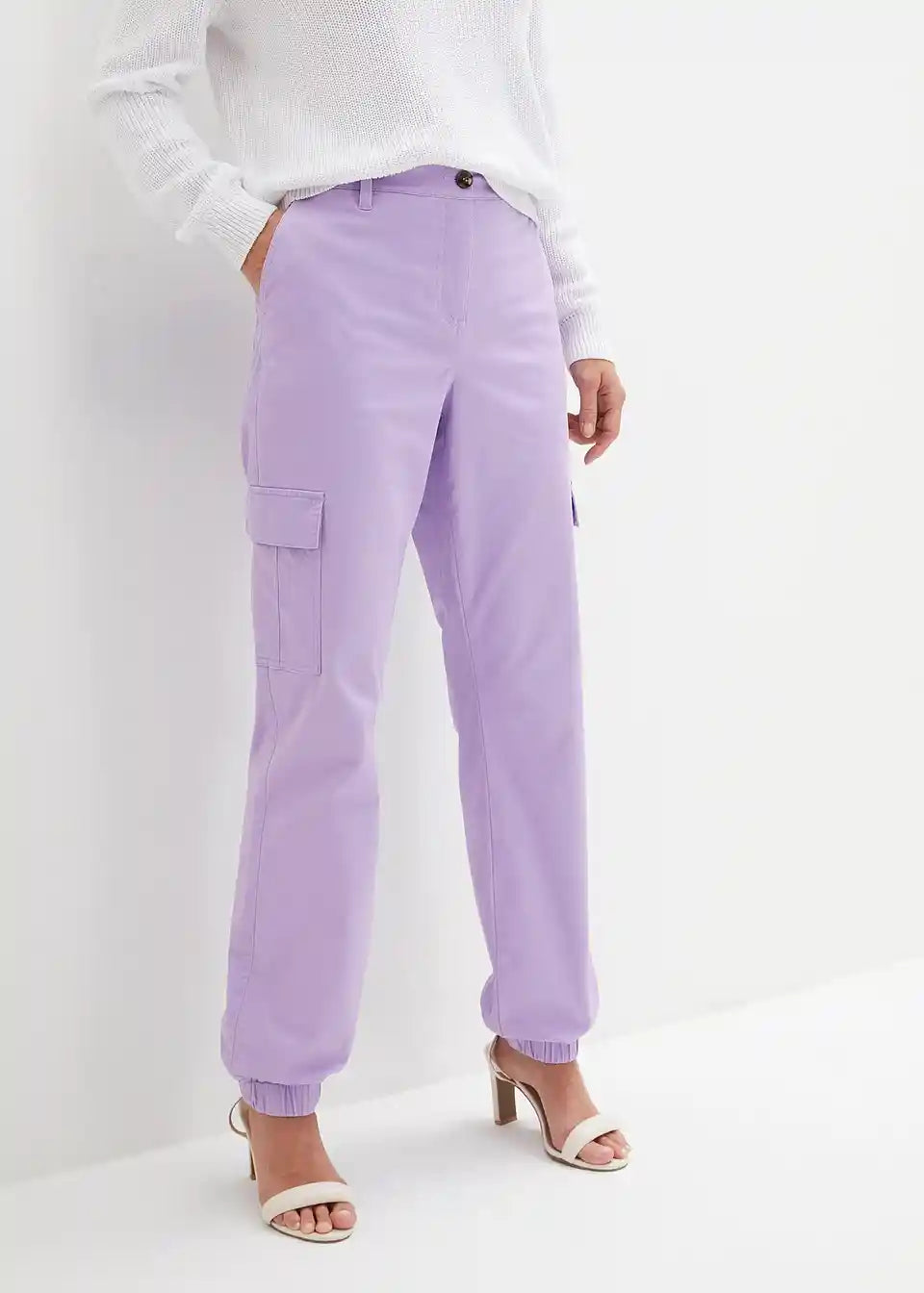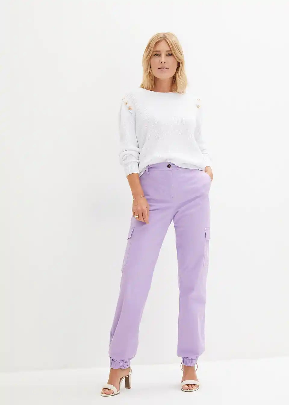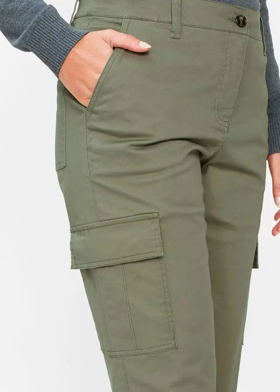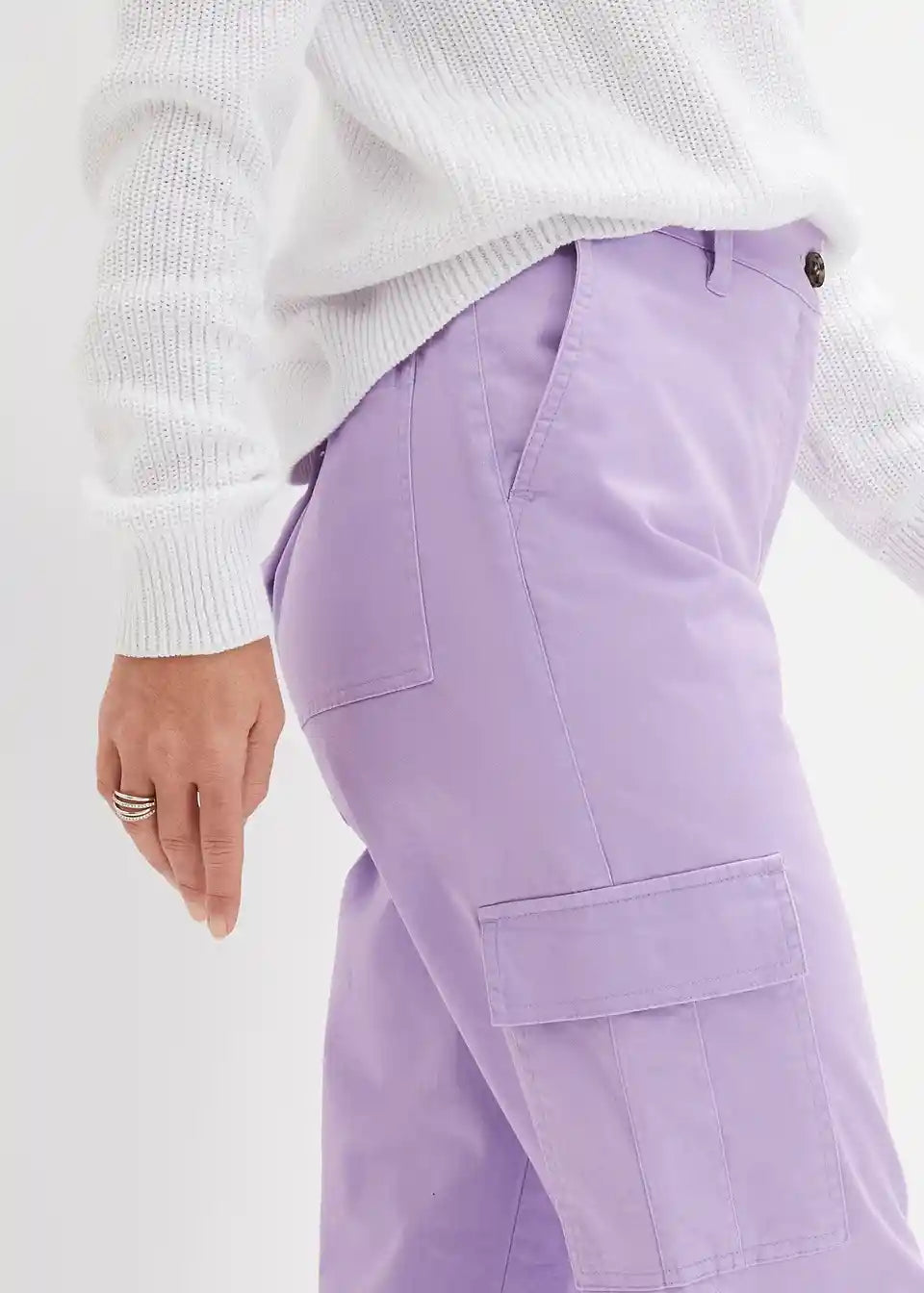 Te sproščene Cargo-hlače so izjemno udobne zaradi vsebnosti elastana in udobnega pasu. Sproščen kroj hlač prav tako pripomore k udobju. Moderne Cargo-hlače se lahko kombinirajo na več načinov. Klasična puli majica, sproščena majica ali modna potiskana majica bpc Selection so popolna izbira za preprosto barvo sproščenih Cargo-hlač. Feminilni čevlji z visoko peto ali ploski čevlji zaokrožijo videz skupaj z nežnim nakitom in modno torbico.