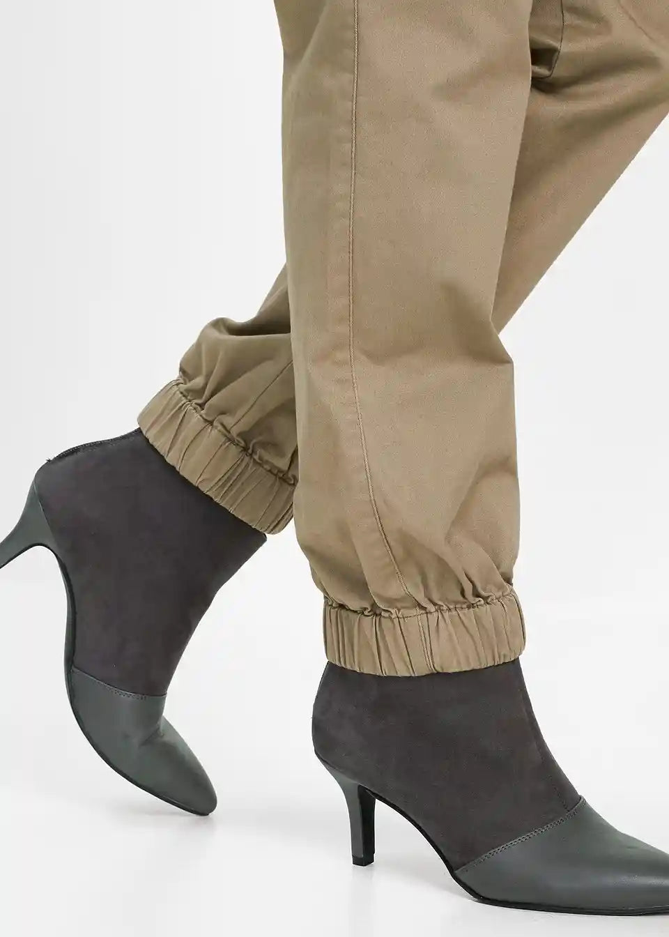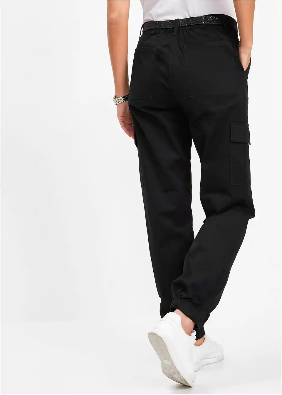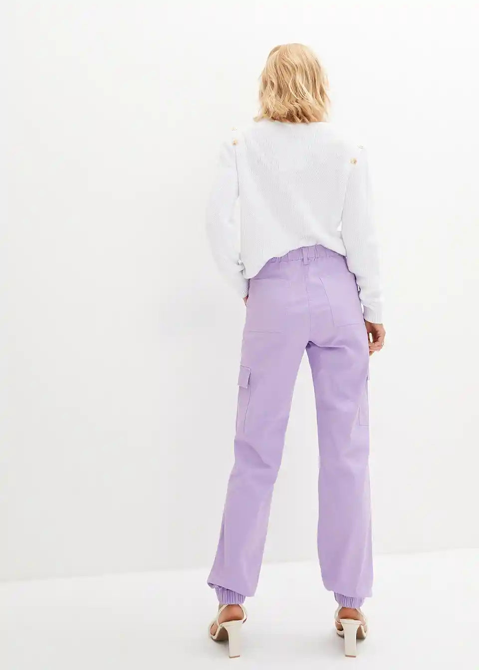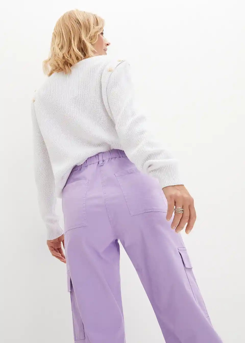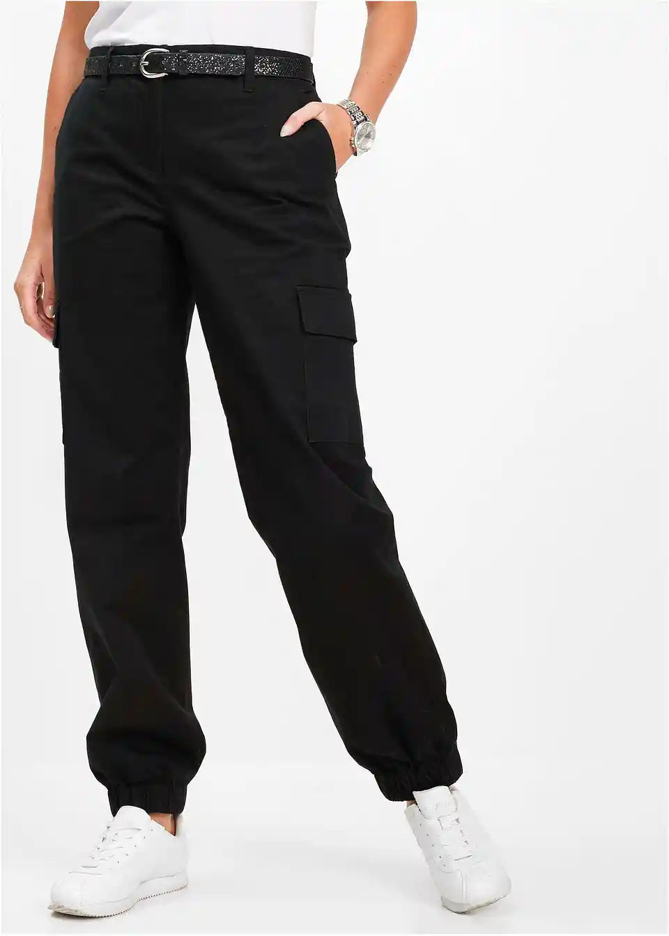 Te sproščene Cargo-hlače so izjemno udobne zaradi vsebnosti elastana in udobnega pasu. Sproščen kroj hlač prav tako pripomore k udobju. Moderne Cargo-hlače se lahko kombinirajo na več načinov. Klasična puli majica, sproščena majica ali modna potiskana majica bpc Selection so popolna izbira za preprosto barvo sproščenih Cargo-hlač. Feminilni čevlji z visoko peto ali ploski čevlji zaokrožijo videz skupaj z nežnim nakitom in modno torbico.