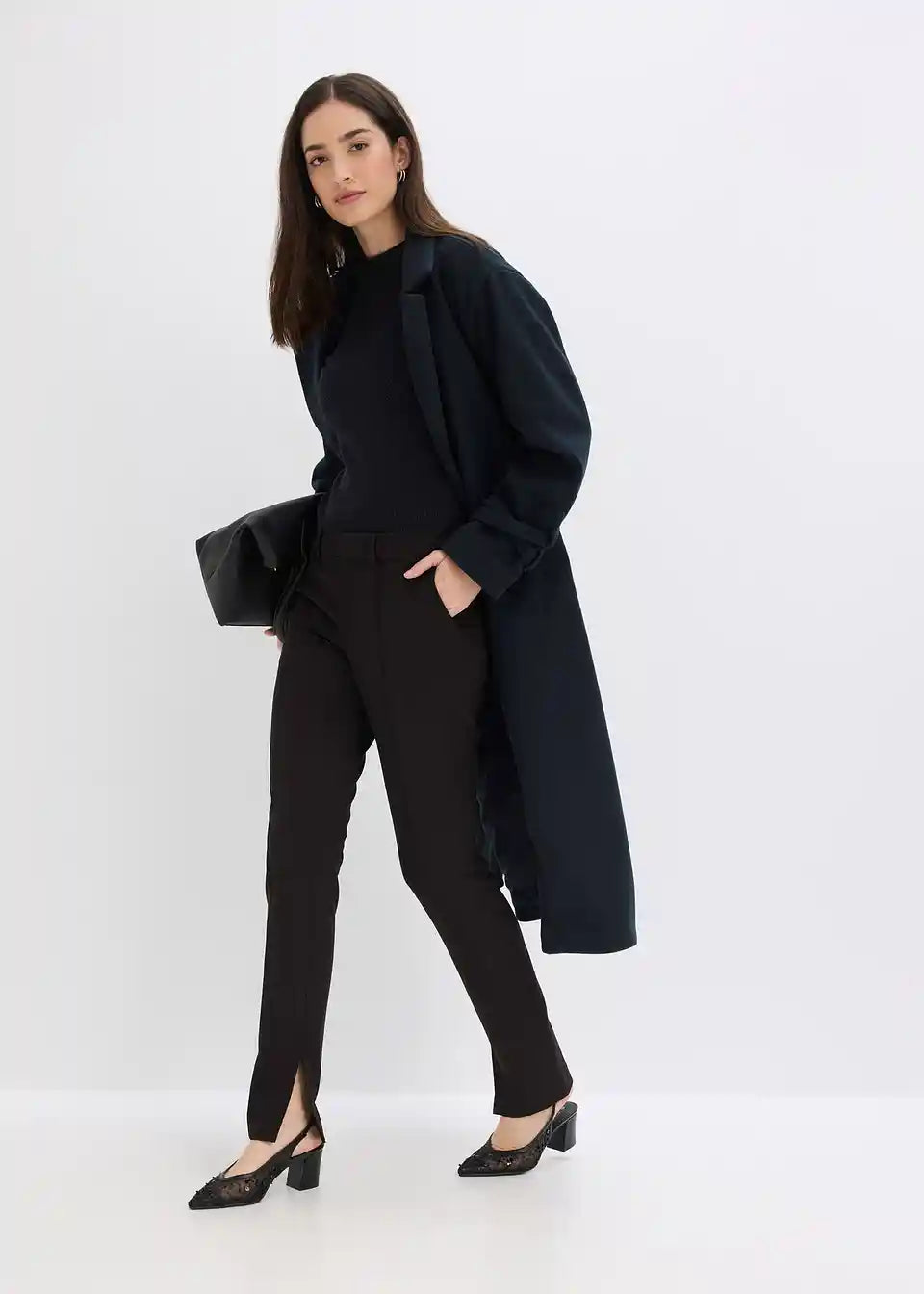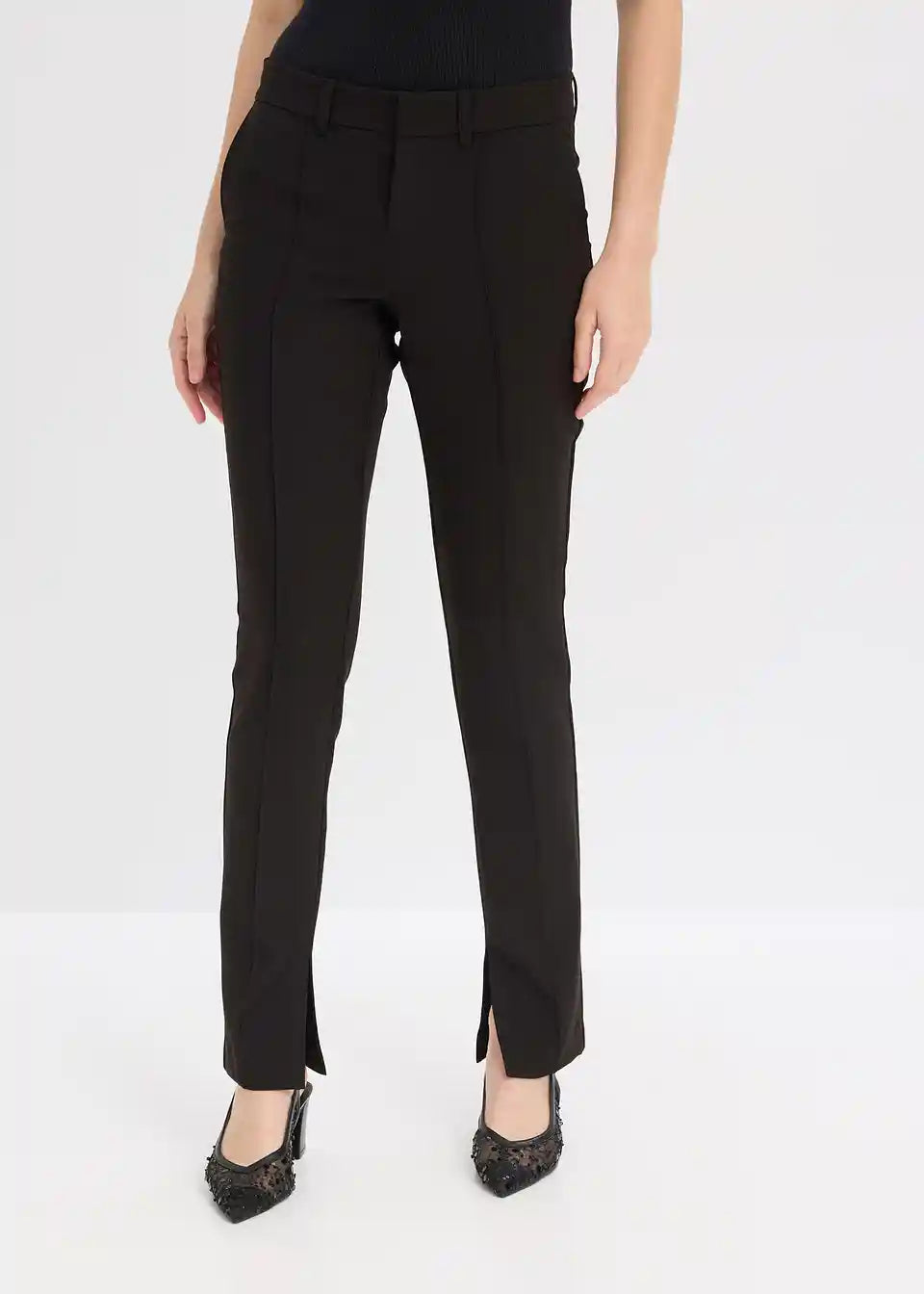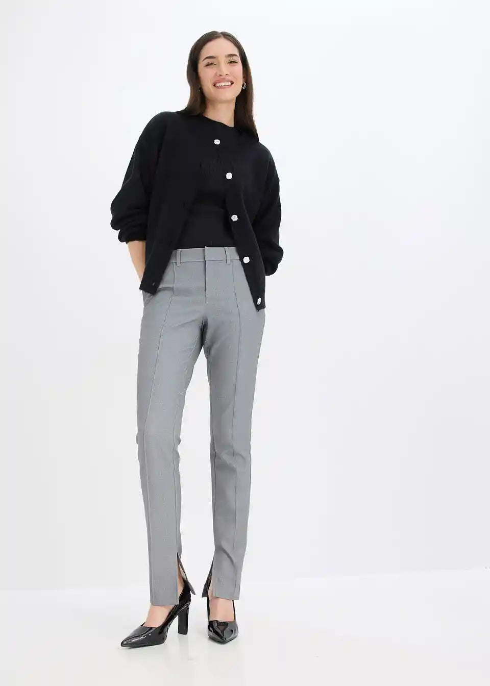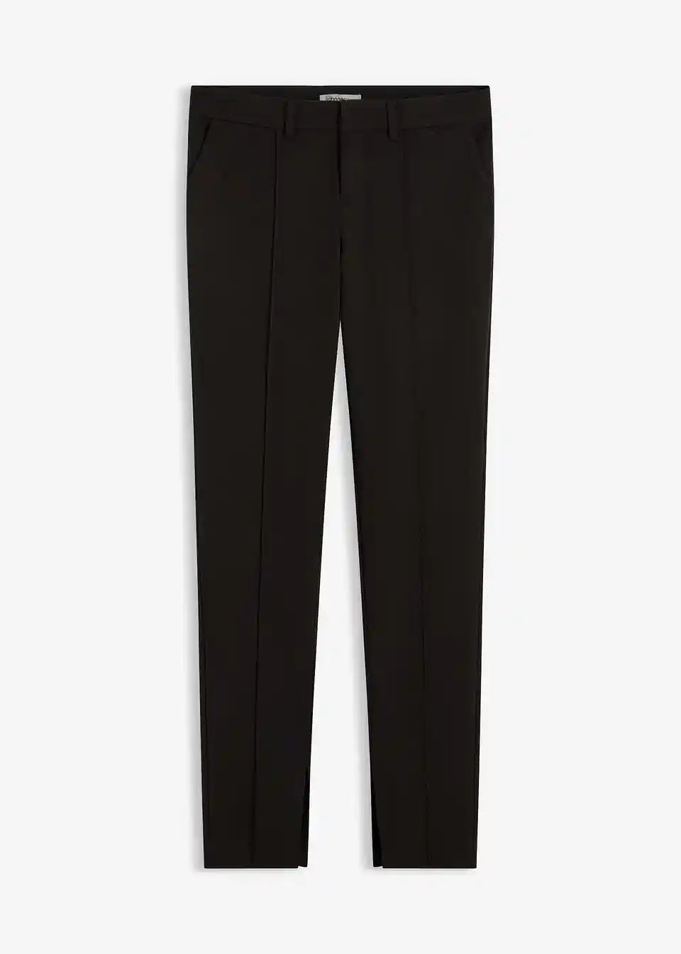 Ozke hlače s stranskimi žepi, zakritim gumbom, kljukico in zadrgo, z razporki v notranjem delu hlačnic ter z zankami za pas.