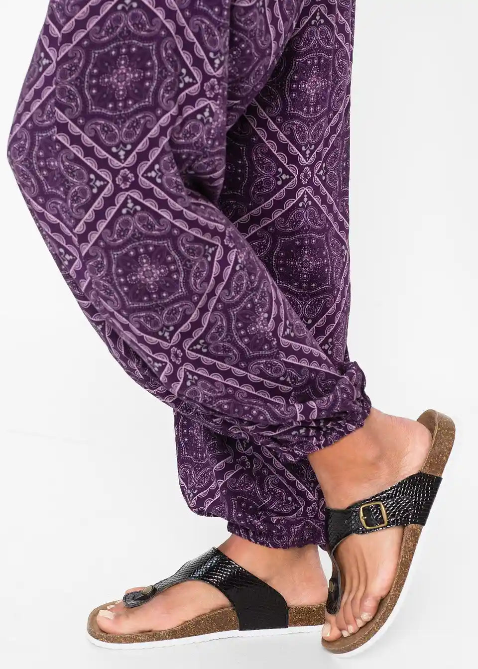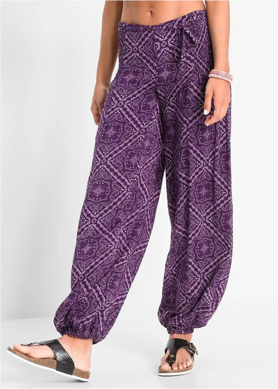 Pravi privlačne za vse, ki ljubijo sproščen slog - to so te stilske pump hlače iz lahkotnega materiala. Lahkotne hlače so povsem potiskane in imajo elastiko v pasu ter na koncu hlačnic. Gube v predelu bokov zagotavljajo sproščeno prileganje. Najbolje se prilegajo oblačilom, kot so oprijeti topi in majice.