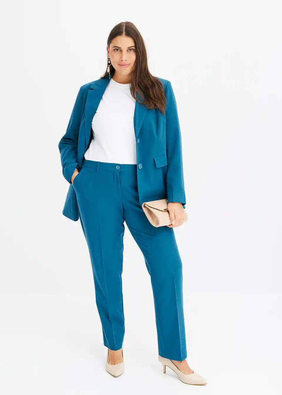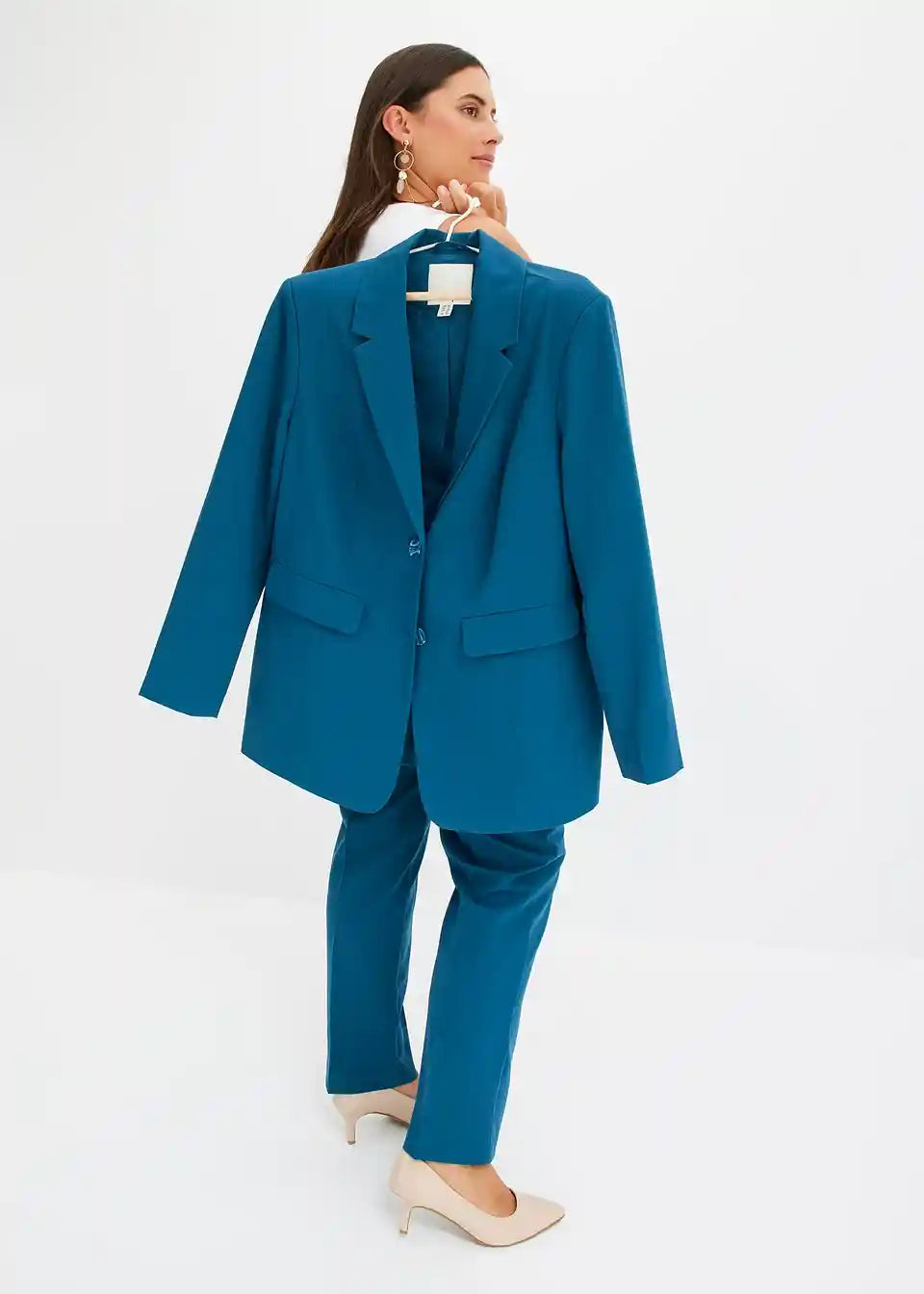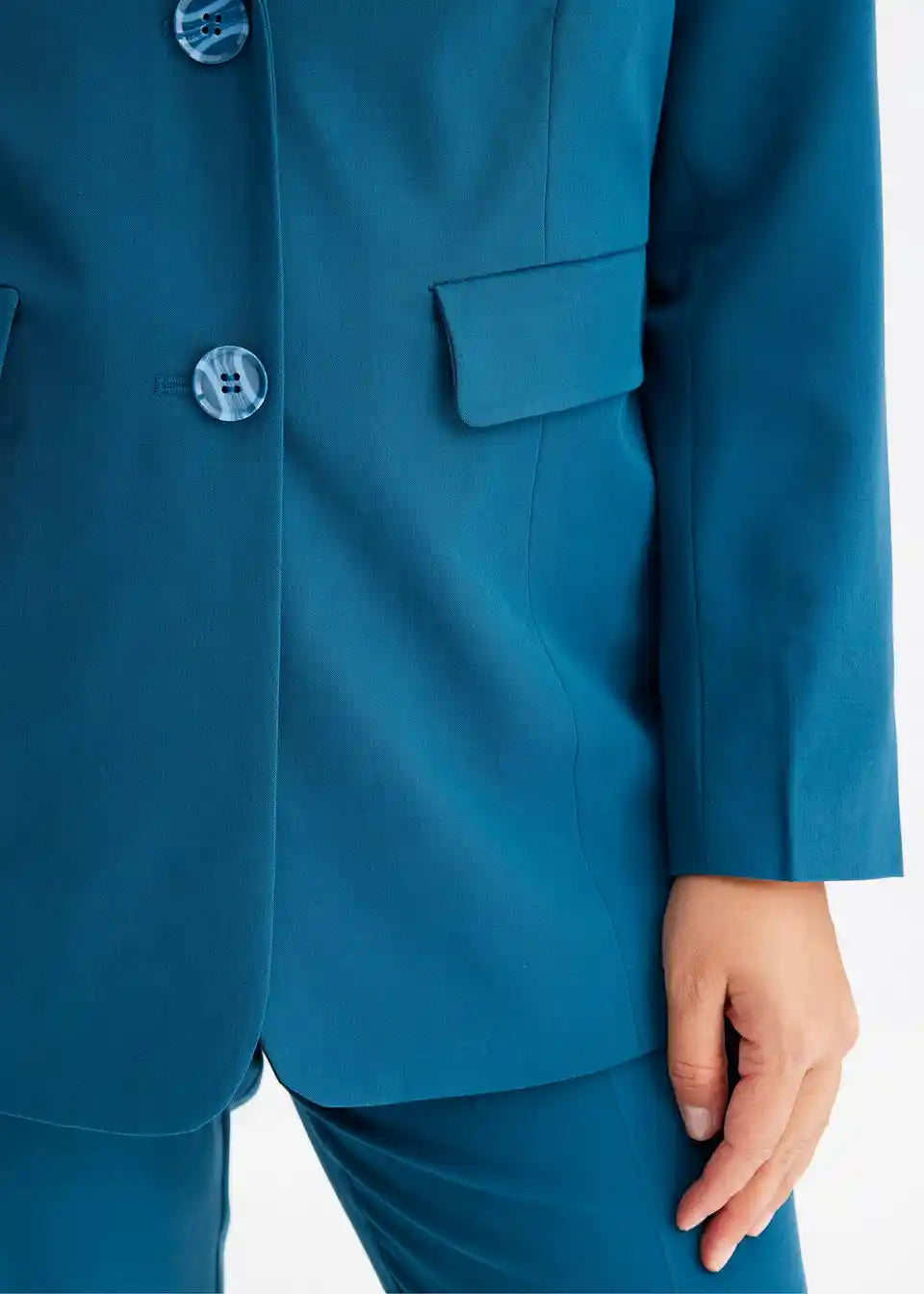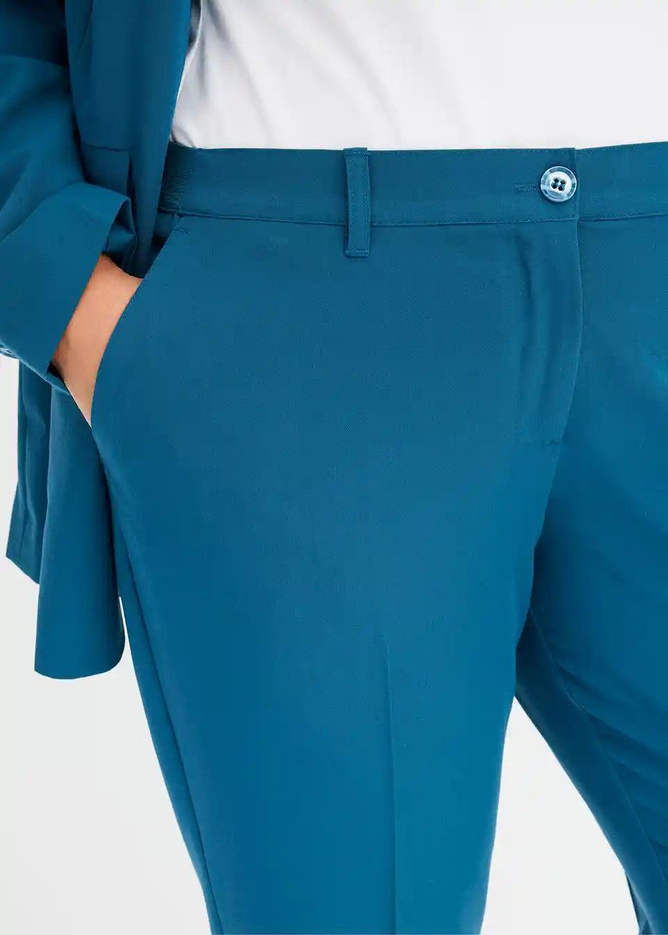 Posebnosti kroja:blazer: brez žepov, ki bi se ponosili, hlače: za veliko udobja zaradi stretcha