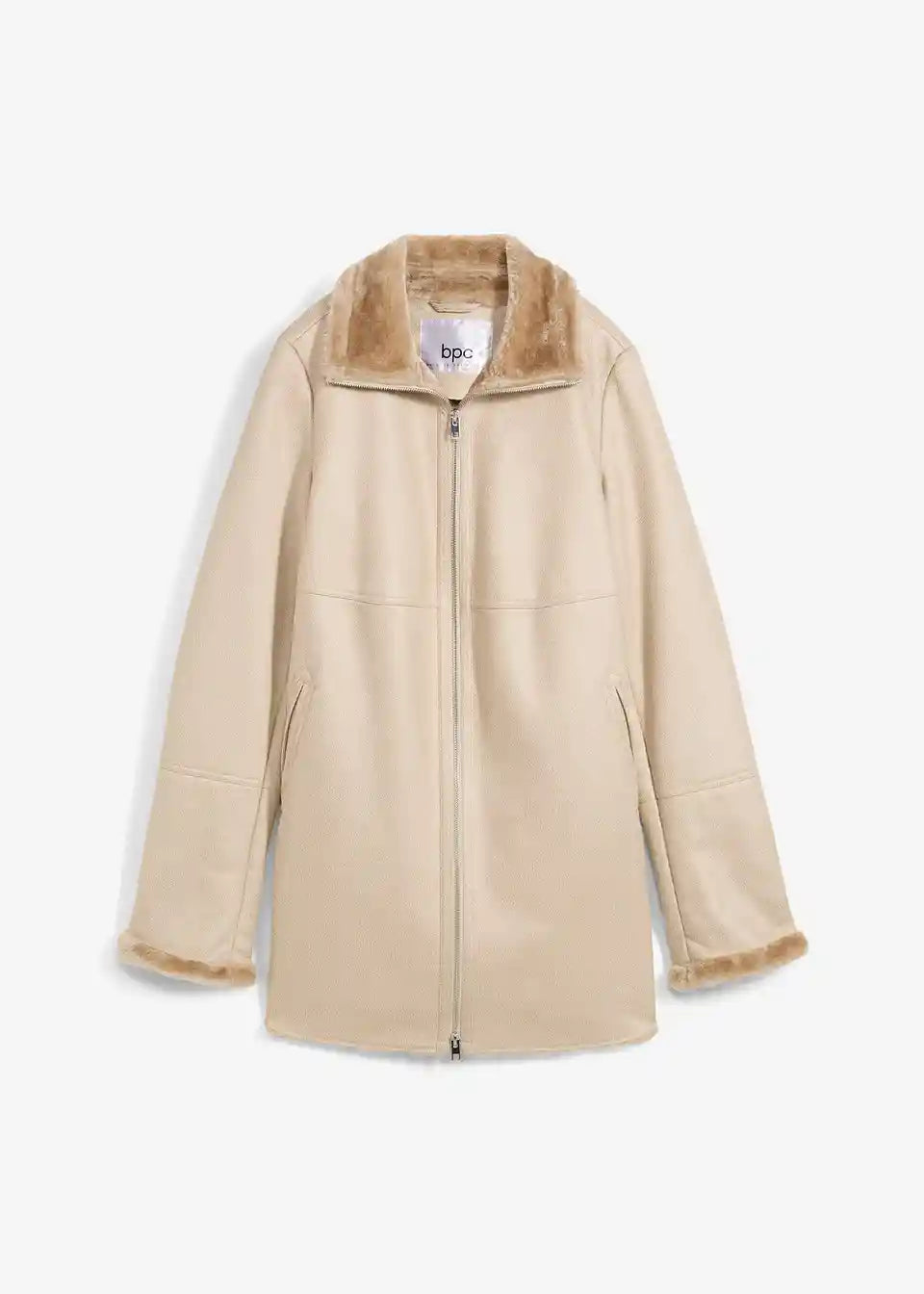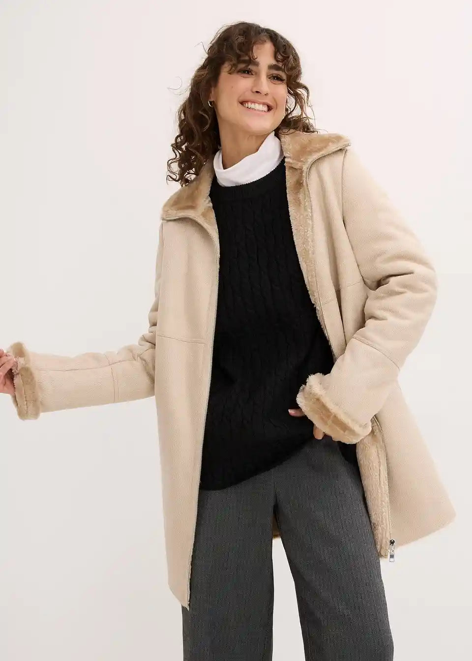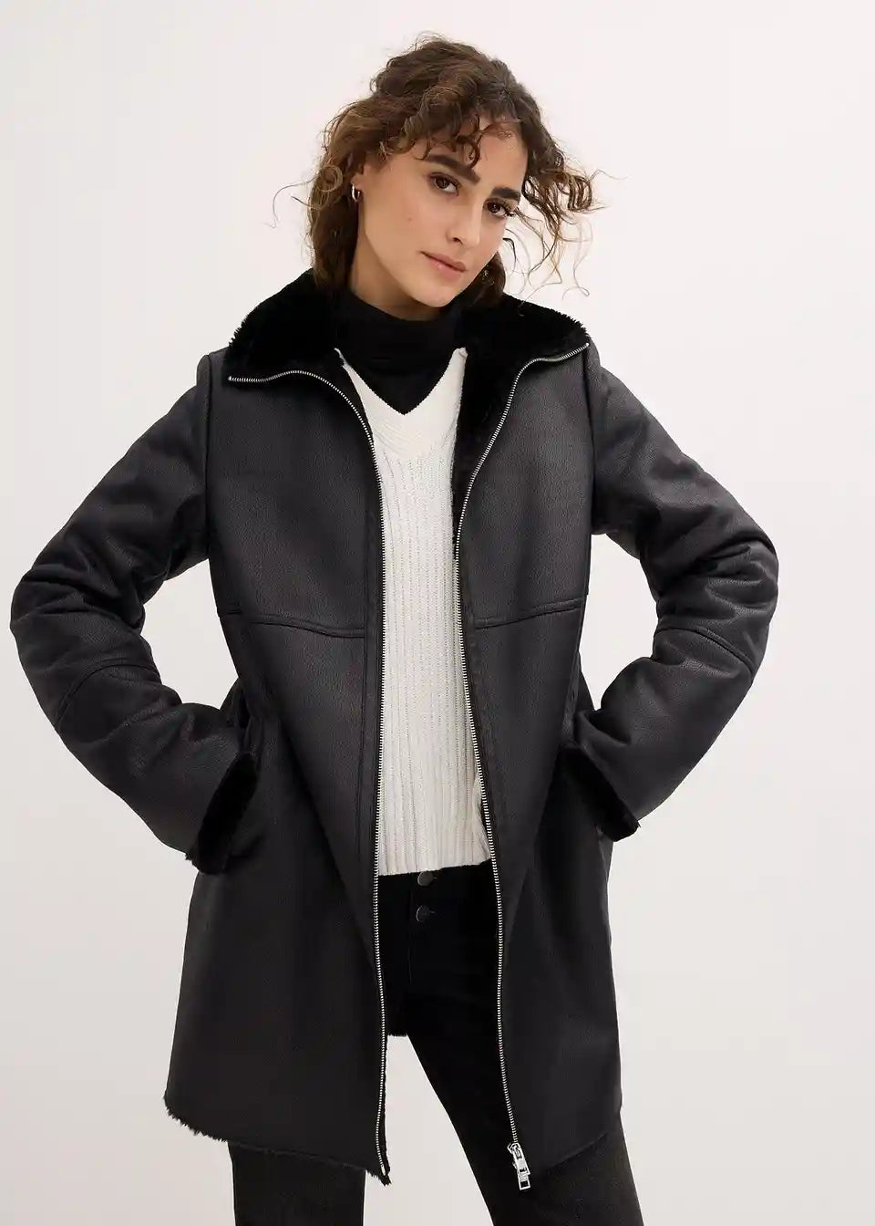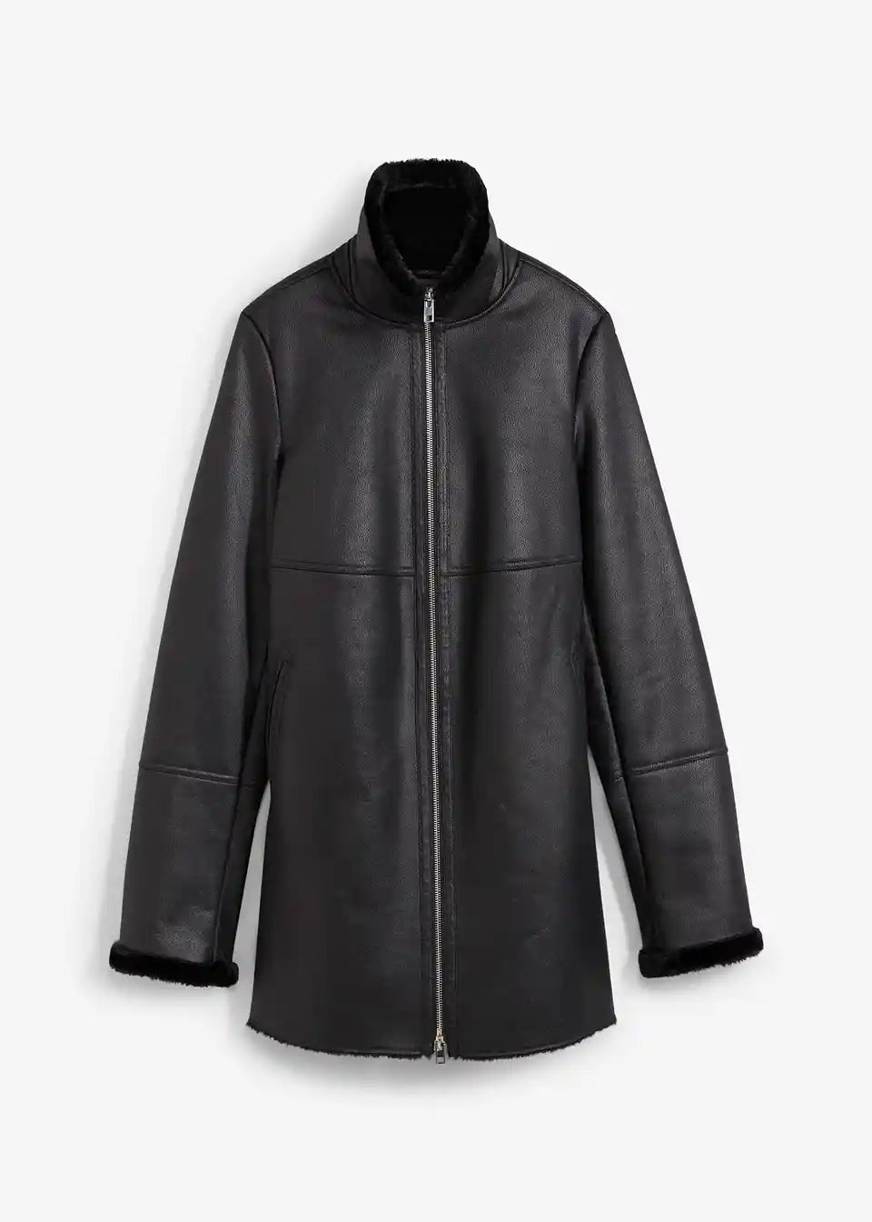 Udobna jakna iz imitacije ovčje kože s stojatim ovratnikom in žepi. Ni primerna za strojno pranje. Čistite samo kemično.