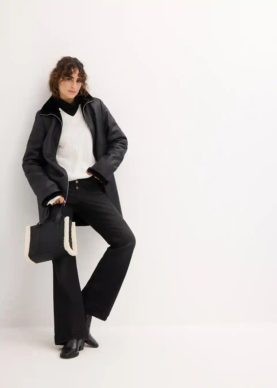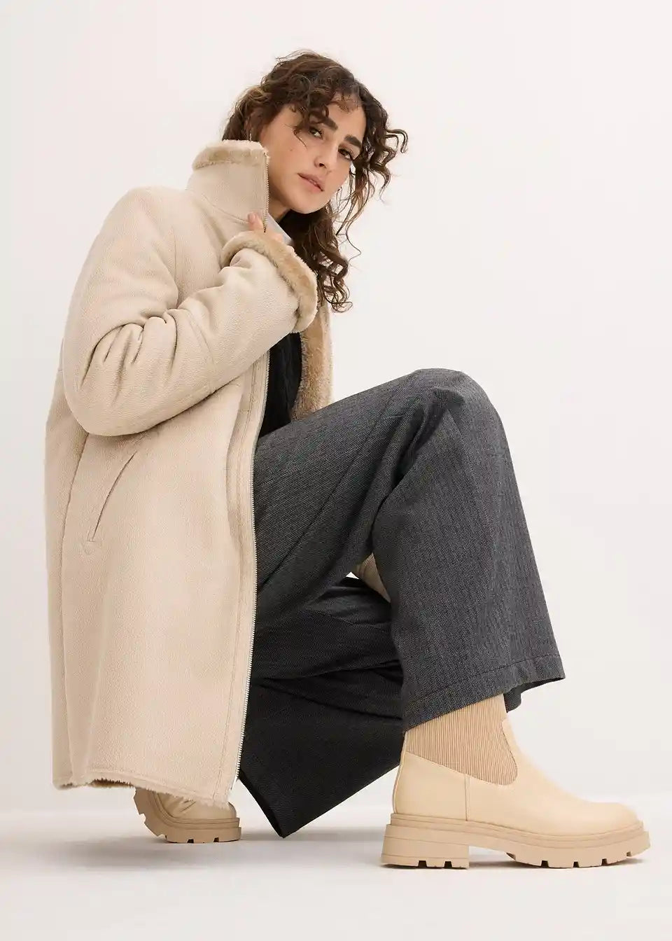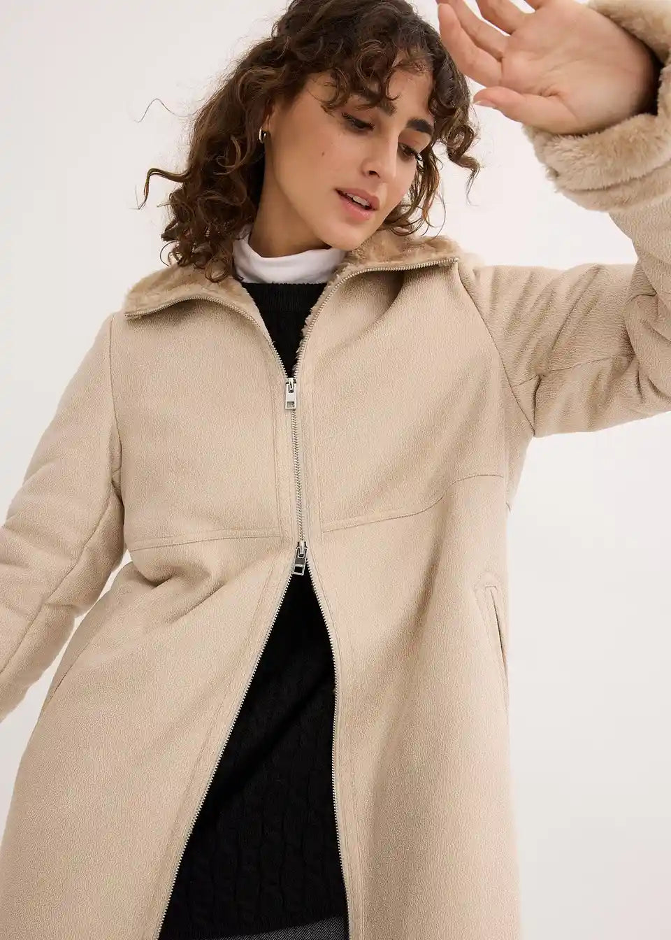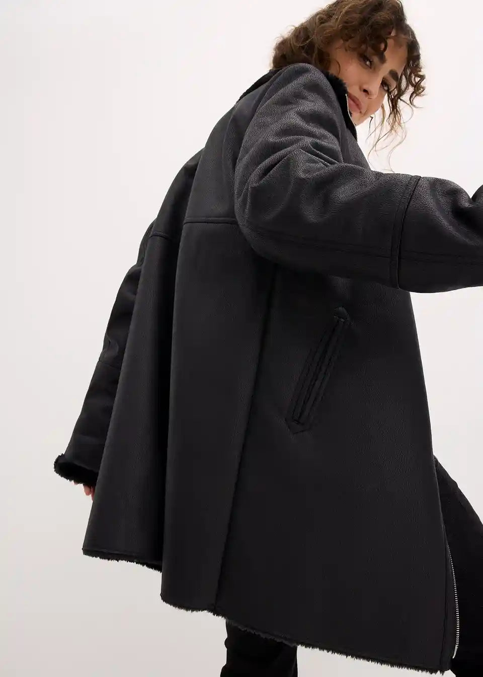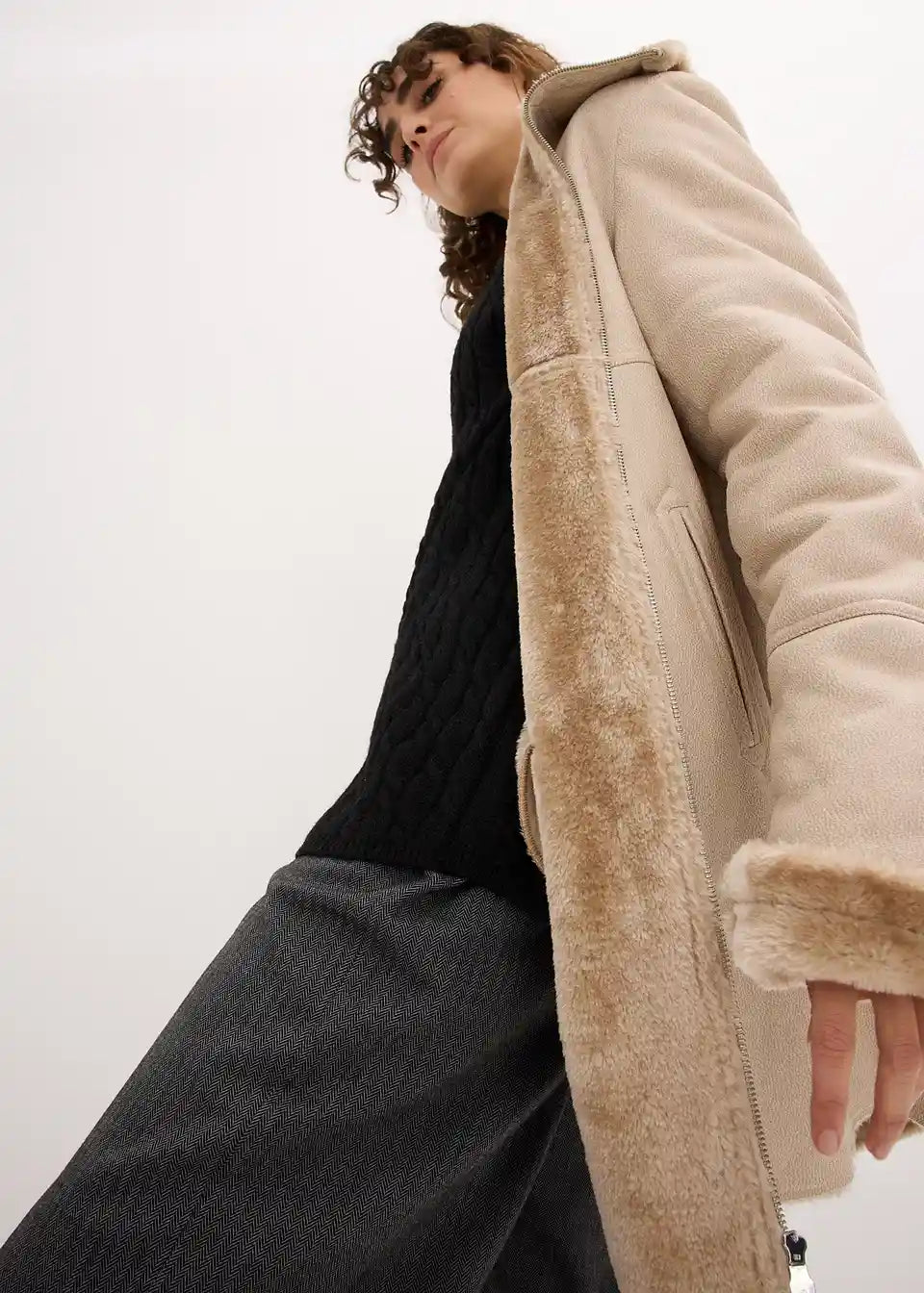 Udobna jakna iz imitacije ovčje kože s stojatim ovratnikom in žepi. Ni primerna za strojno pranje. Čistite samo kemično.