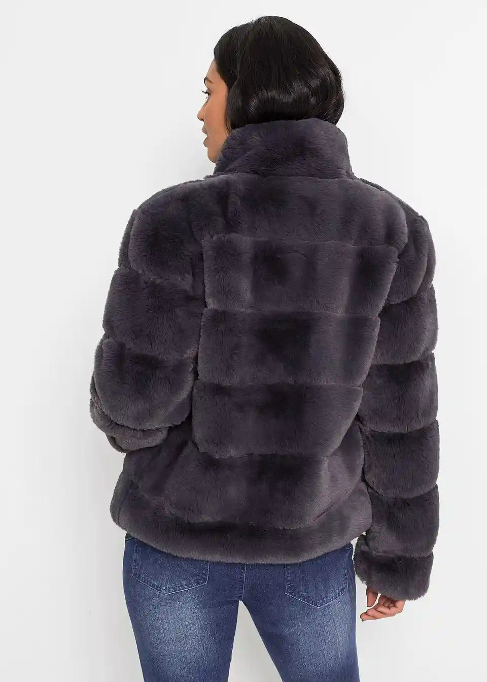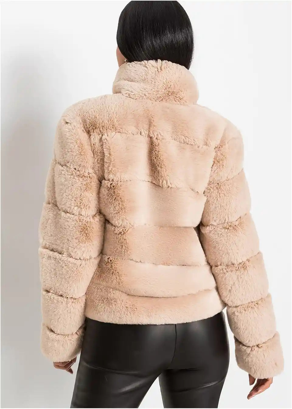 Modna jakna iz umetnega krzna z zadrgo in sprednjimi žepi. Dolžina pri velikosti 38 približno 62 cm.