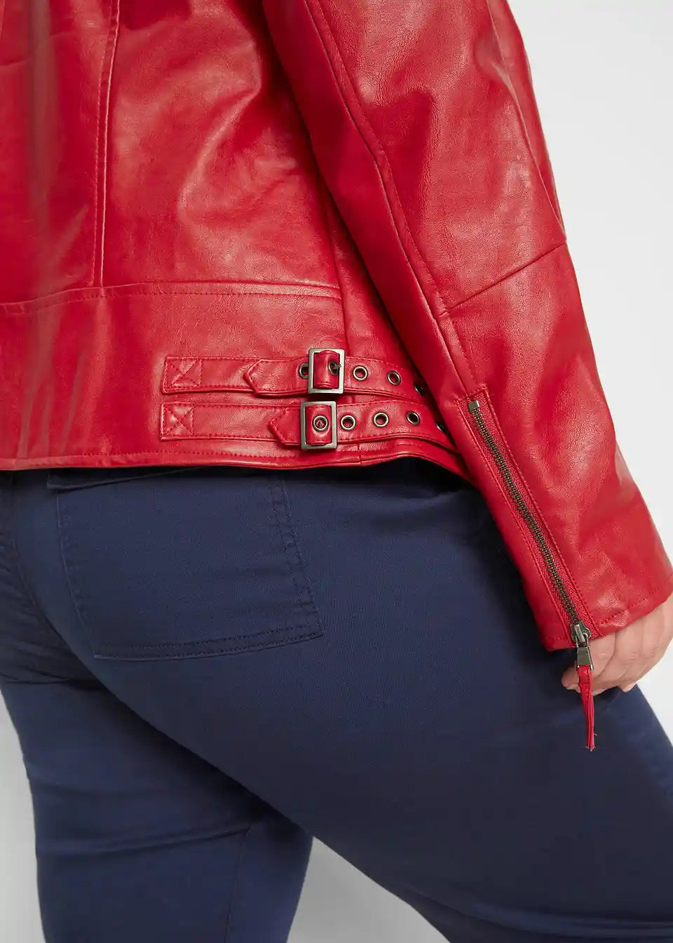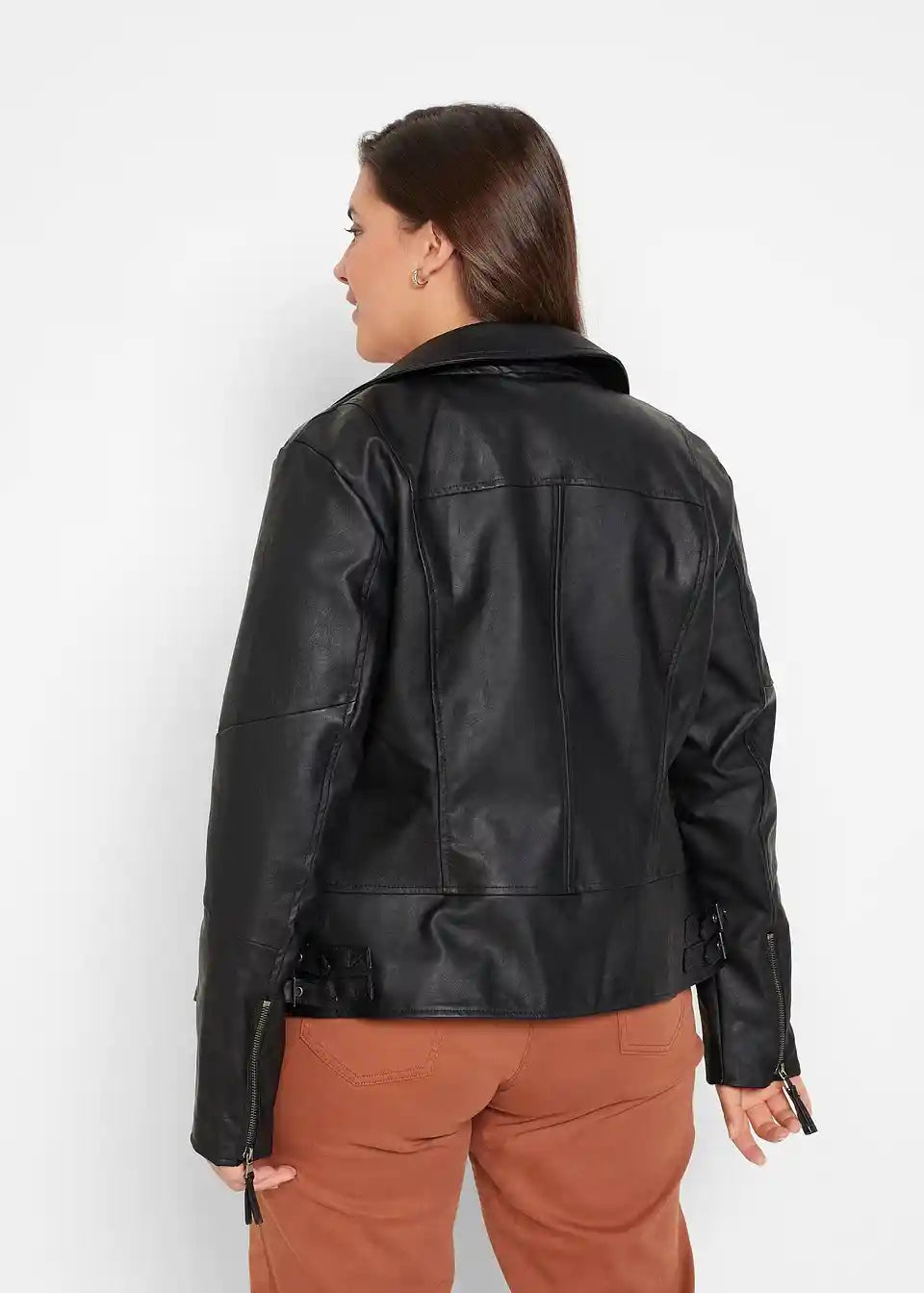 Vsestranka jakna iz umetnega usnja v biker videzu s paski v predelu bokov