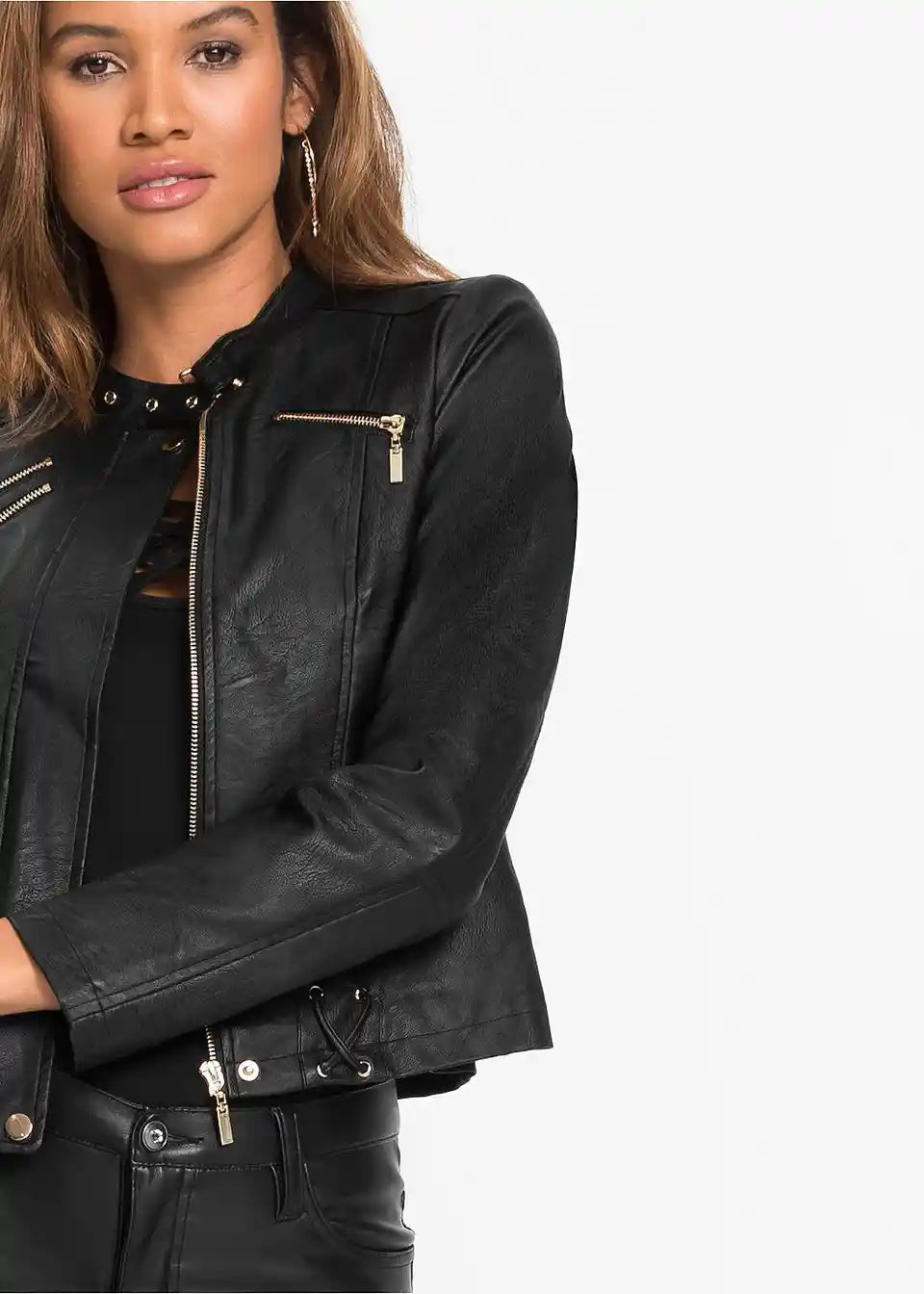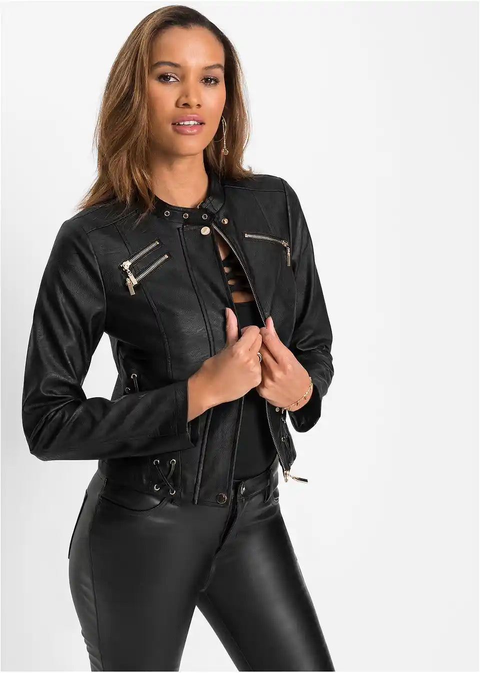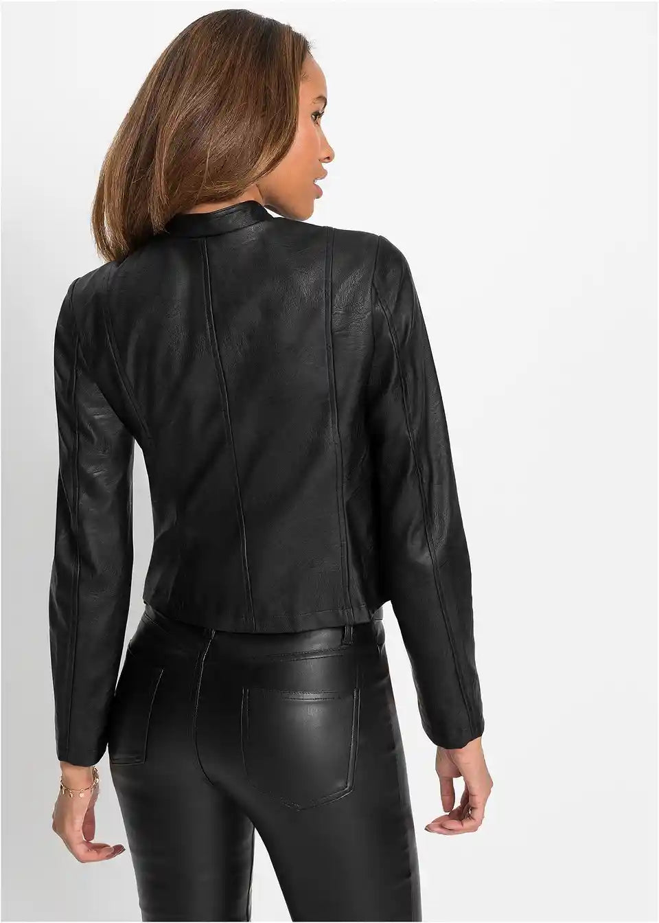 Skrajšana jakna iz umetnega usnja z očarljivim dizajnom poskrbi za privlačen videz in doda obleki kul pridih. Dolžina pri velikosti 38 približno 55 cm.