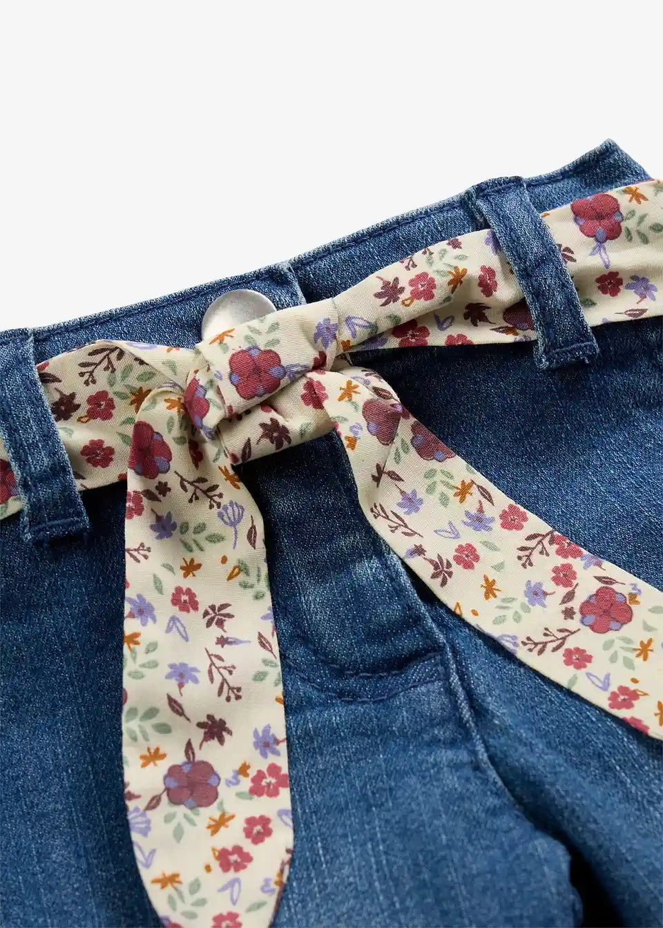 Jeans hlače iz opranega in prožnega stretch denima v mešanici bombaža za maksimalno udobje. Nastavljiv elastičen pas s pritiskačem in zadrgo. Okrasni žepi spredaj in pravi žepi zadaj. Zavezovalni trak s cvetličnim potiskom za okrasitev hlač.