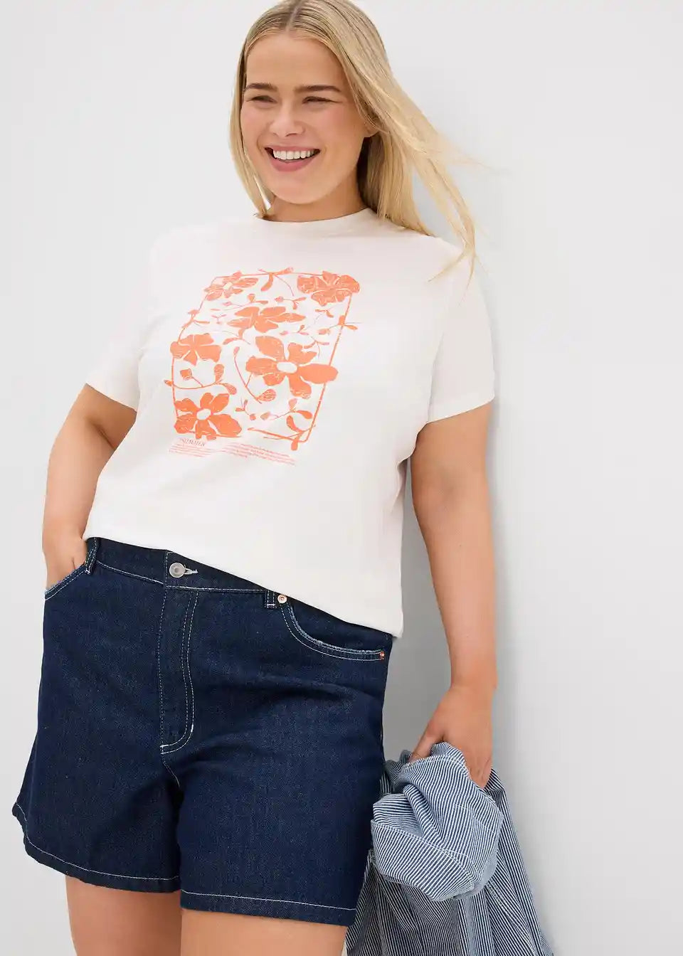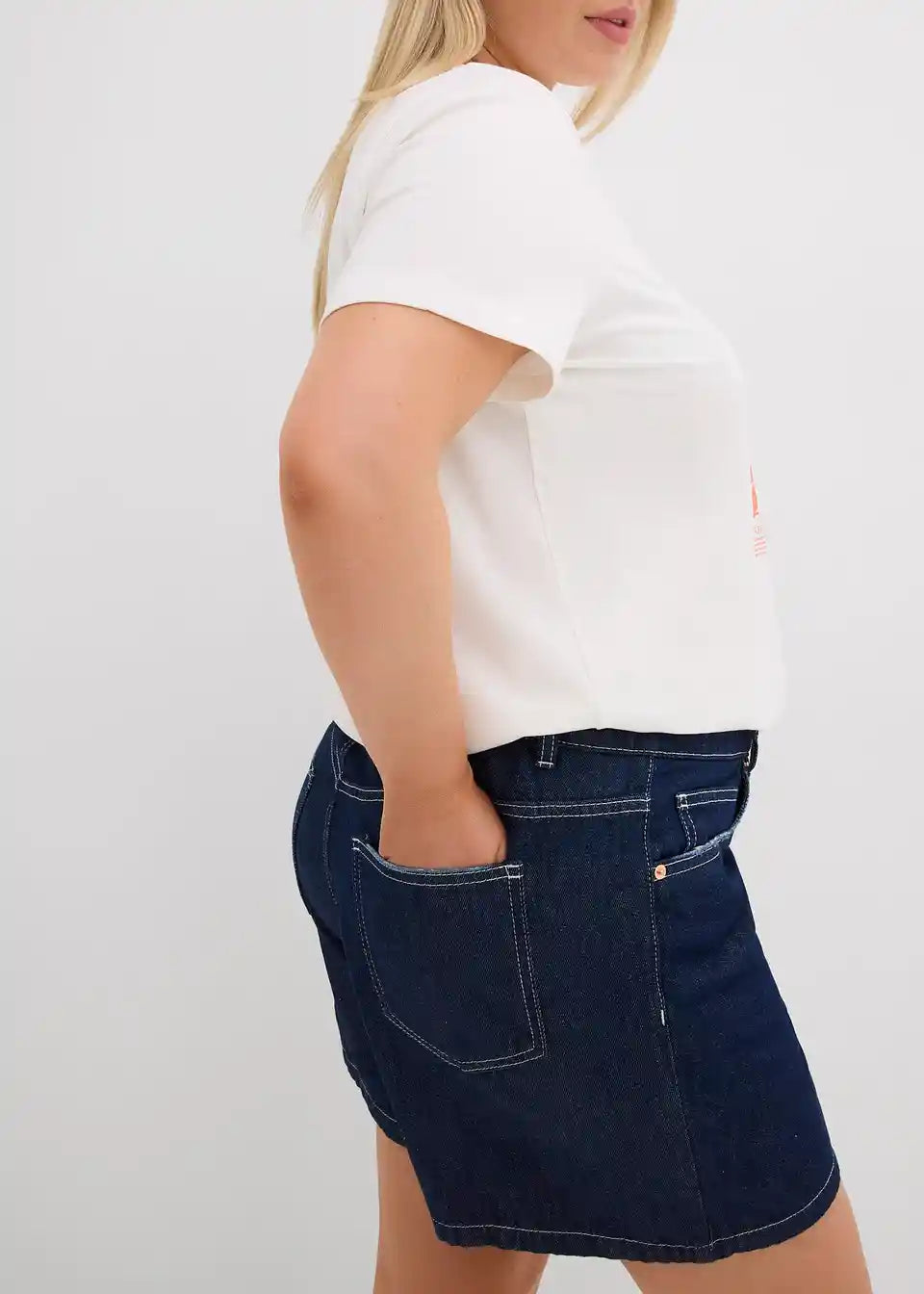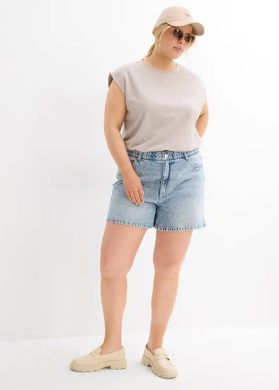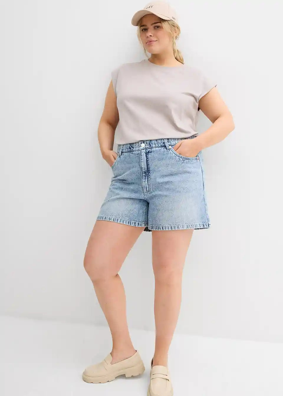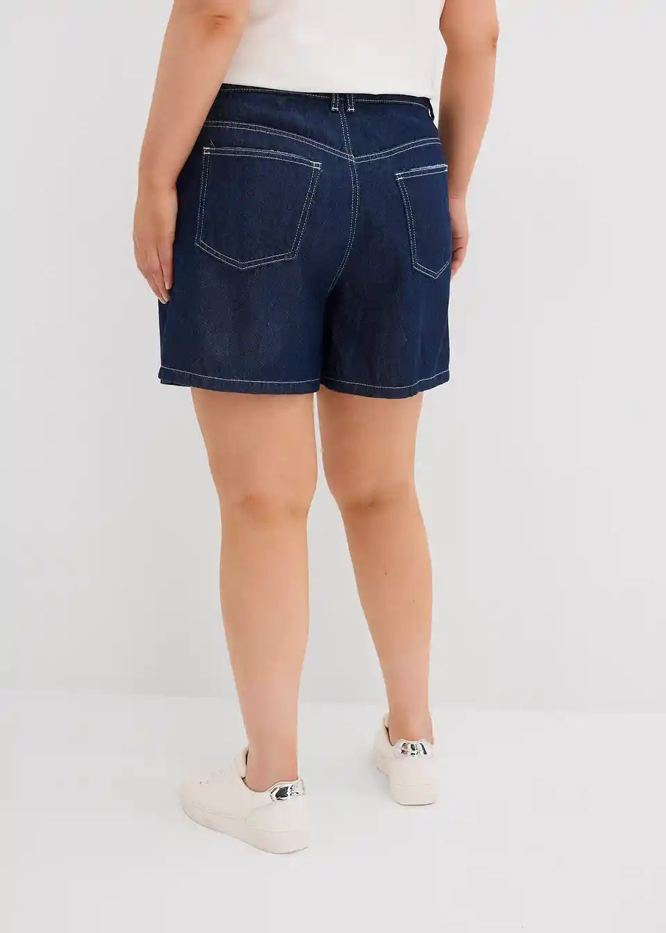 Ohlapne 5-žepne kratke hlače iz trdnega bombažnega denima, ki je sprva nekoliko trd, z nošenjem pa postane mehkejši in bolj udoben. Visok pas z zadrgo in gumbom. Dolžina notranjega šiva pri velikosti 42 cca 11,5 cm, primerno za pranje v pralnem stroju.