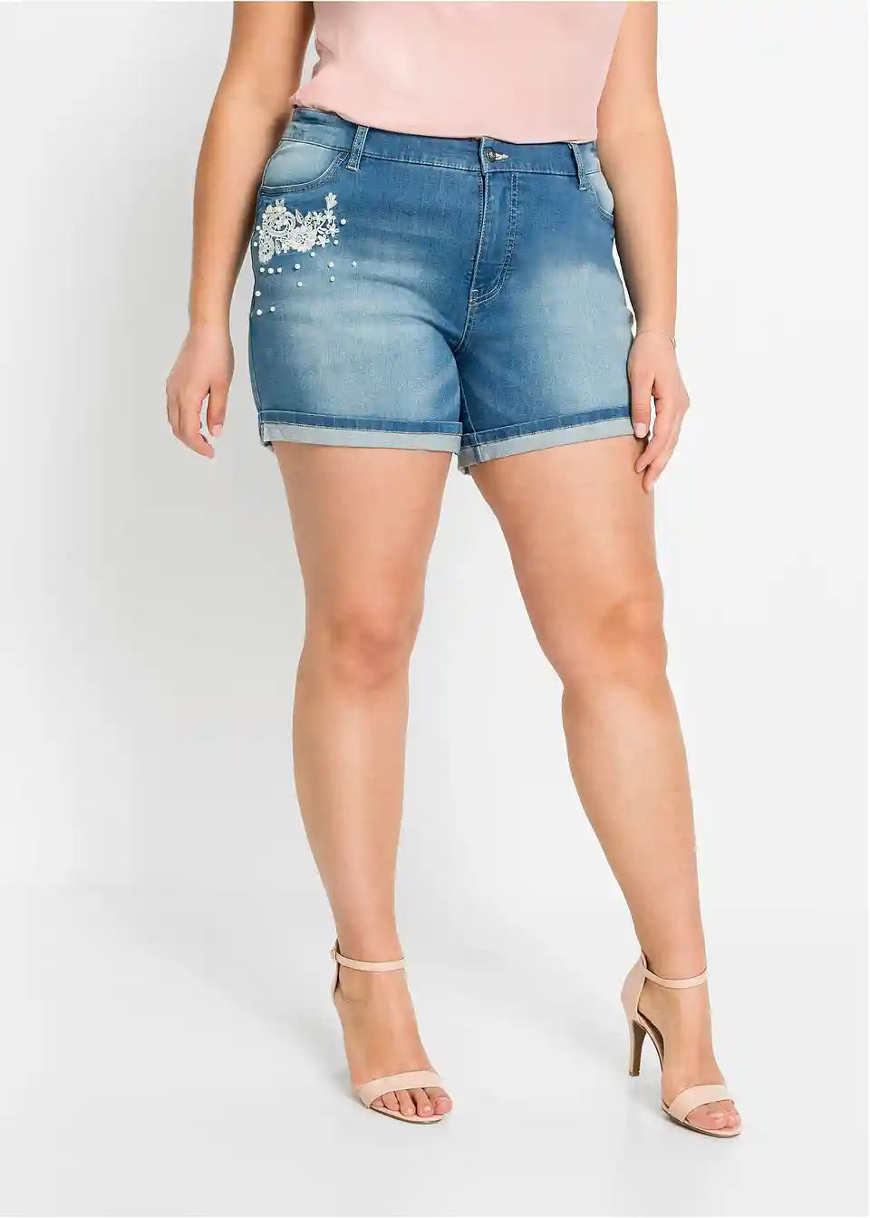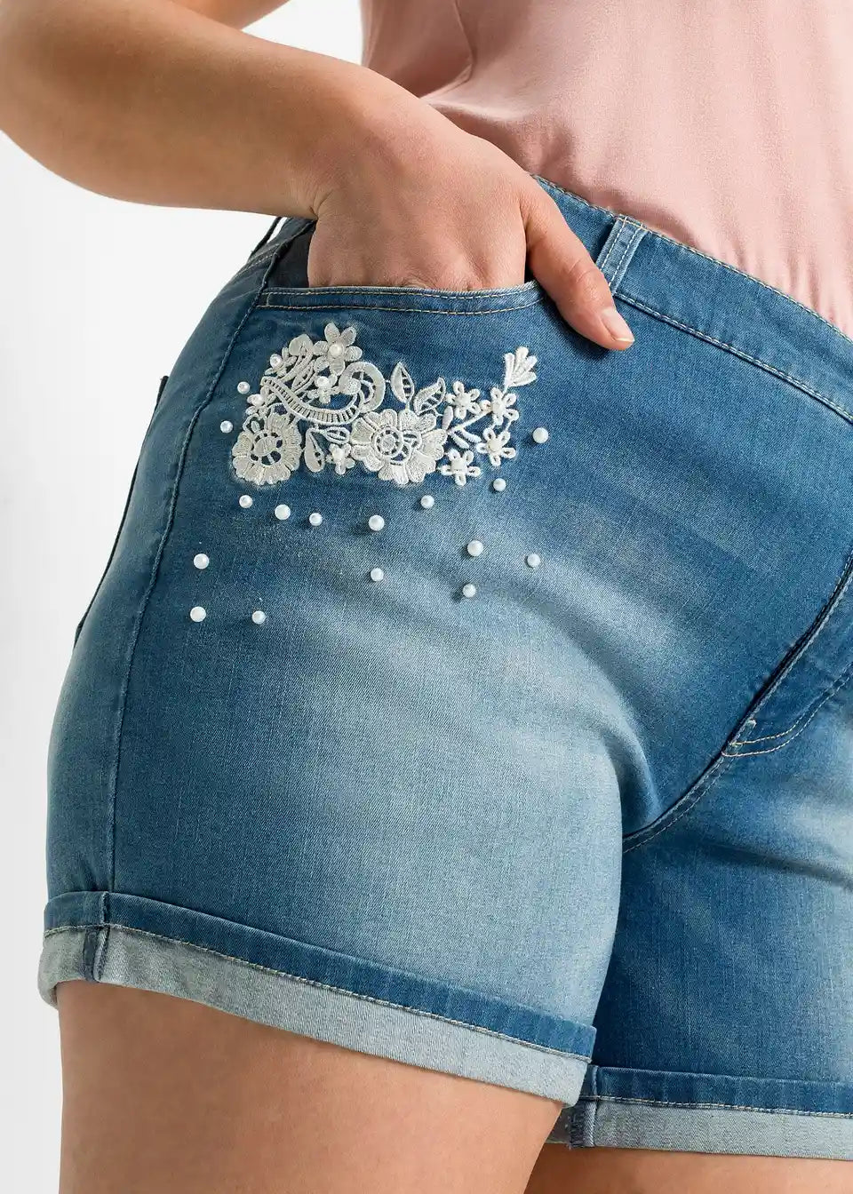 Poletne jeans kratke hlače s stilskim čipkastim vložkom in okrasnimi biseri.