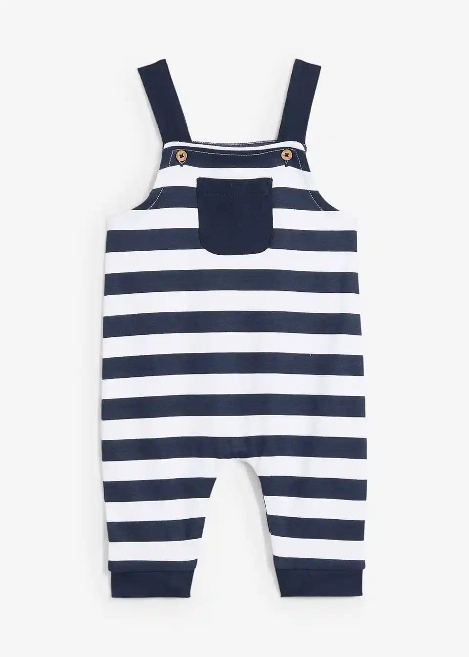 Hlače z naramnicami iz čiste organske bombažne tkanine v mornarskem videzu s črtastim dizajnom. Naramnice z lesenimi gumbi spredaj za nastavitev in pritiskači znotraj za lažji dostop. Overall ima majhen žep spredaj in elastične zaključke na hlačnicah. Idealno za deklice in dečke.