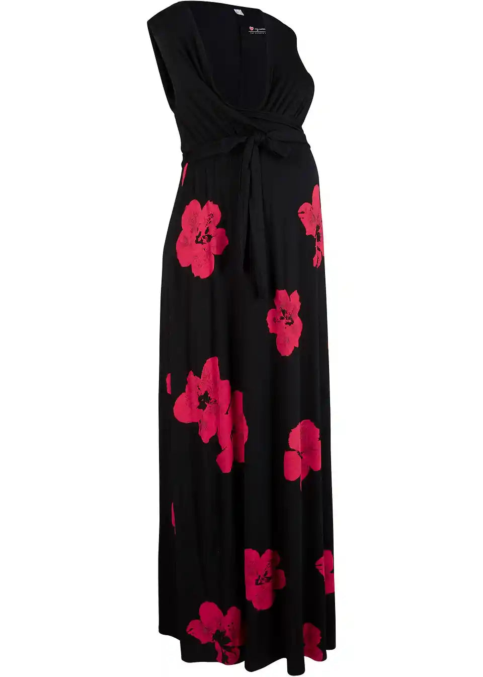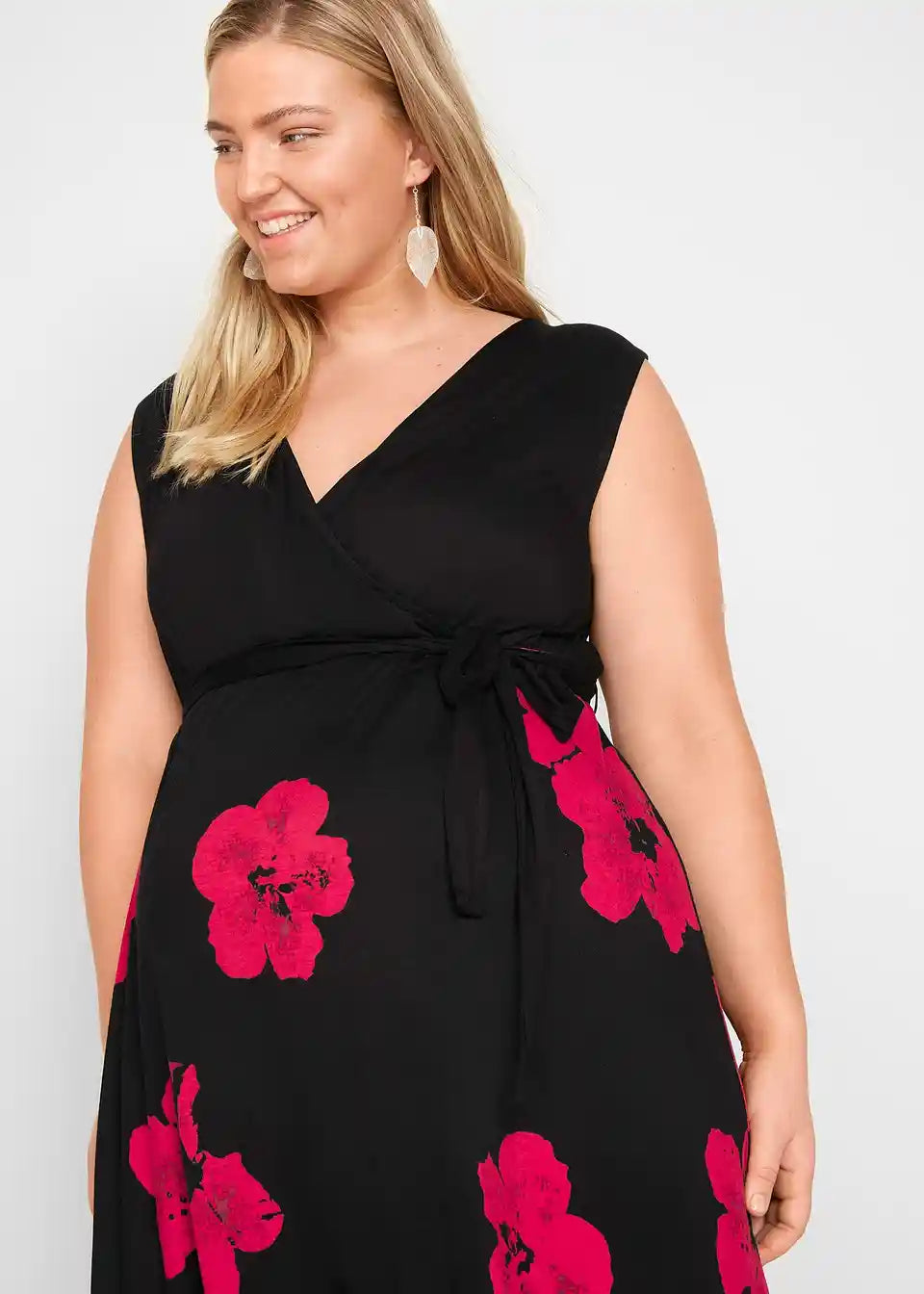 Ta svečana nosečniška obleka z rožnim potiskom raste skupaj s trebuhom, kar omogoča nošenje med nosečnostjo in po njej. Sprednji prekrivajoči del omogoča preprosto dojenje.