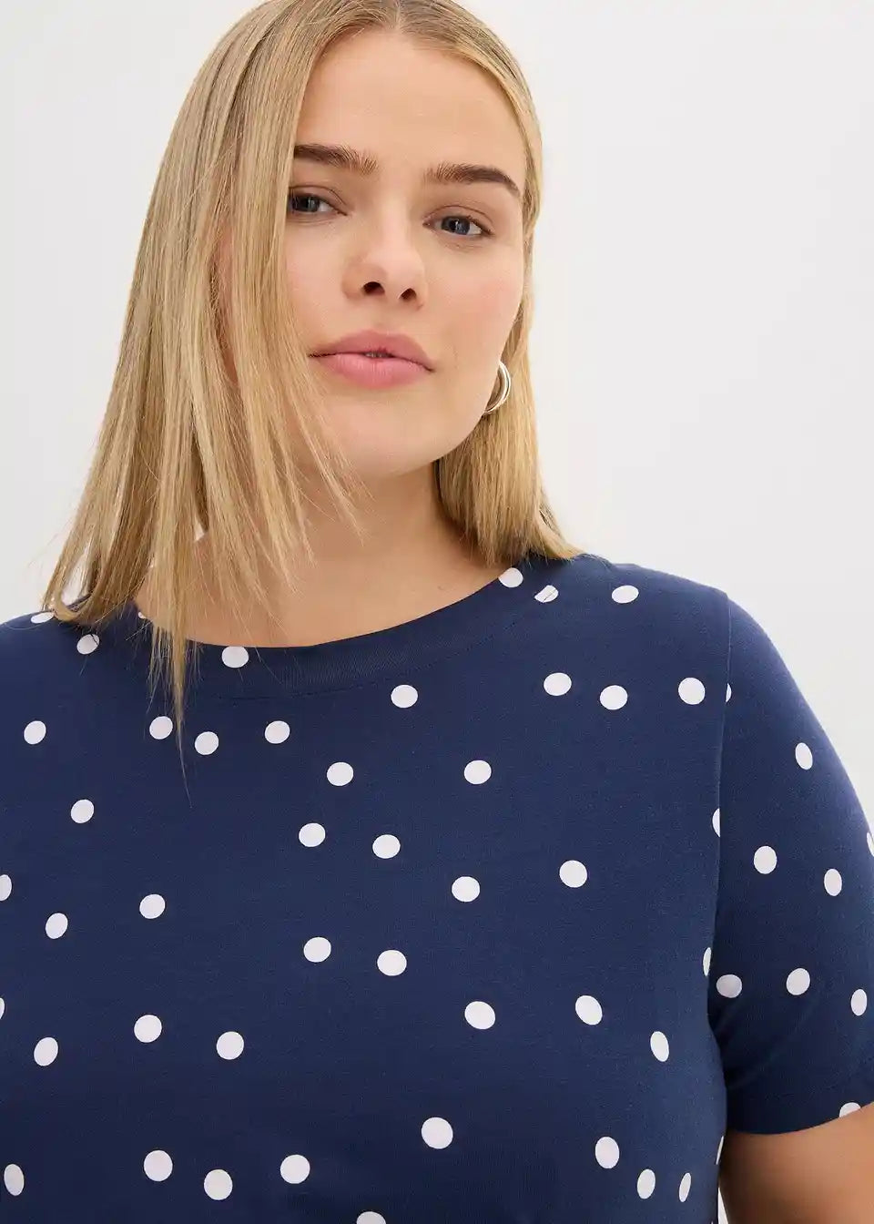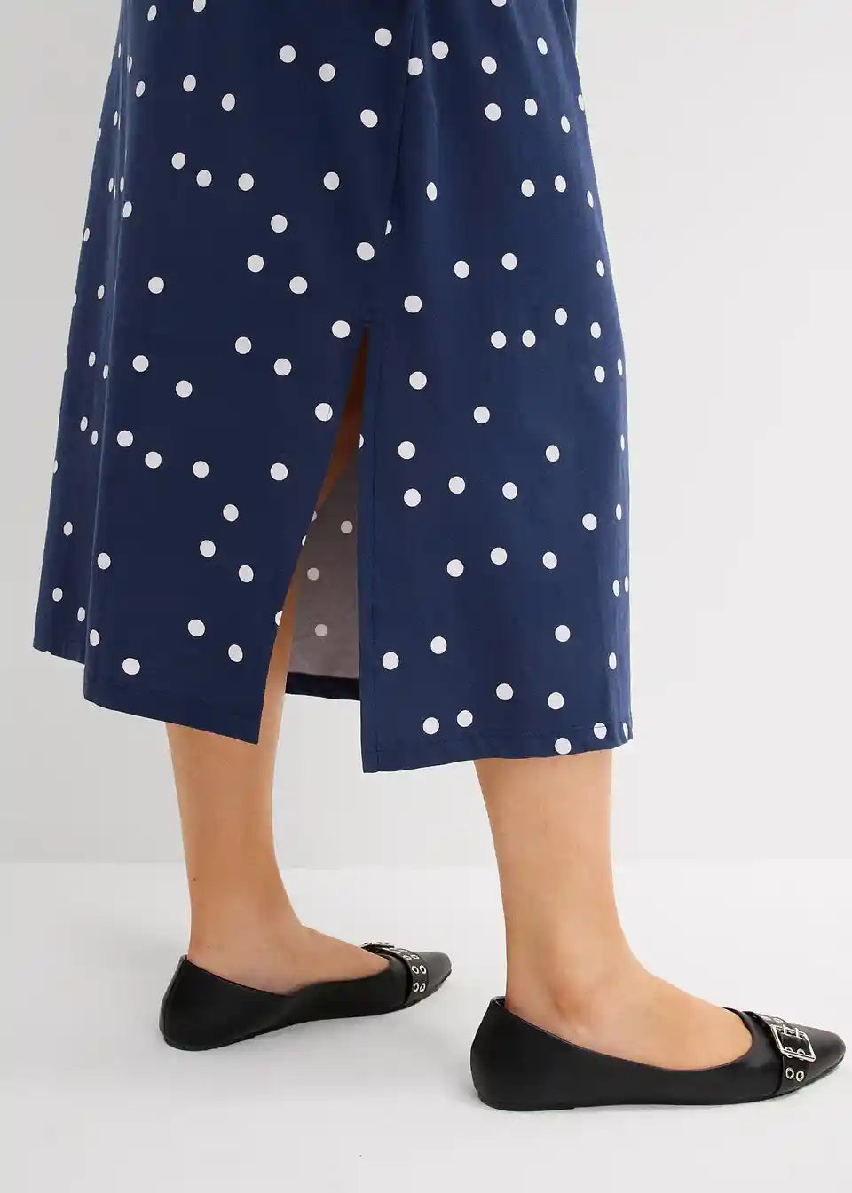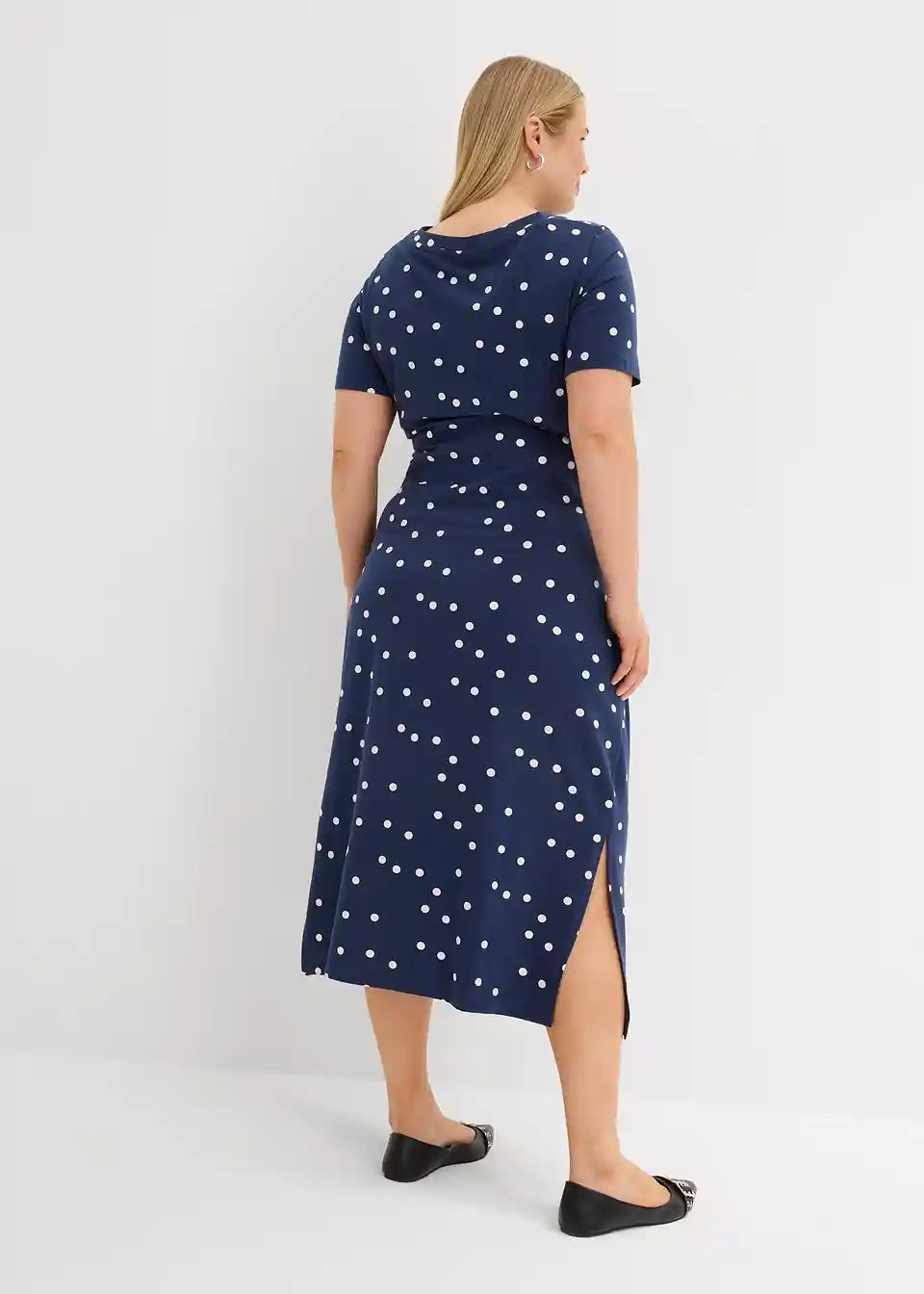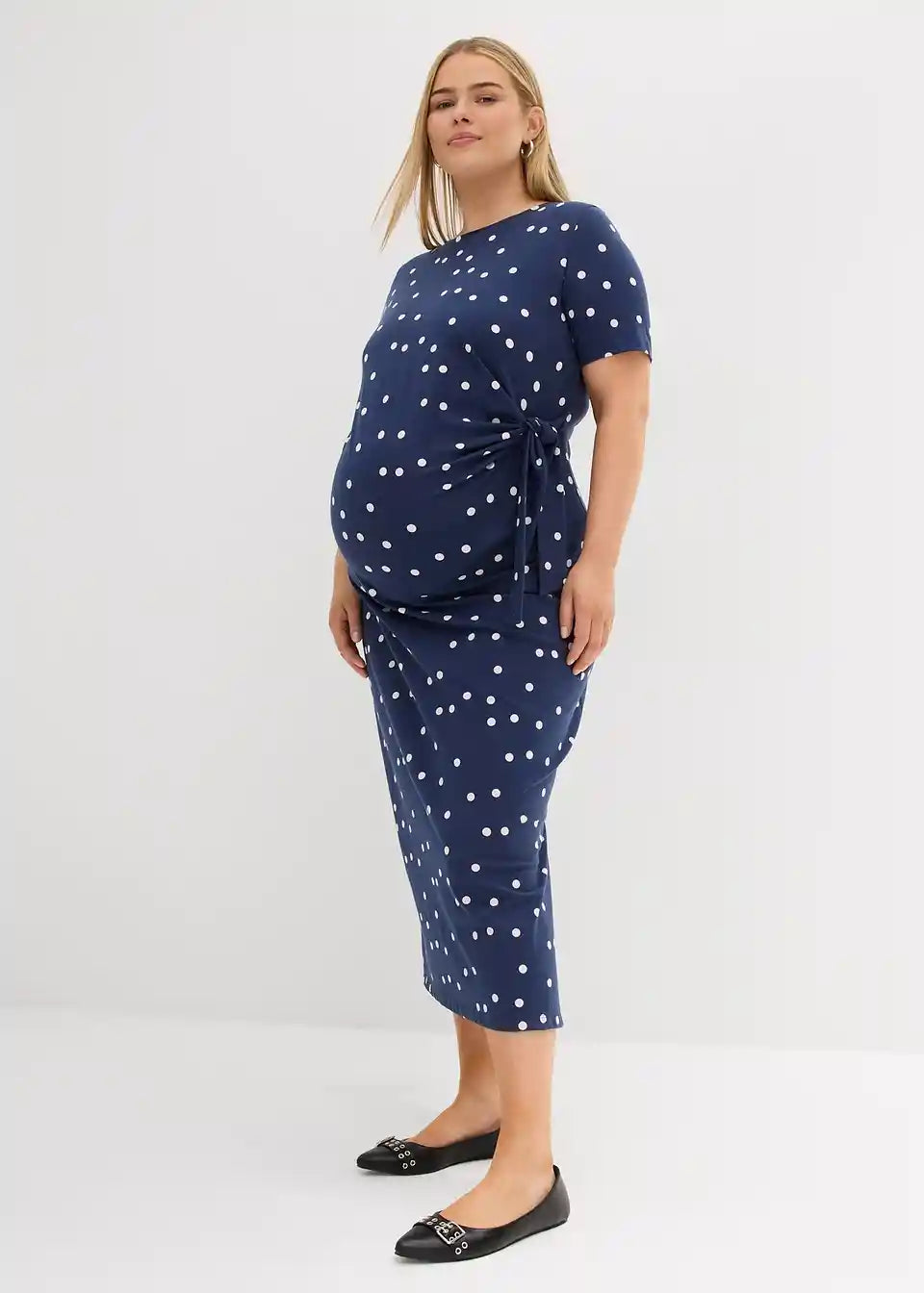 Mehka jersey nosečniška obleka iz bio bombaža z okroglim izrezom in kratkimi rokavi prijetne dolžine. Poletna obleka ima lep vzorec s pikami in stranske razporke na robu. Okrasen vozel poudari prikupen nosečniški trebušček.