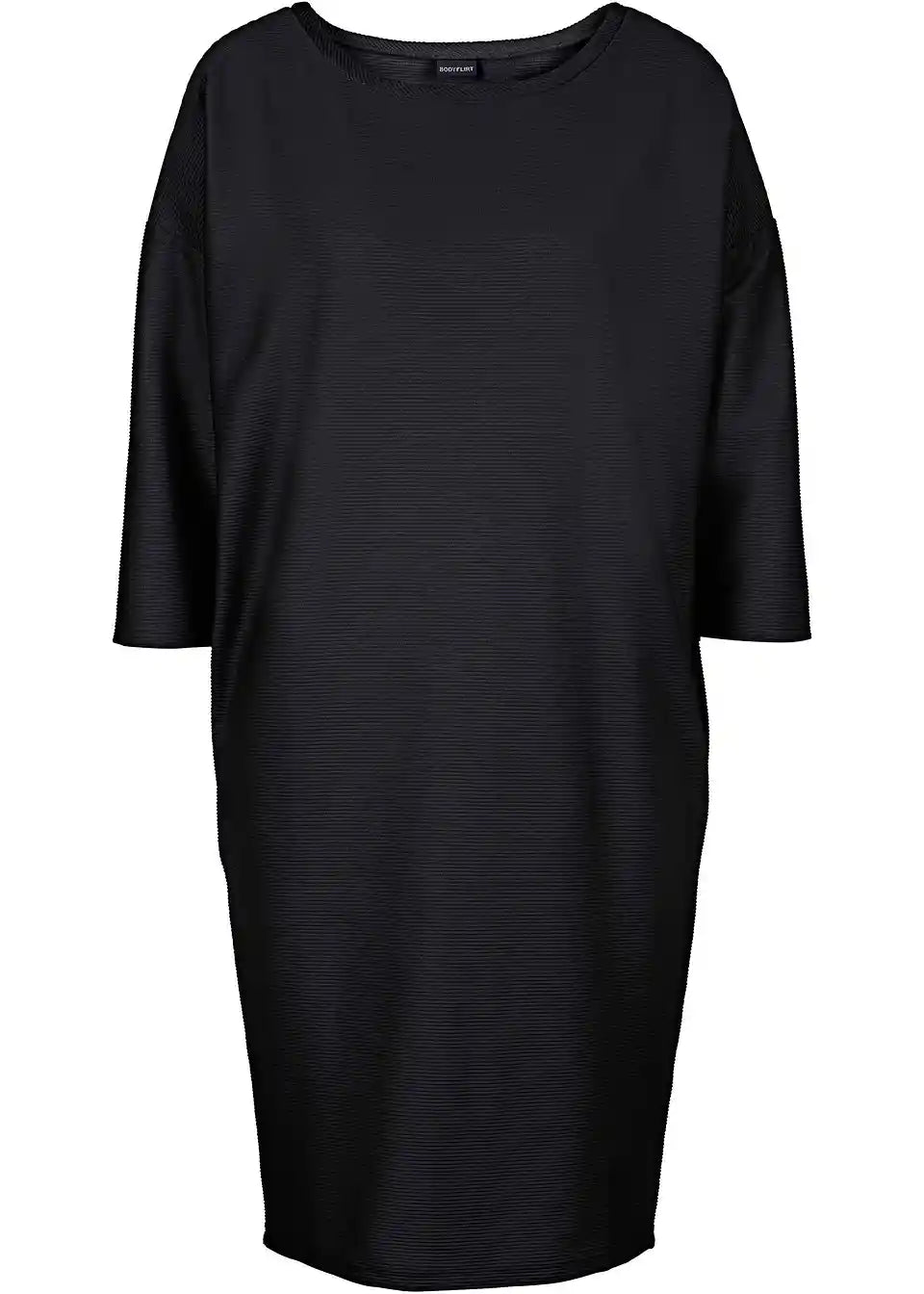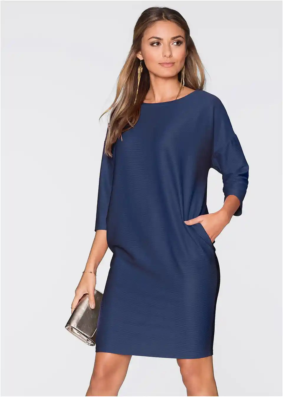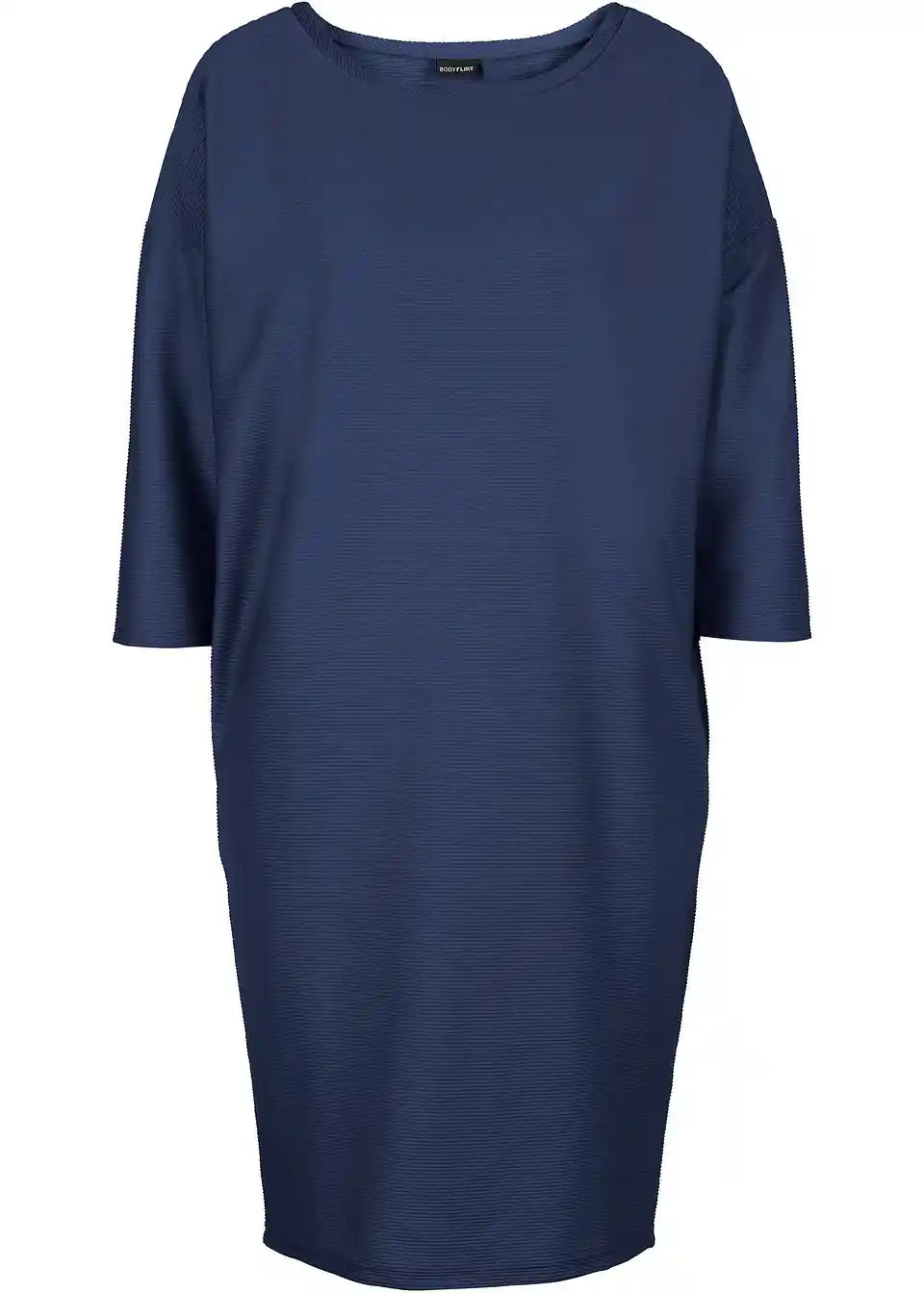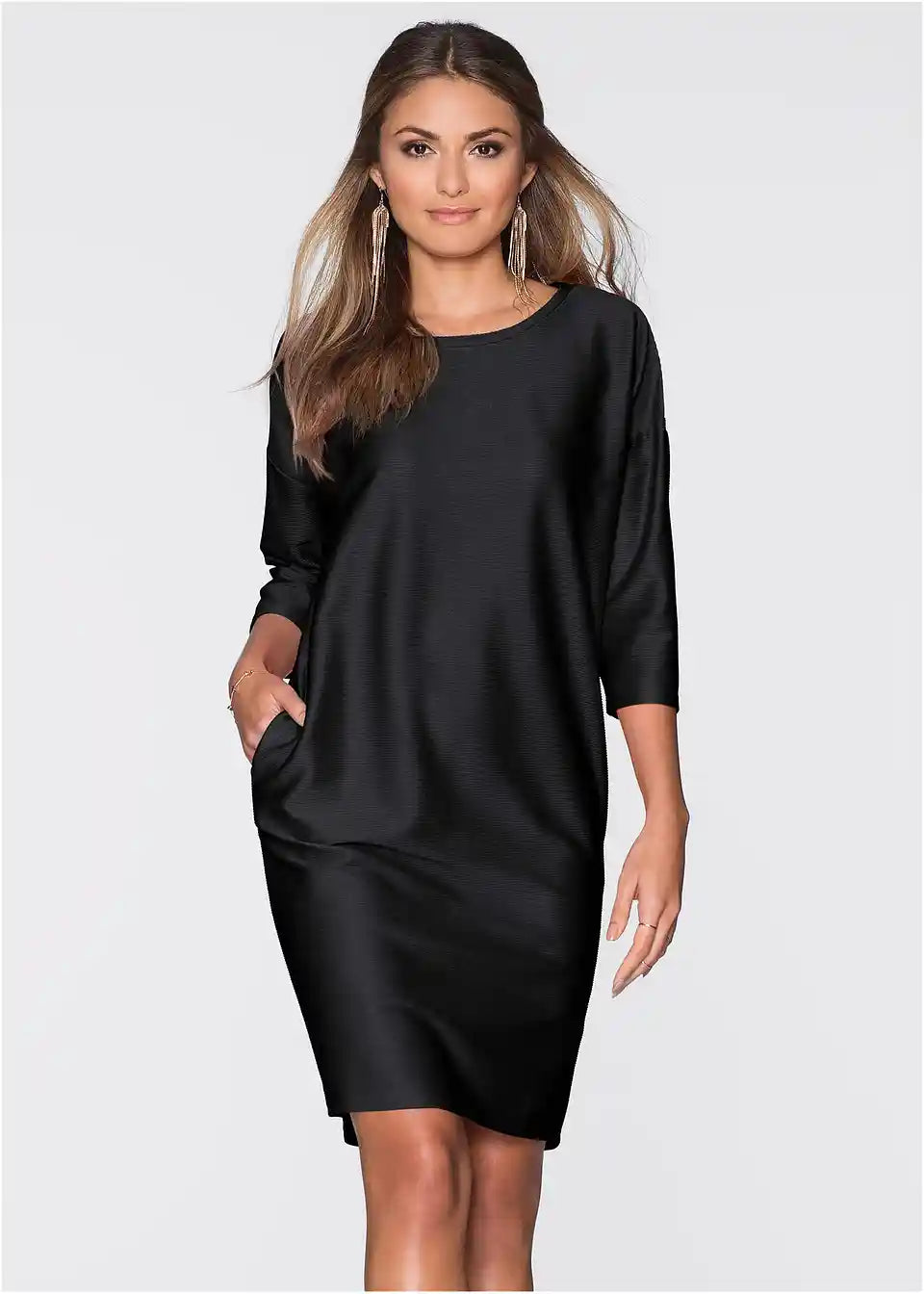 Osnovni videz v jersey strukturi z rebrastim vzorcem. Okrogel izrez, 3/4 rokavi in žepi na straneh. Dolžina pri vel. 40/42 pribl. 96 cm.