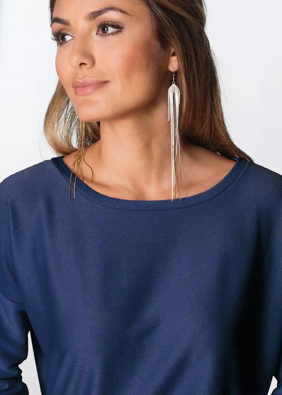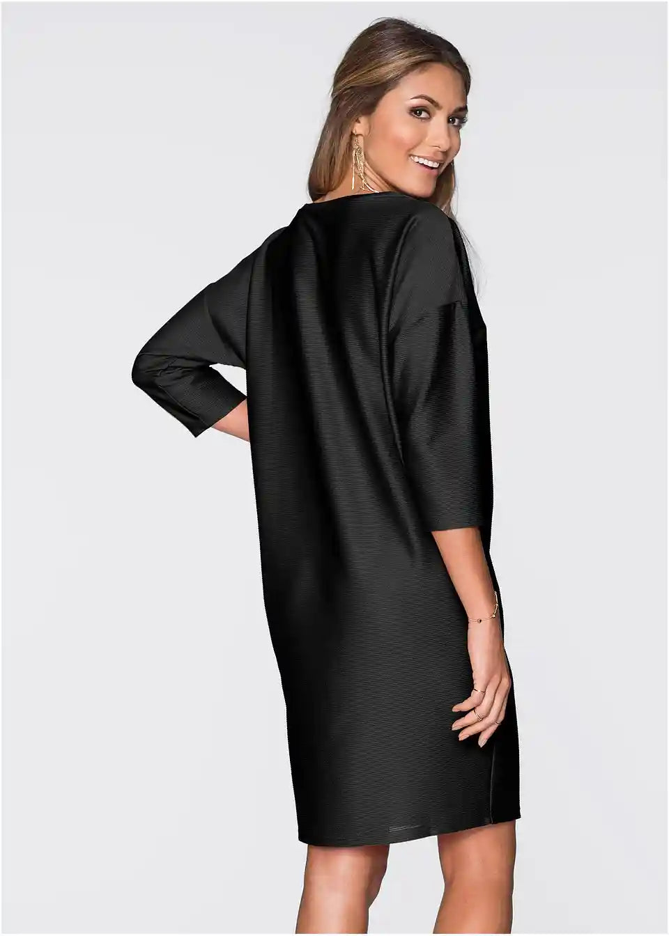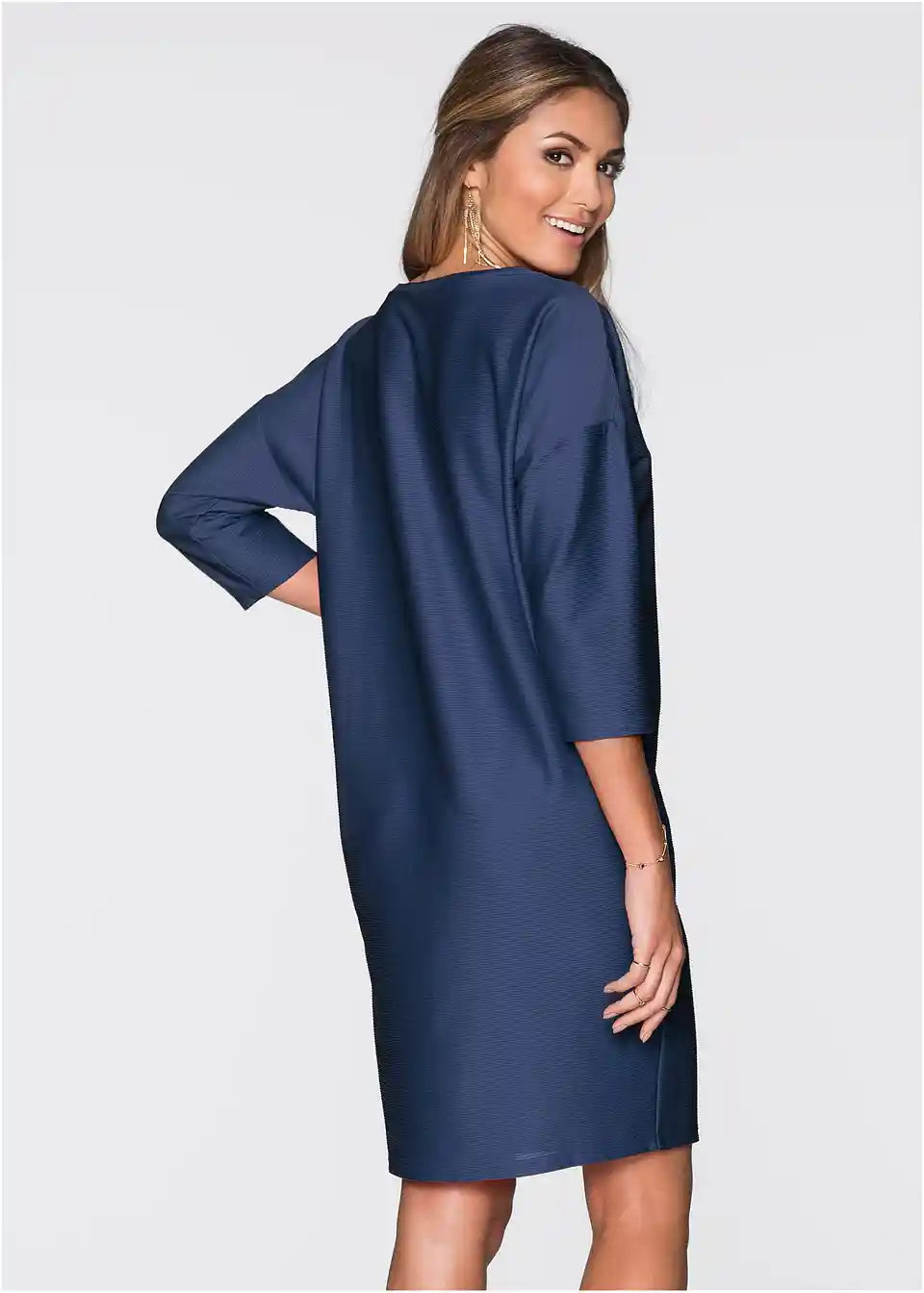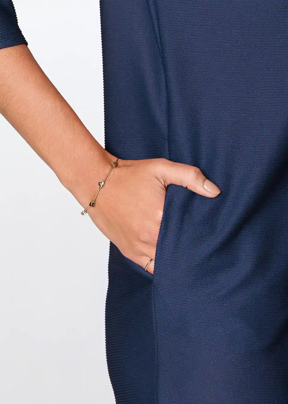 Osnovni videz v jersey strukturi z rebrastim vzorcem. Okrogel izrez, 3/4 rokavi in žepi na straneh. Dolžina pri vel. 40/42 pribl. 96 cm.