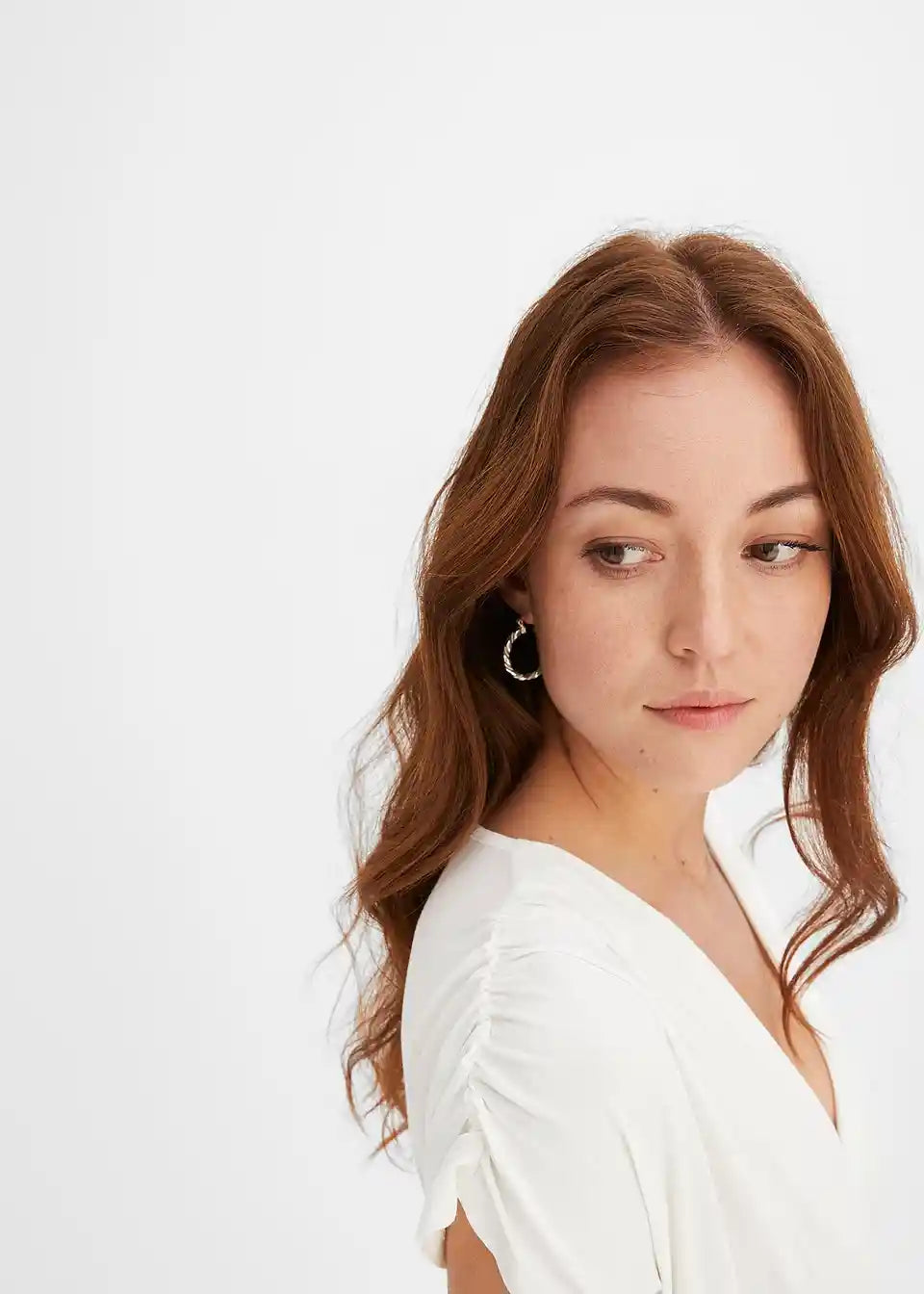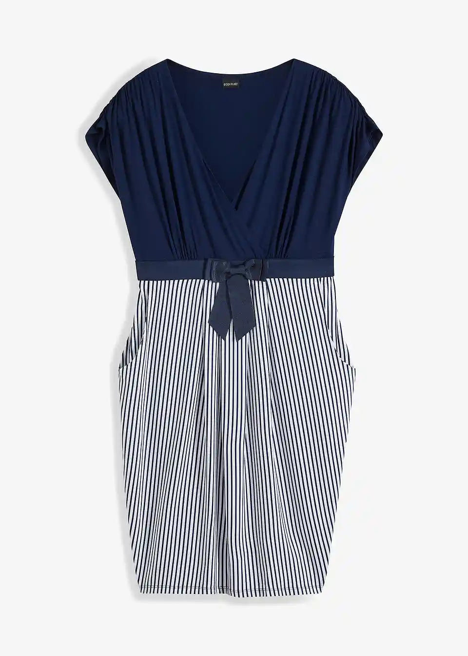 Ta majica obleka znamke BODYFLIRT očara z ženstvenimi detajli. Dvignjen pas in laskav kroj naredita to obleko privlačnega spremljevalca za številne priložnosti. Modni vrhunec je prišit pas s pentljo v barvnem kontrastu, ki obleki doda prefinjen videz in poskrbi za optimalno prileganje. Zgornji del v prekrivnem videzu popolnoma poudari dekolte. Nagubani rokavi in plisiran spodnji del obleke harmonično zaokrožita videz te oprijete privlačne obleke.