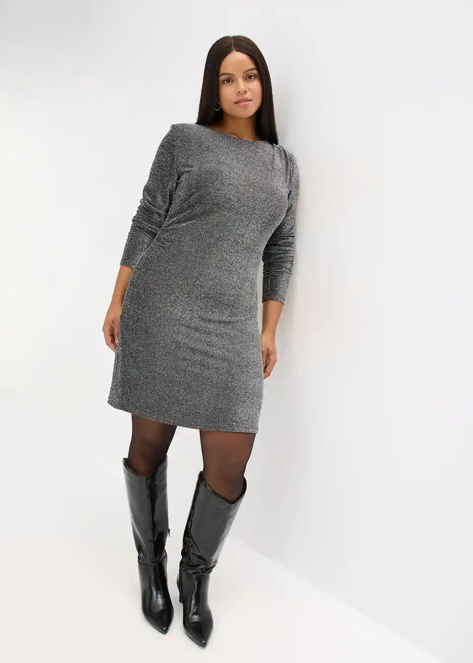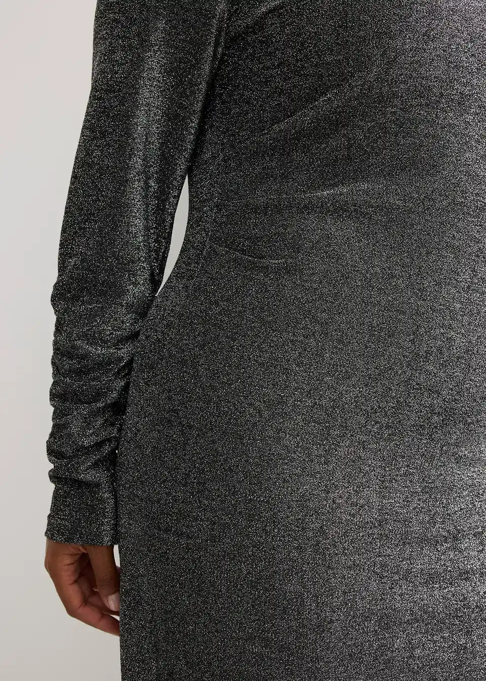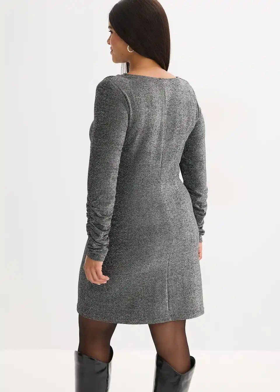 Moderna obleka s poudarjenimi ramami in naborki na rokavih