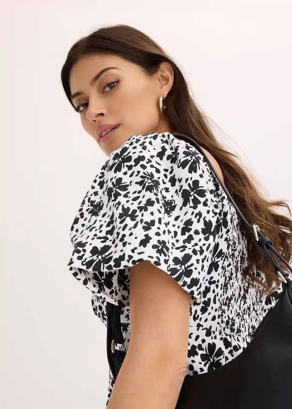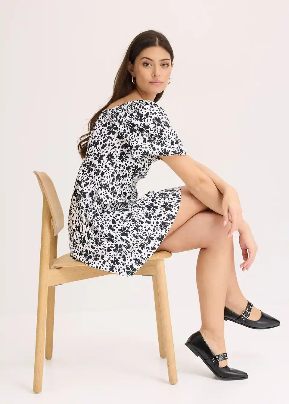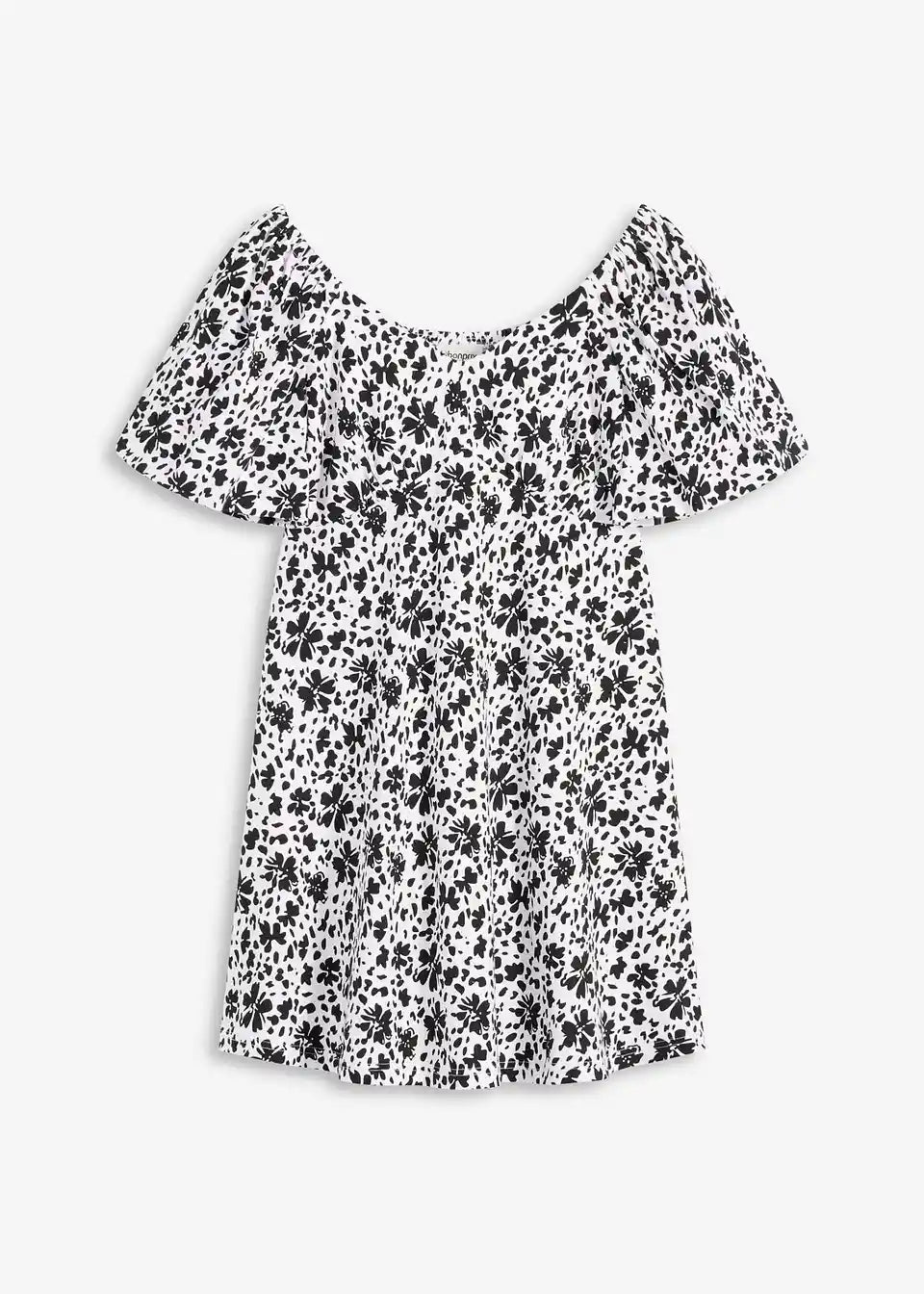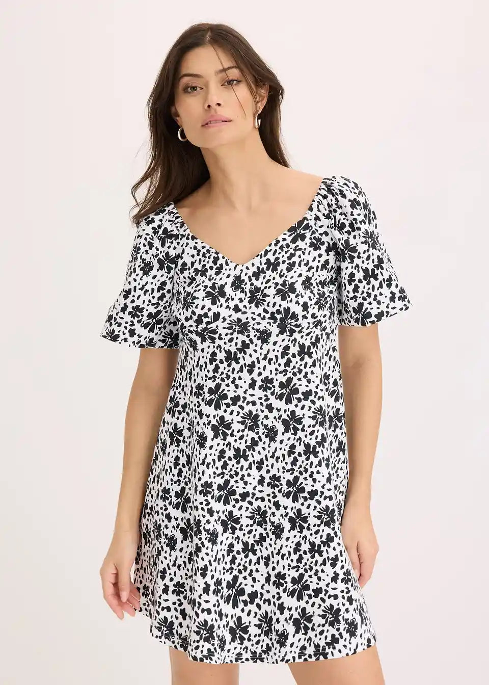 Obleka iz jerseya s srčastim izrezom in napihnjenimi rokavi