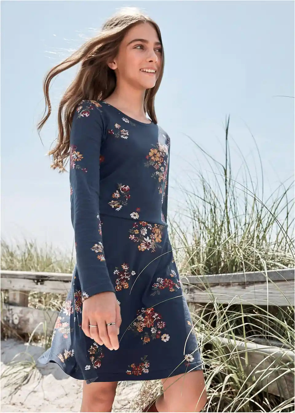 Lepe obleke z dolgimi rokavi in razgibanim krilnim delom za deklice. Prisrčen cvetlični vzorec odlično dopolnjuje dekliški kroj obleke.