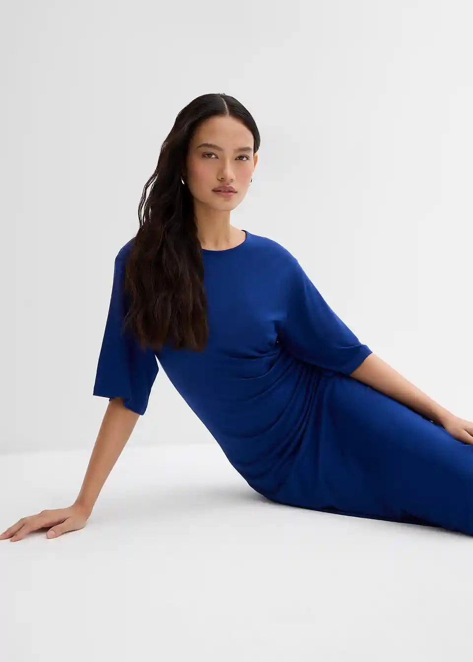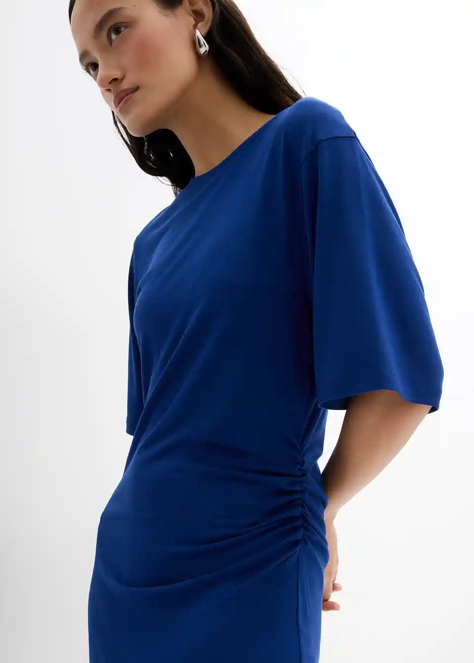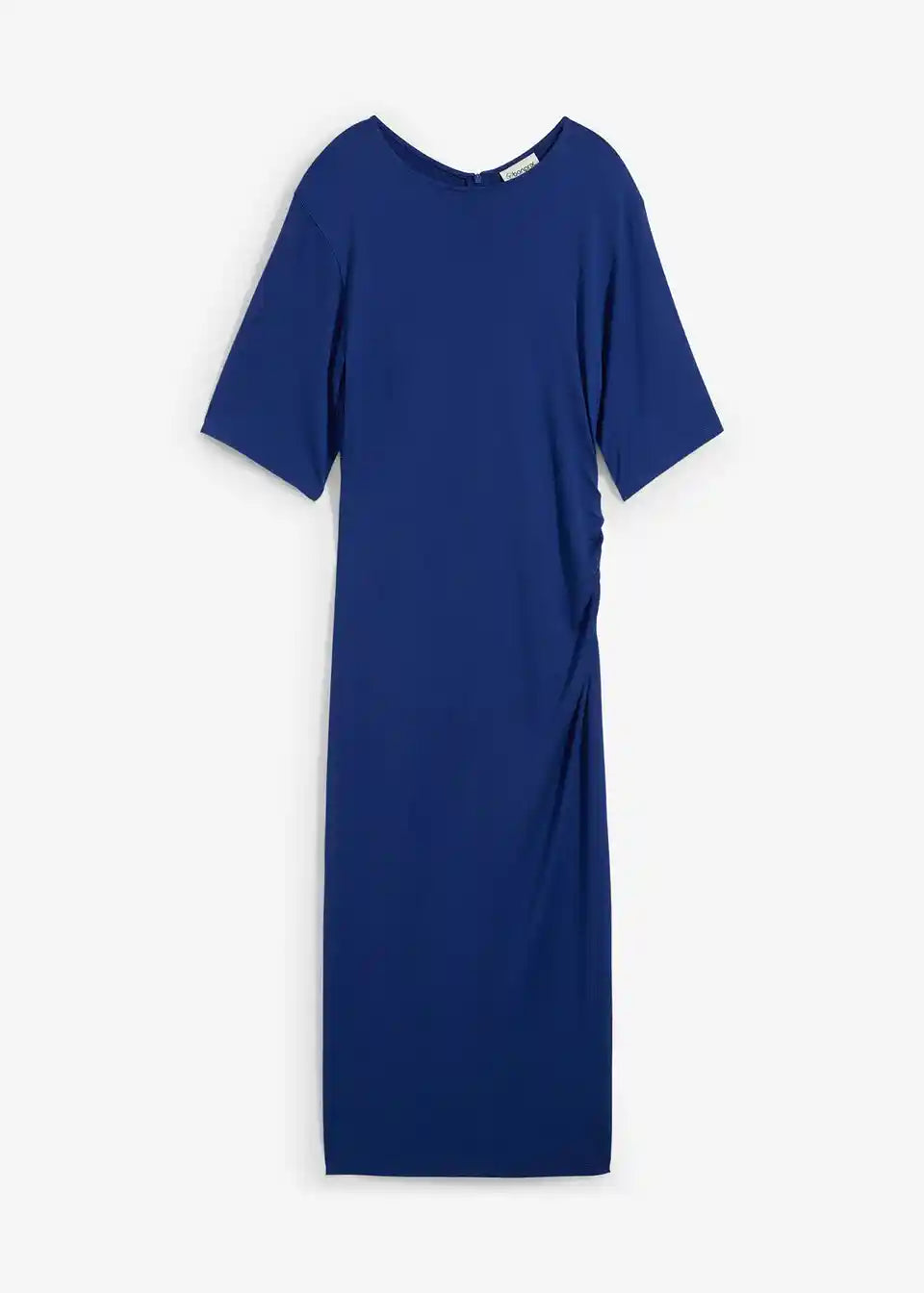 Stransko drapirana srednje dolga obleka z okroglim izrezom in 3/4 rokavi. Skrita zadrga v šivu na hrbtni strani