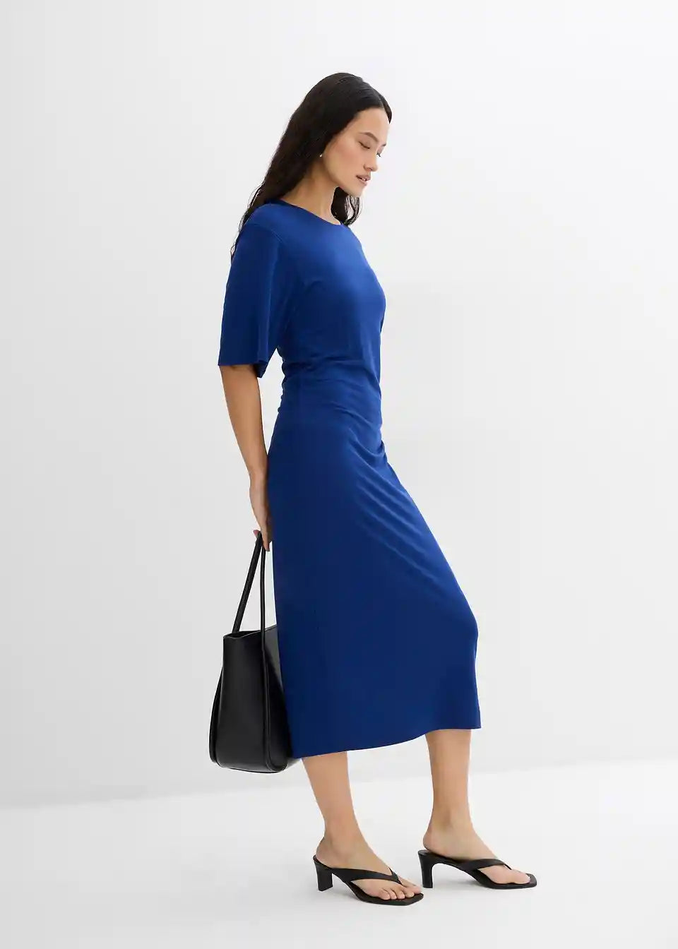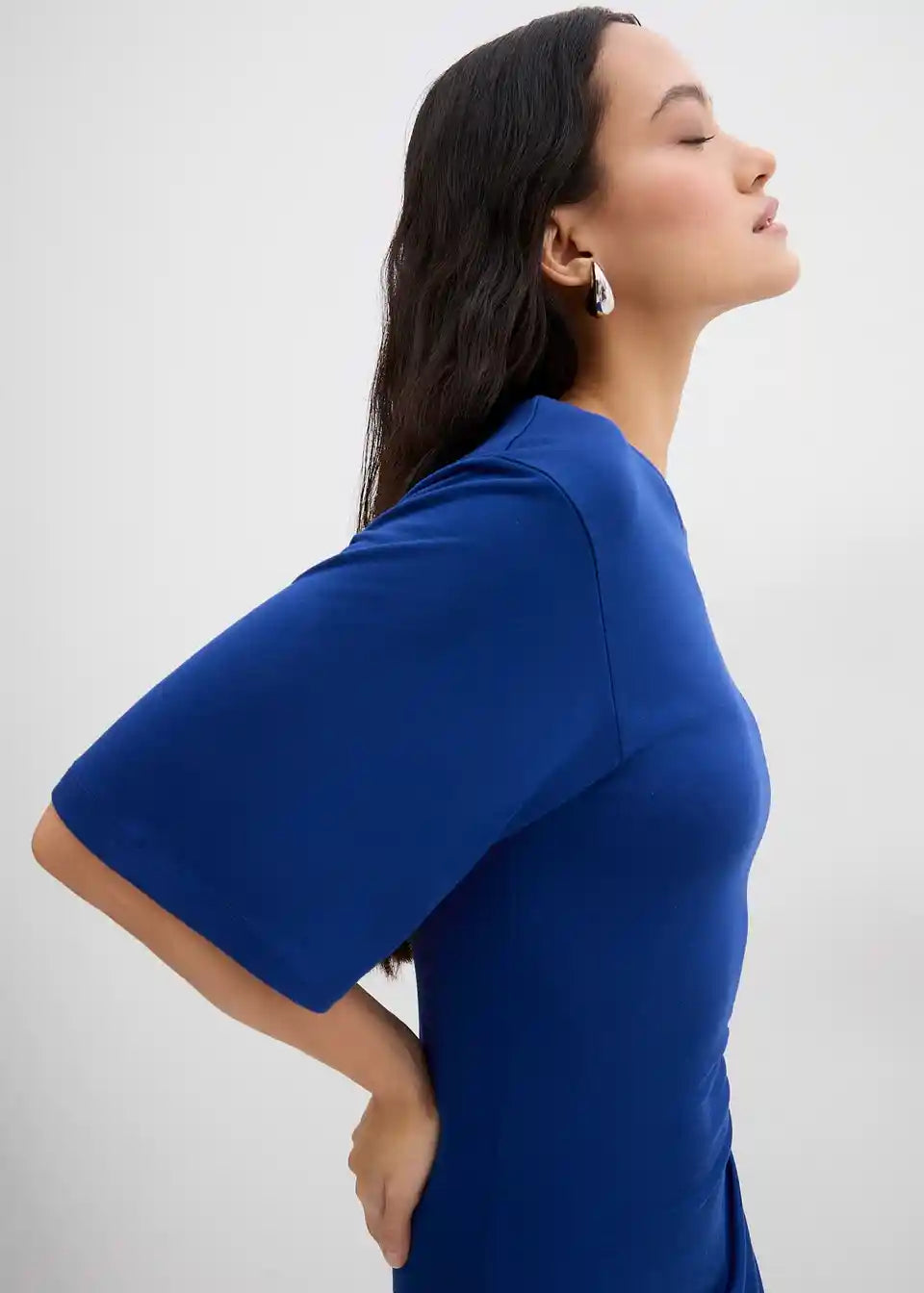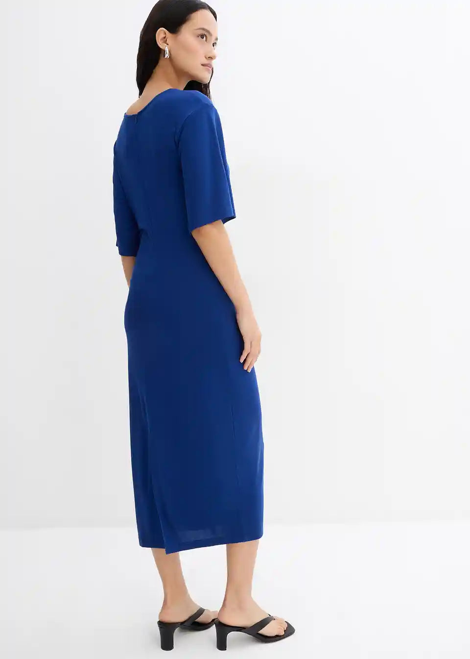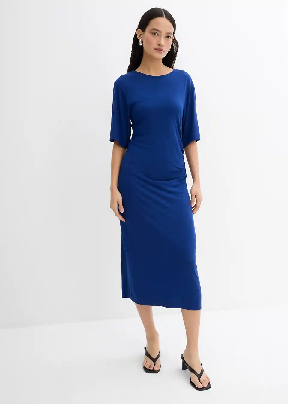 Stransko drapirana srednje dolga obleka z okroglim izrezom in 3/4 rokavi. Skrita zadrga v šivu na hrbtni strani