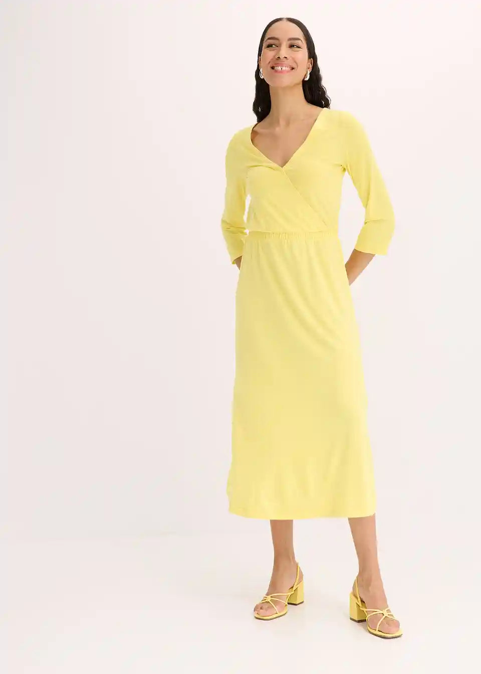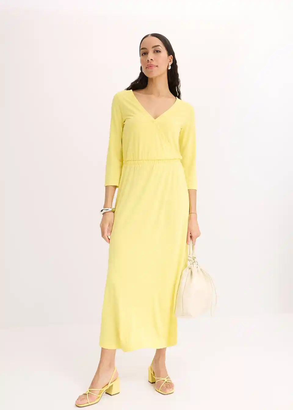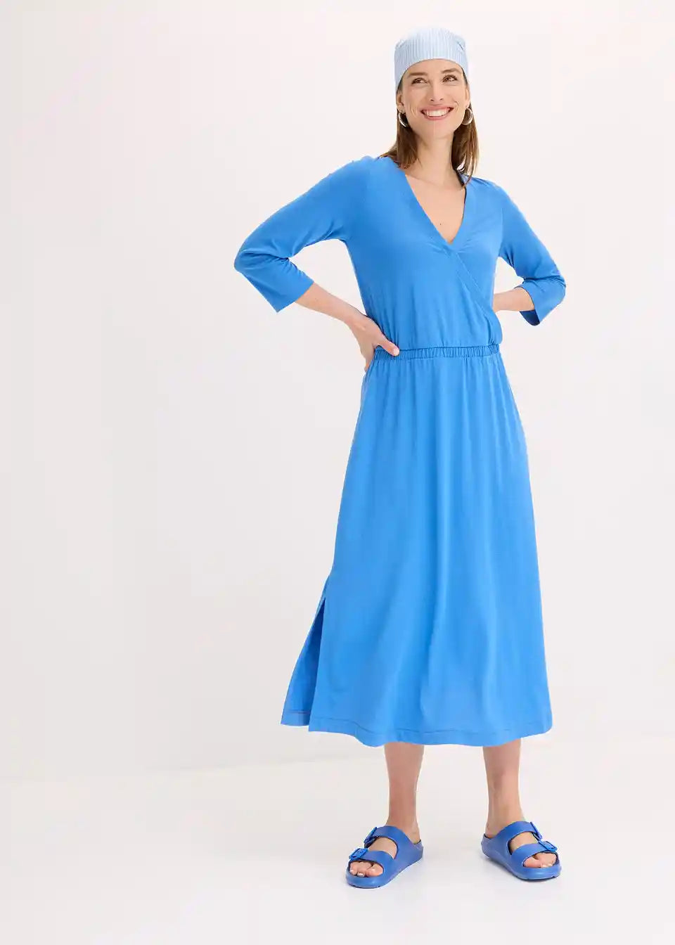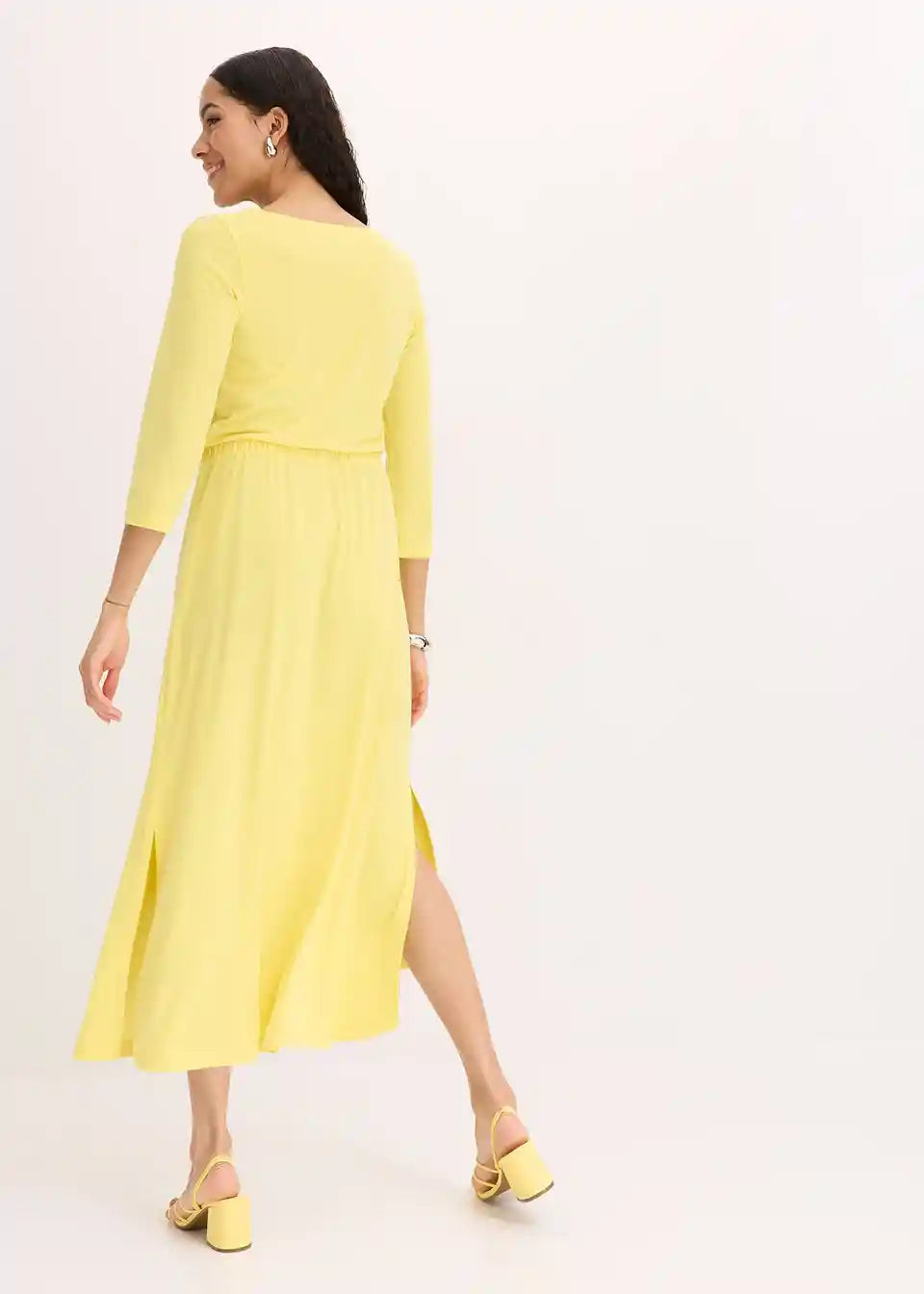 Maksimalna obleka s stranskimi razporki in 3/4 rokavi. Udoben model z V-izrezom in elastiko v pasu.