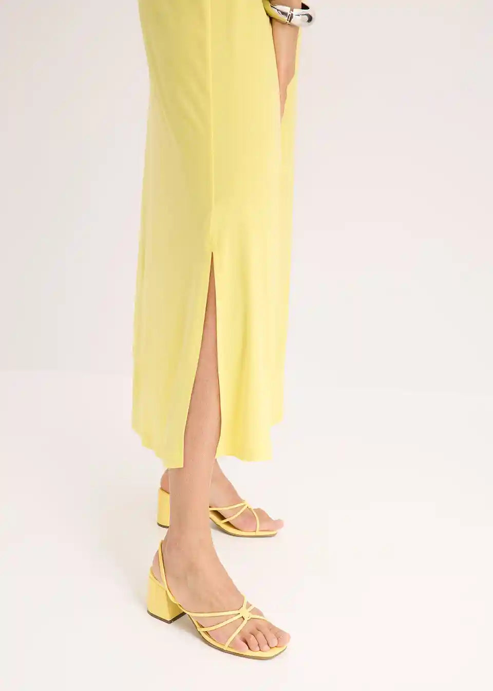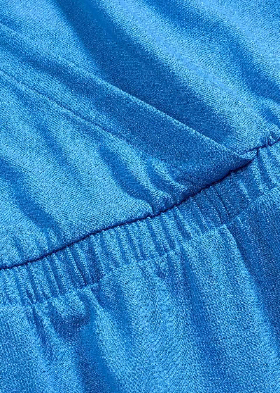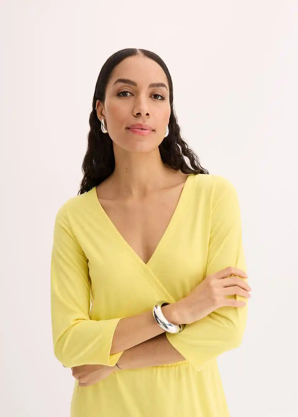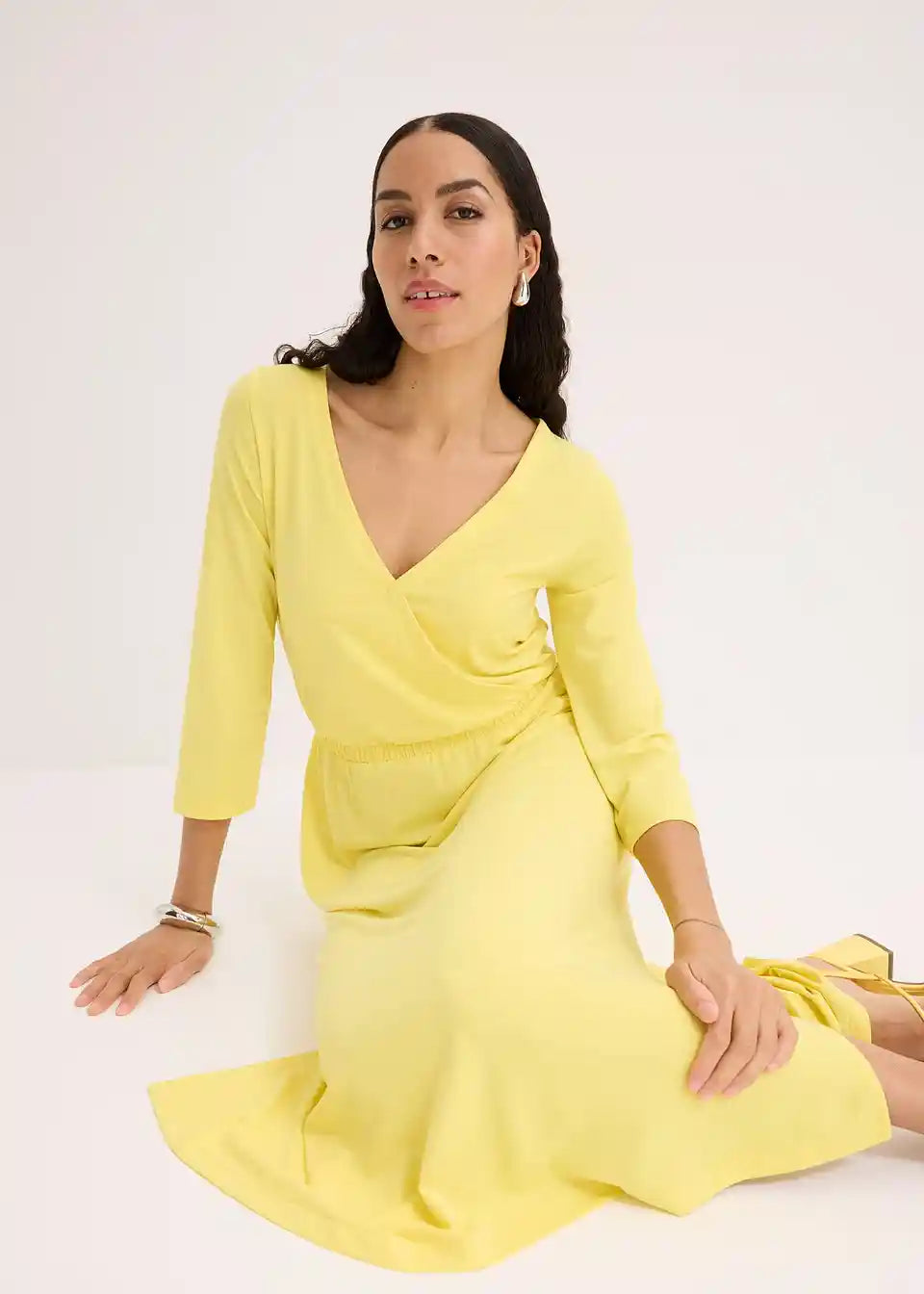 Maksimalna obleka s stranskimi razporki in 3/4 rokavi. Udoben model z V-izrezom in elastiko v pasu.