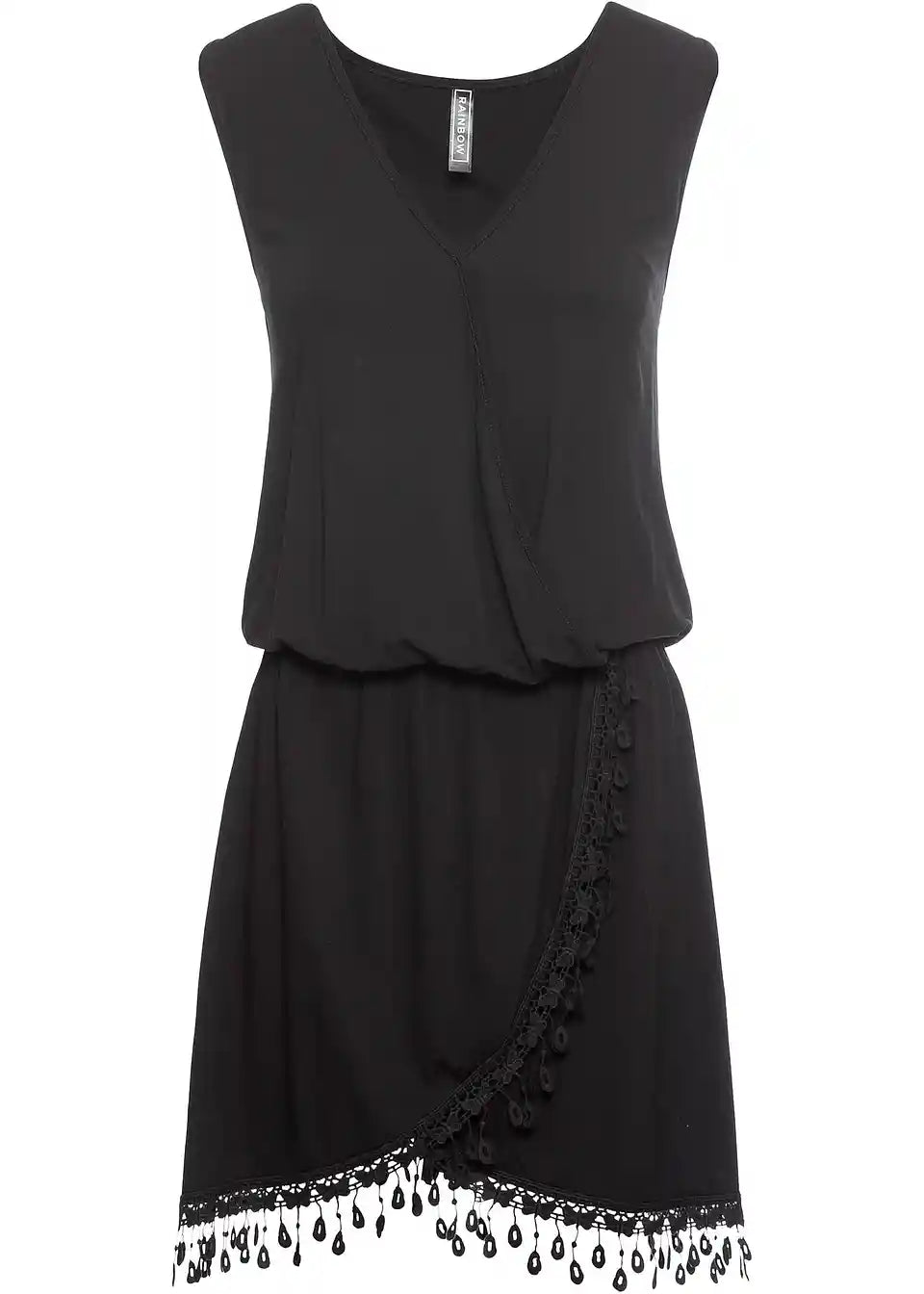 Igriv čipkast rob na kratkem krilu in ovit dizajn so v središču te majice-obleke. Brezrokavni model z V-izrezom je na zgornjem delu ohlapno krojen. Elastični pas poudarja pas. Ta ovita majica-obleka pridobi s pridihom boho stila, ko jo kombinirate z etno zapestnicami in sandaleti z vezalkami. Modni videz lahko ustvarite z izrazitimi gležnjarji in opazno ogrlico.