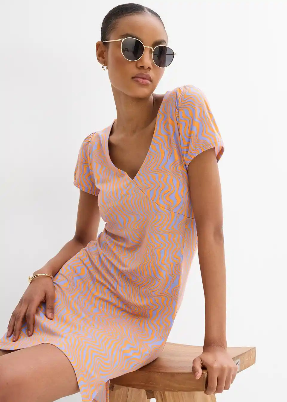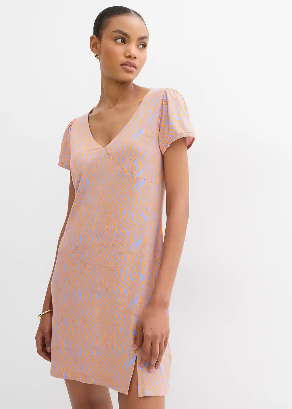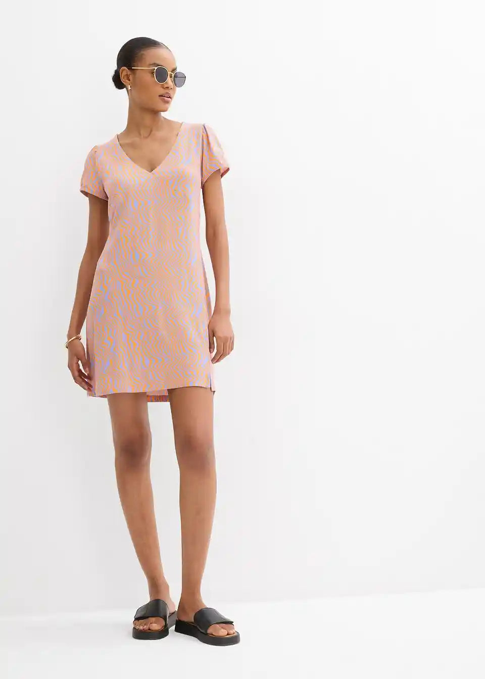 Kratka jersey obleka iz tekoče viskozne mešanice z V-izrezom