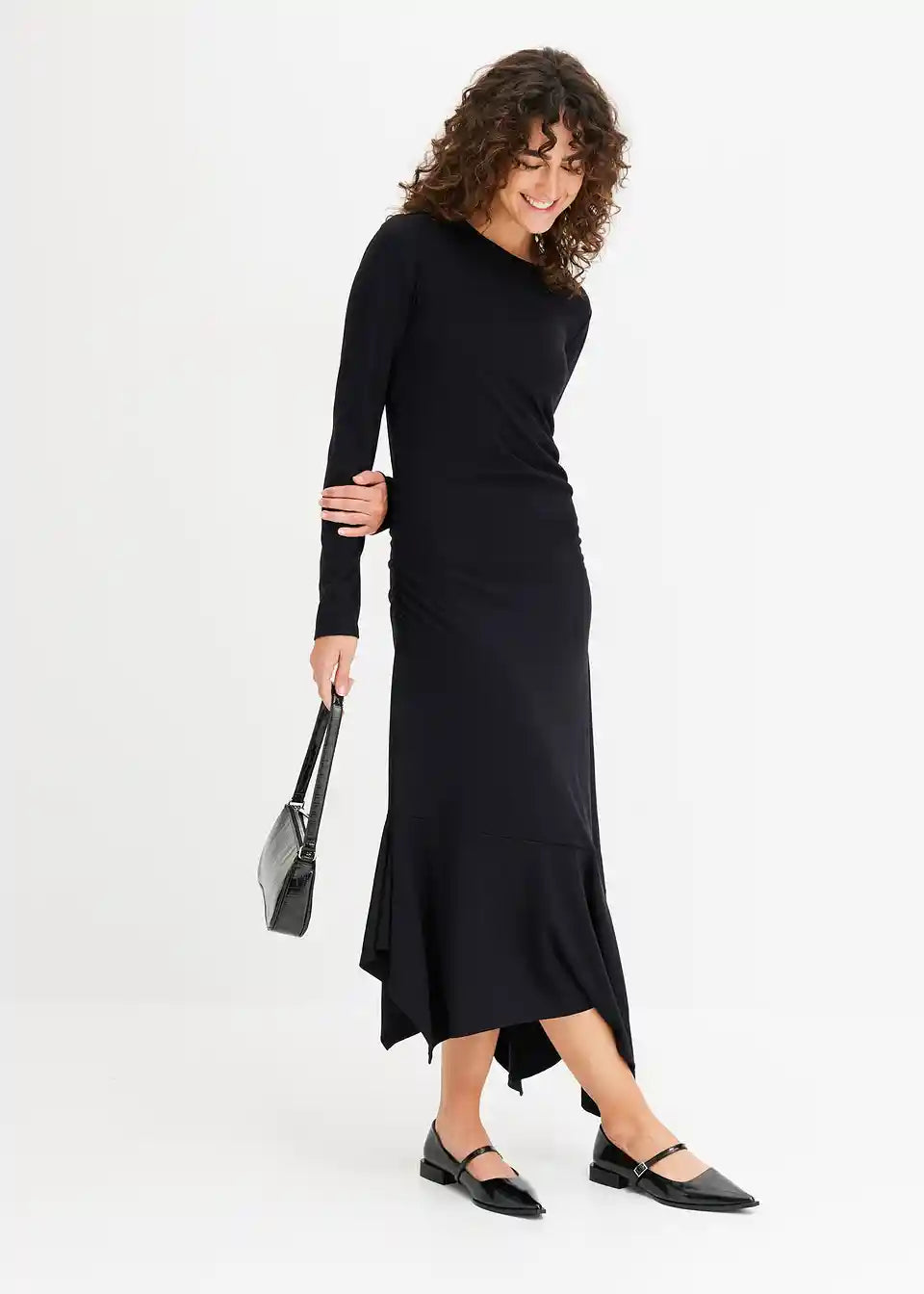 Jersey obleka z asimetričnim robom in dolgimi rokavi
