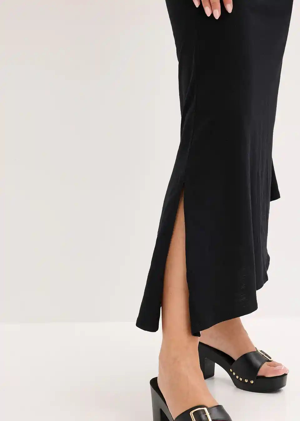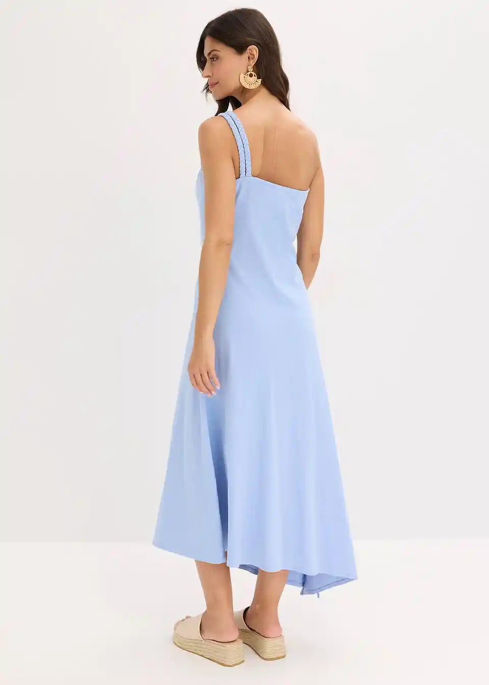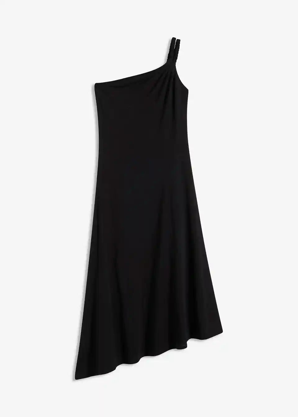 Obleka iz jerseyja z asimetričnim spodnjim robom in detajlom vozla na ramah iz bombaža