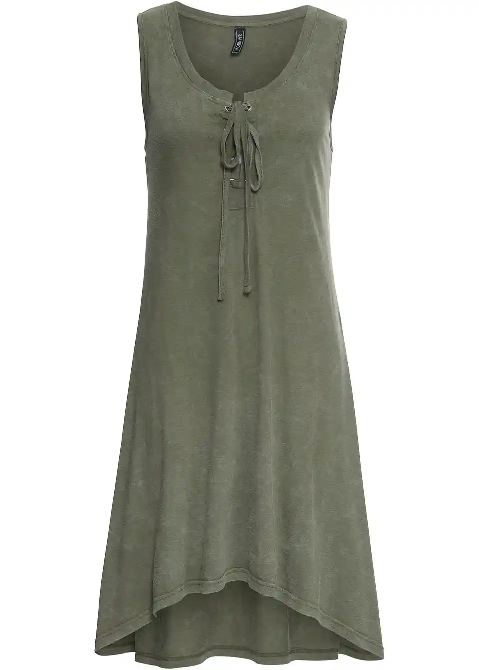Kul najljubši kos je ta trendna majica-oblekca z vezalkami. Razširjen rob do kolen segajočega modela je spredaj krajši v modnem Vokuhila videzu. Globok okrogel izrez se konča z dolgim razporkom na sprednji sredini. Ta se lahko s pomočjo dolge vezalke prilagodi in spremeni v prefinjen V-izrez. Velike luknje, skozi katere je speljan vezalni trak, dajejo trendni obleki rockovski pridih.