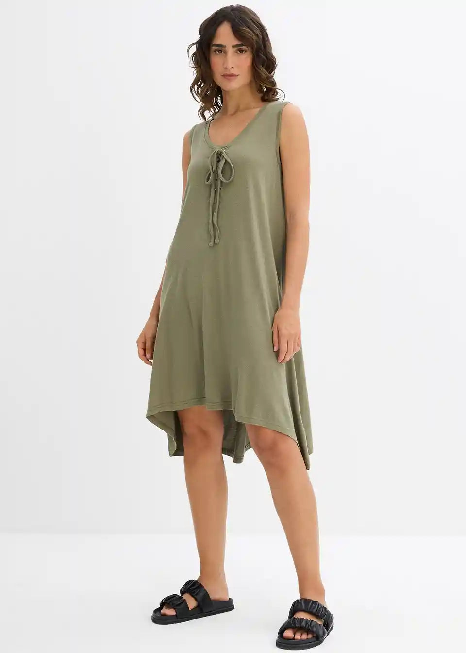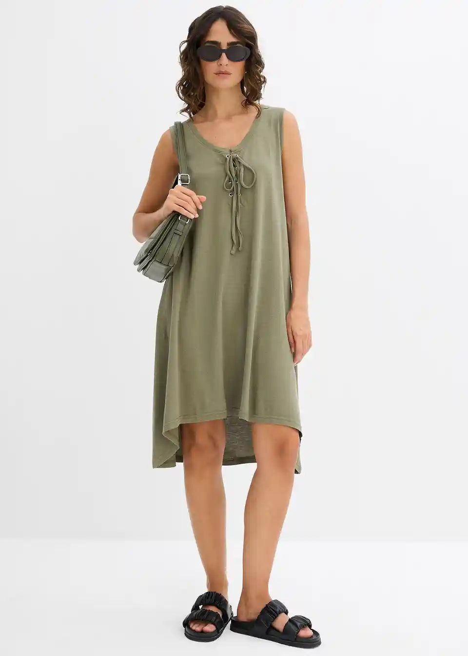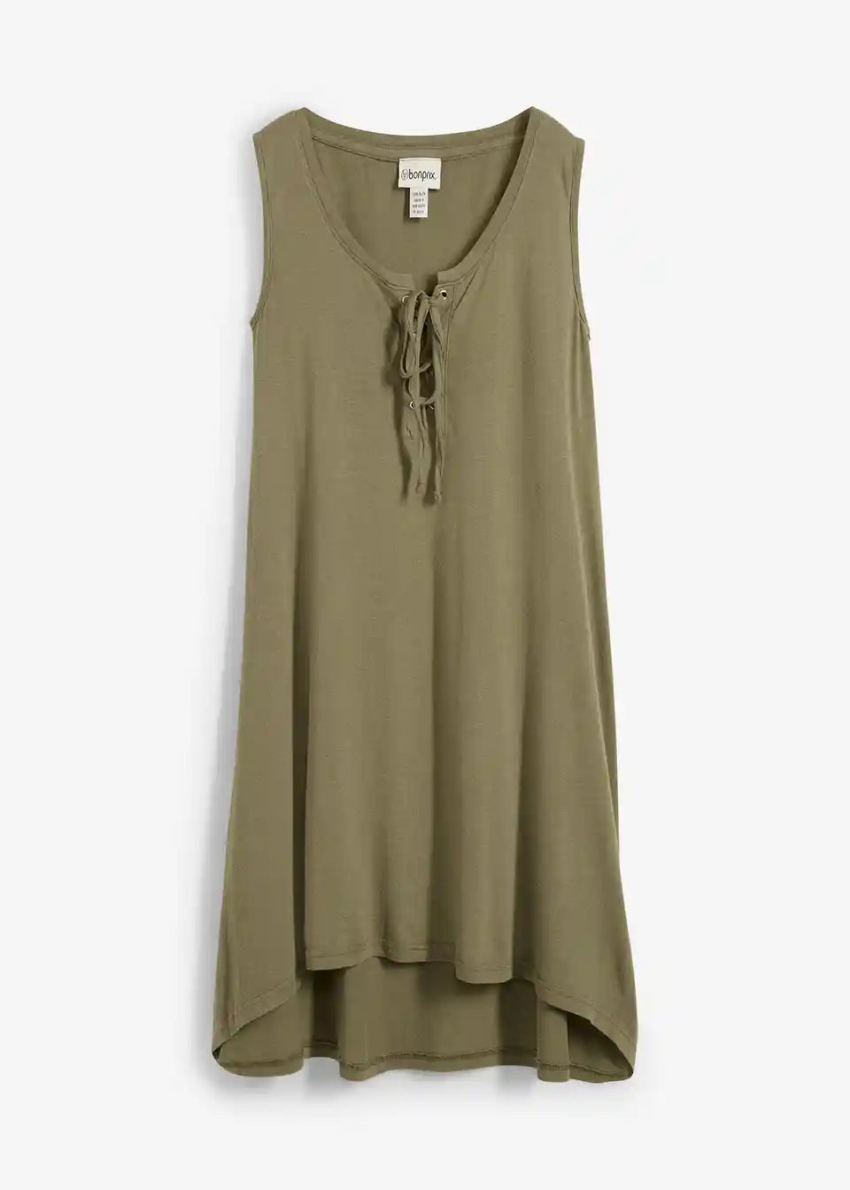 Ta trendna majica-obleka z vezalko je kul najljubši kos. Razširjen rob modela, ki sega do kolen, je v modnem Vokuhila videzu spredaj krajši kroj. Globok okrogel izrez se končuje z dolgim razporkom na sredini spredaj. Ta se lahko s pomočjo dolge vrvice poljubno prilagodi v širino in spremeni v prefinjen V-izrez. Velike obročke, skozi katere je napeljana vrvica, obleki dodajo rokerski pridih.