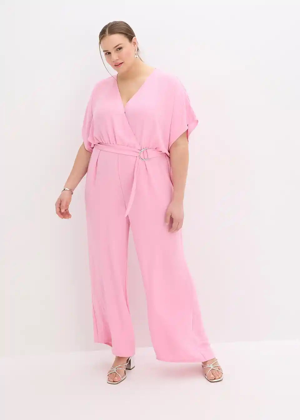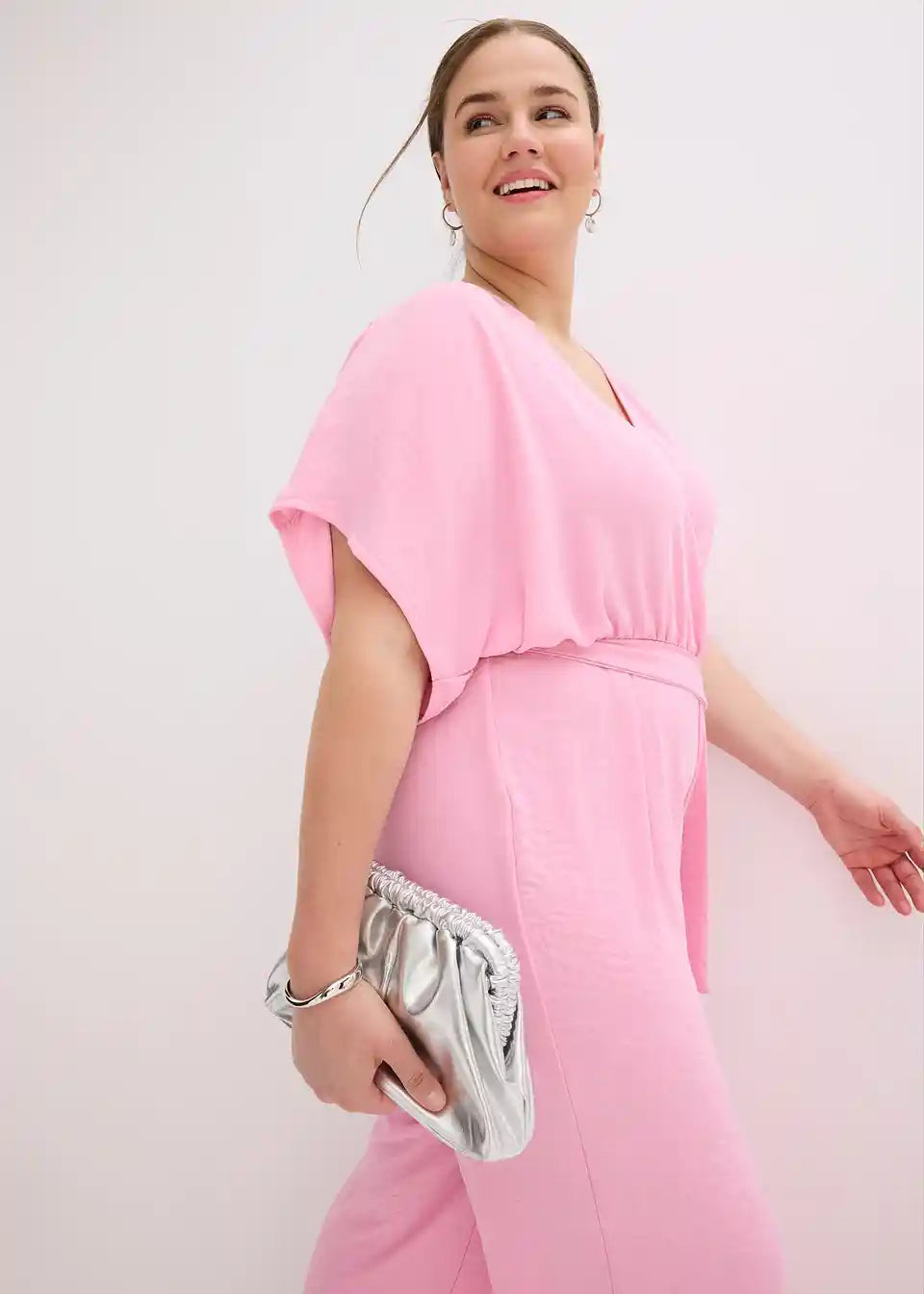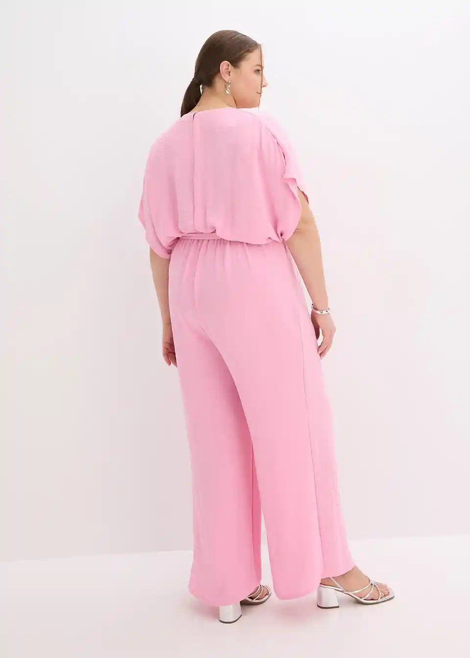 Ohlapno krojen jumpsuit z modnim detajlom zavezovanja v pasu in gumbom na zadnji strani izreza